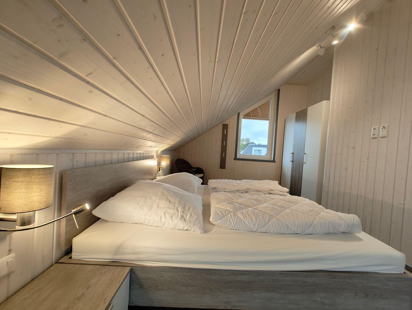 Das Ferienhaus im skandinavischen Stil bietet Platz für bis zu 4 Personen auf zwei Etage mit 2 Schlafzimmern, Wohn-/Essbereich, Einbauküche, Badezimmer mit Sauna, Terrasse und Pkw-Stellplatz.