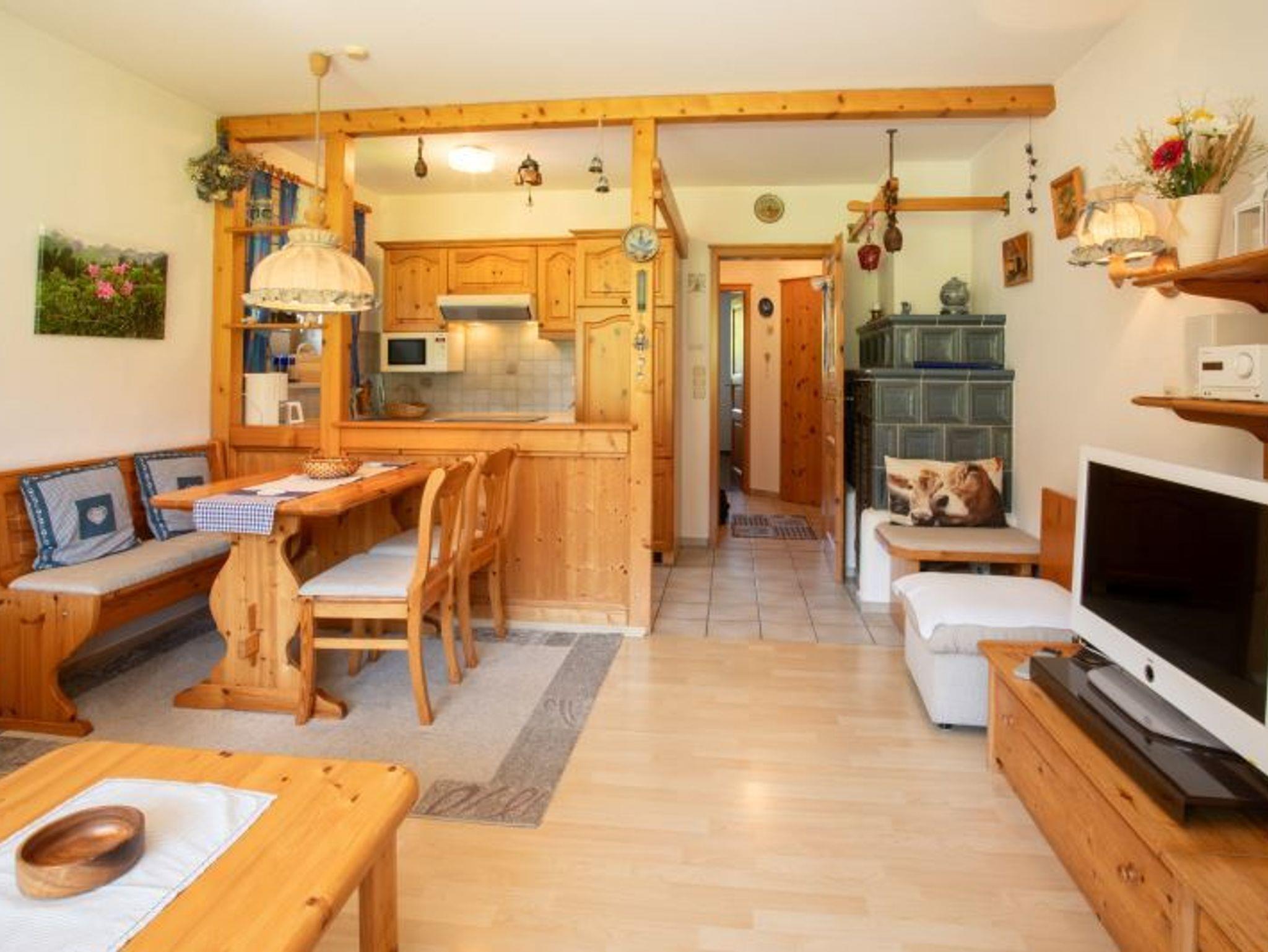 Die Ferienwohnung verfügt über einen ebenerdigen Eingang sowie einen sonnigen Südbalkon mit Balkonmöbeln. Das Wohnzimmer ist im gemütlichen Allgäuer Stil eingerichtet und bietet eine ausziehbare Couchgarnitur, eine Essgruppe, einen traditionellen Kachelofen mit Ofenbank sowie Kabelfernsehen, Flachbild-TV, WLAN und eine moderne Stereoanlage.