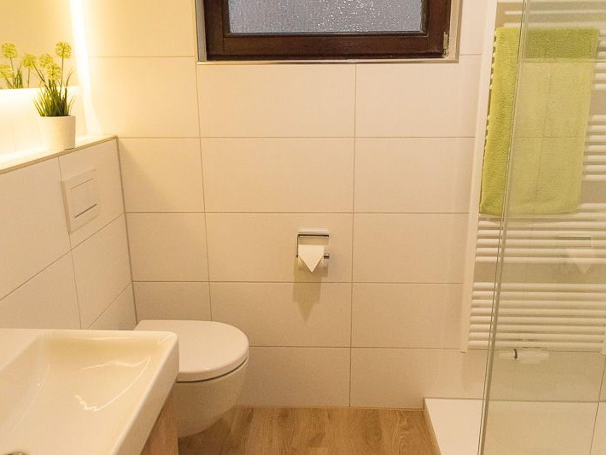 - ein komplett modernisiertes Bad mit begehbarer Dusche, großem Waschtisch mit Unterschrank, Handtuchheizkörper, Föhn.
