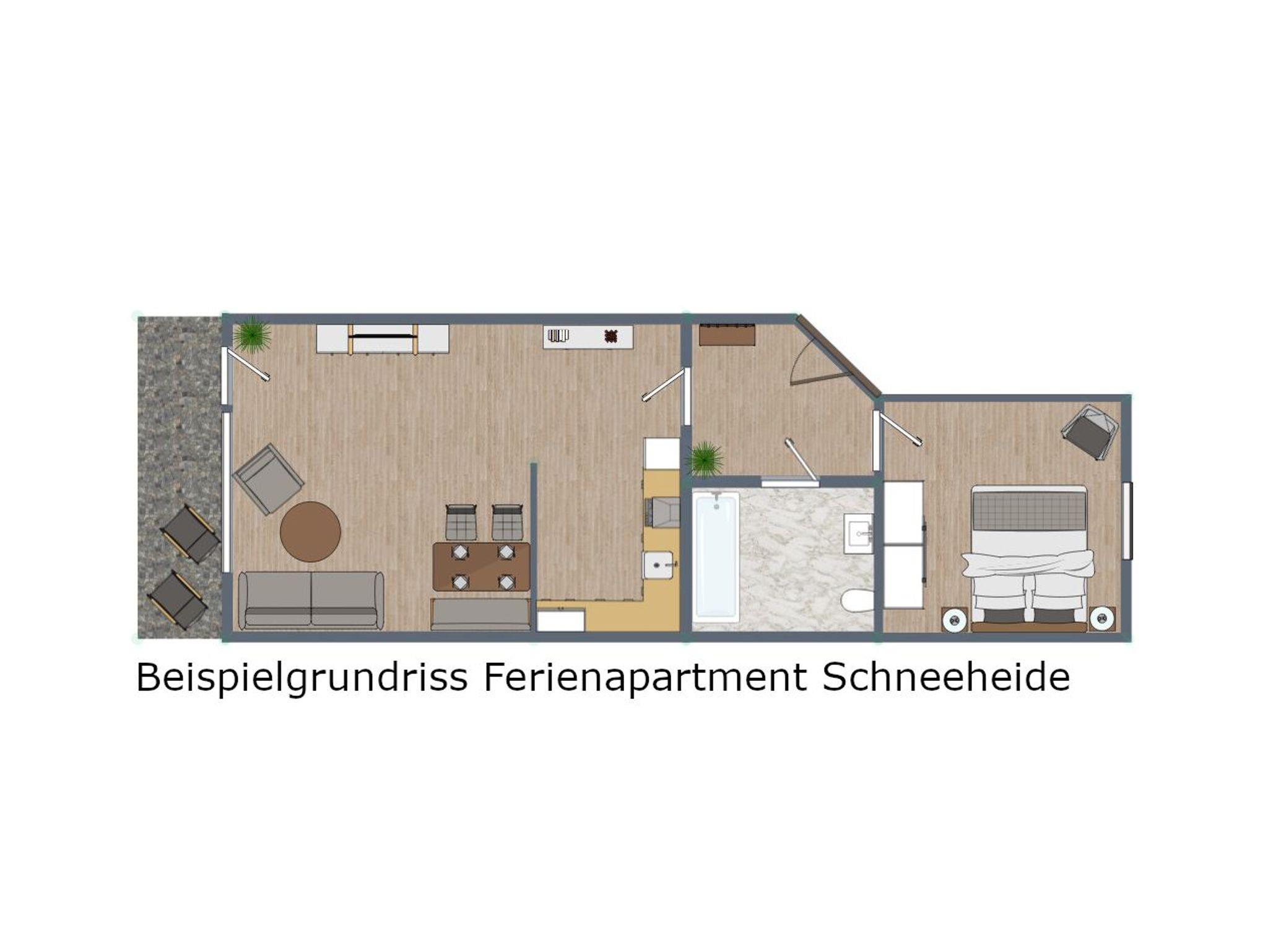 Die Wohnung im Landhausstil besteht aus zwei Zimmern ? einem Wohn-Esszimmer mit offener Küche und einem Schlafzimmer ? sowie einem Badezimmer. Der Wohnbereich verfügt über einen direkten Zugang zum Balkon. Dort stehen in den Sommermonaten Sonnenschirm, Stühle und Liegestühle bereit.