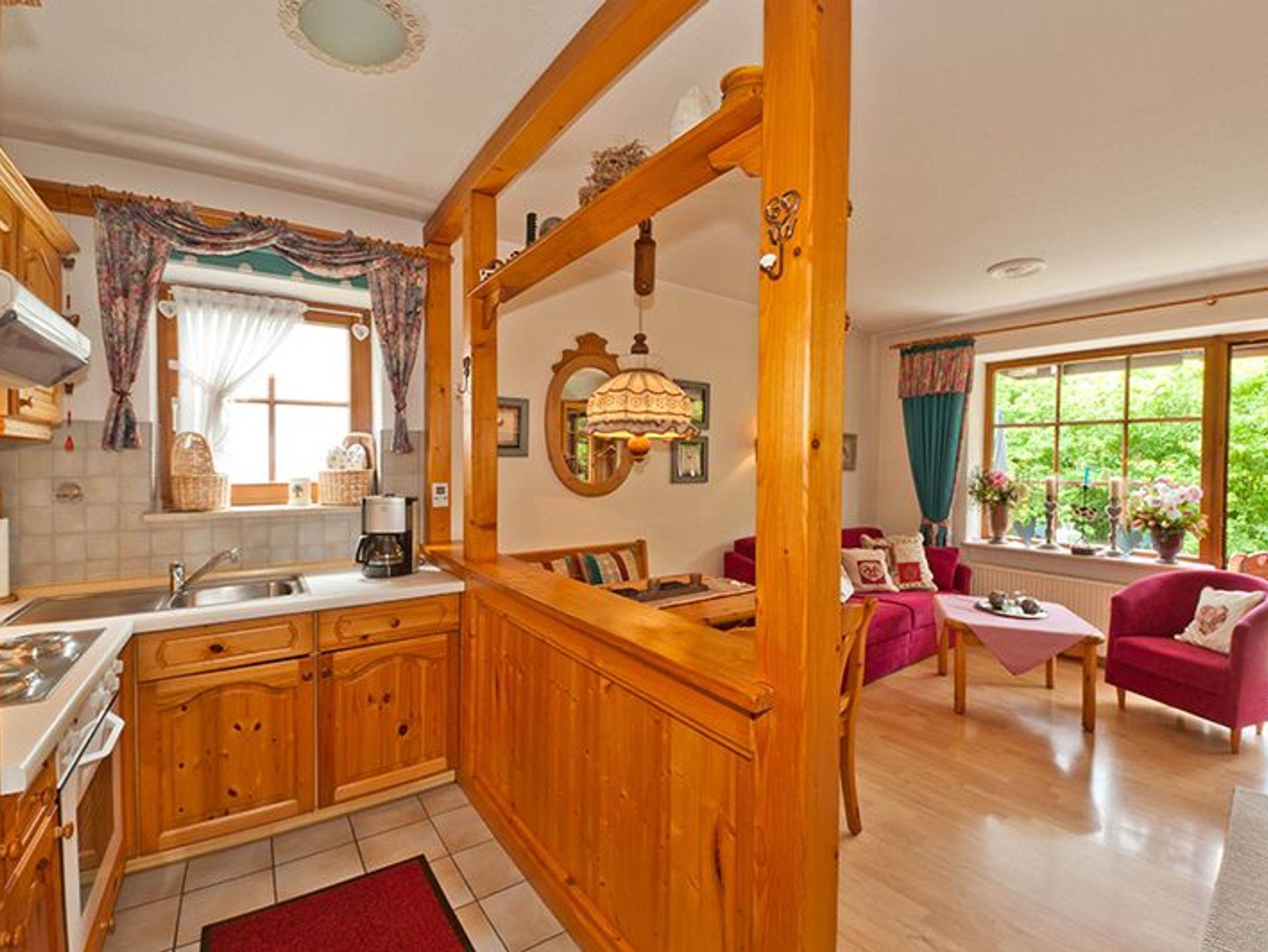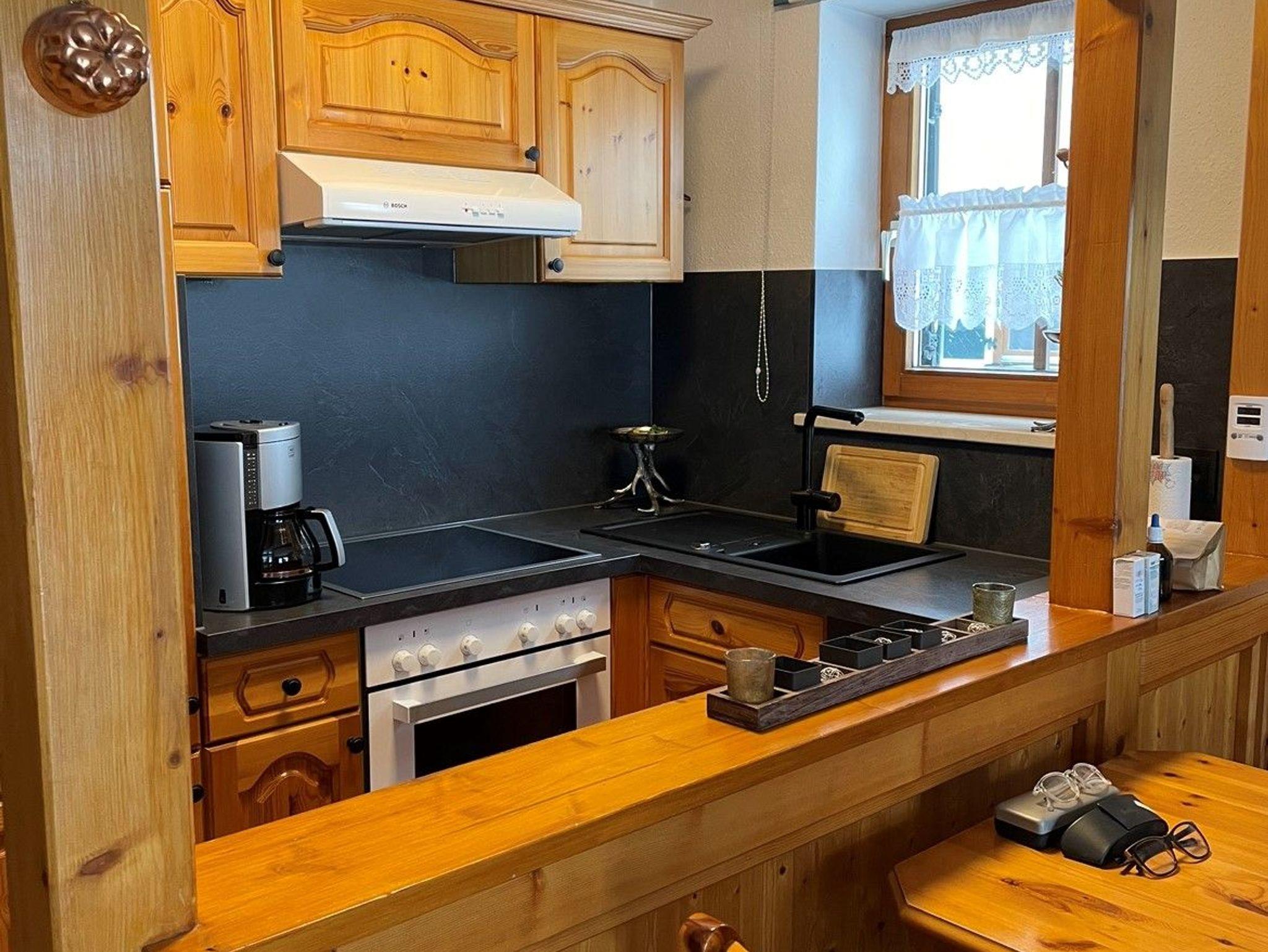 Die offene Küche wurde neu renoviert und umfasst einen Elektroherd mit Backofen, Kühlschrank mit Gefrierfach, Kaffeemaschine, Toaster, elektrische Brotschneidemaschine sowie reichlich Geschirr und Besteck. Eine neue Geschirrspülmaschine ergänzt die Ausstattung.