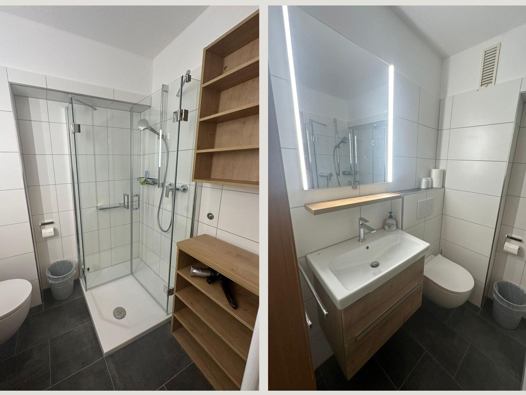 Zur weiteren Ausstattung gehören eine Diele mit Garderobe, ein Badezimmer mit Dusche/WC, Haartrockner und Rasierspiegel sowie ein Schlafzimmer mit Doppelbett und Minisafe. Der Balkon ist mit vier Stühlen, Tisch, Sonnenschirmen und einem Wäscheständer möbliert. Ein Pkw-Abstellplatz steht zur Verfügung.