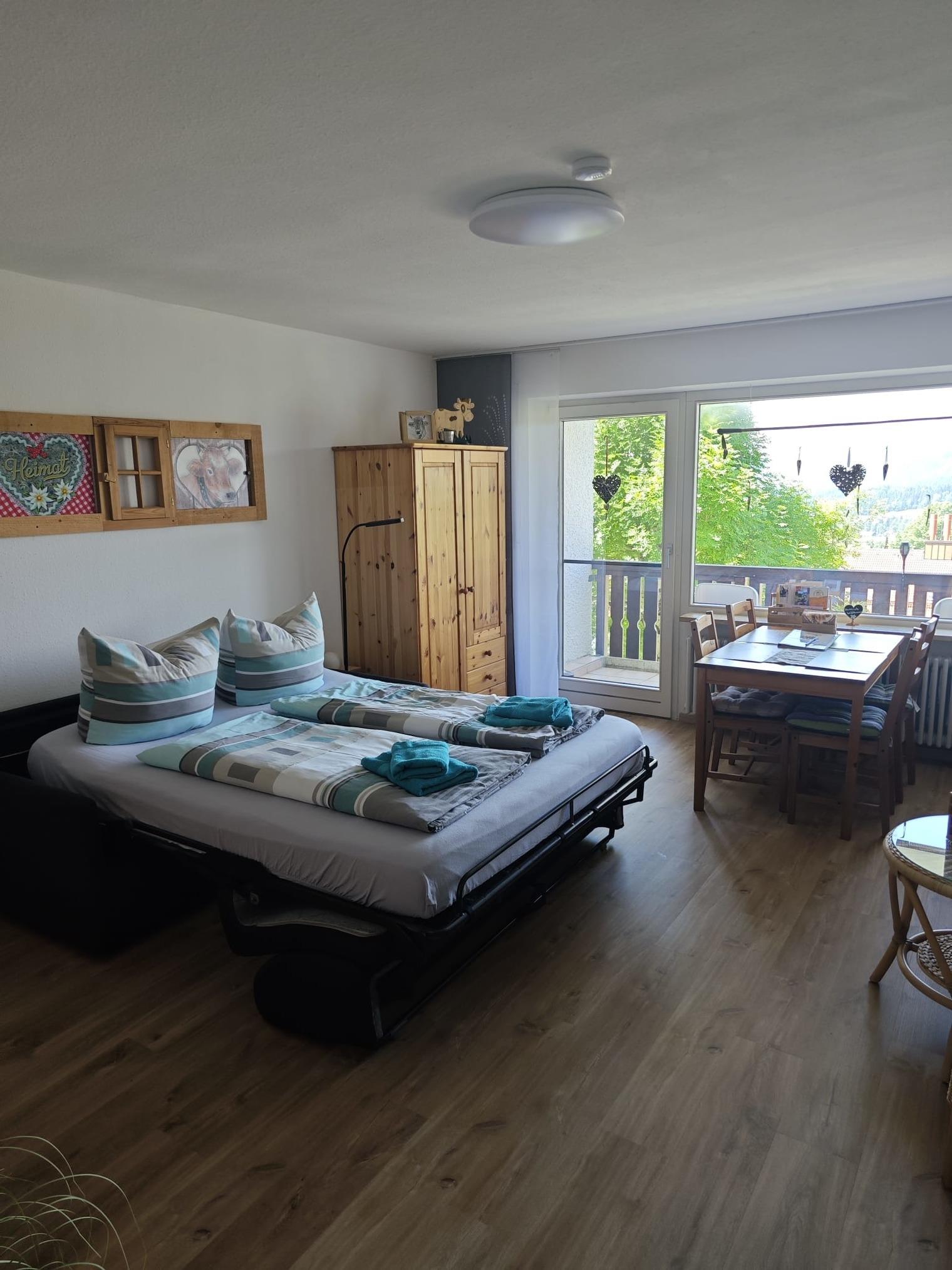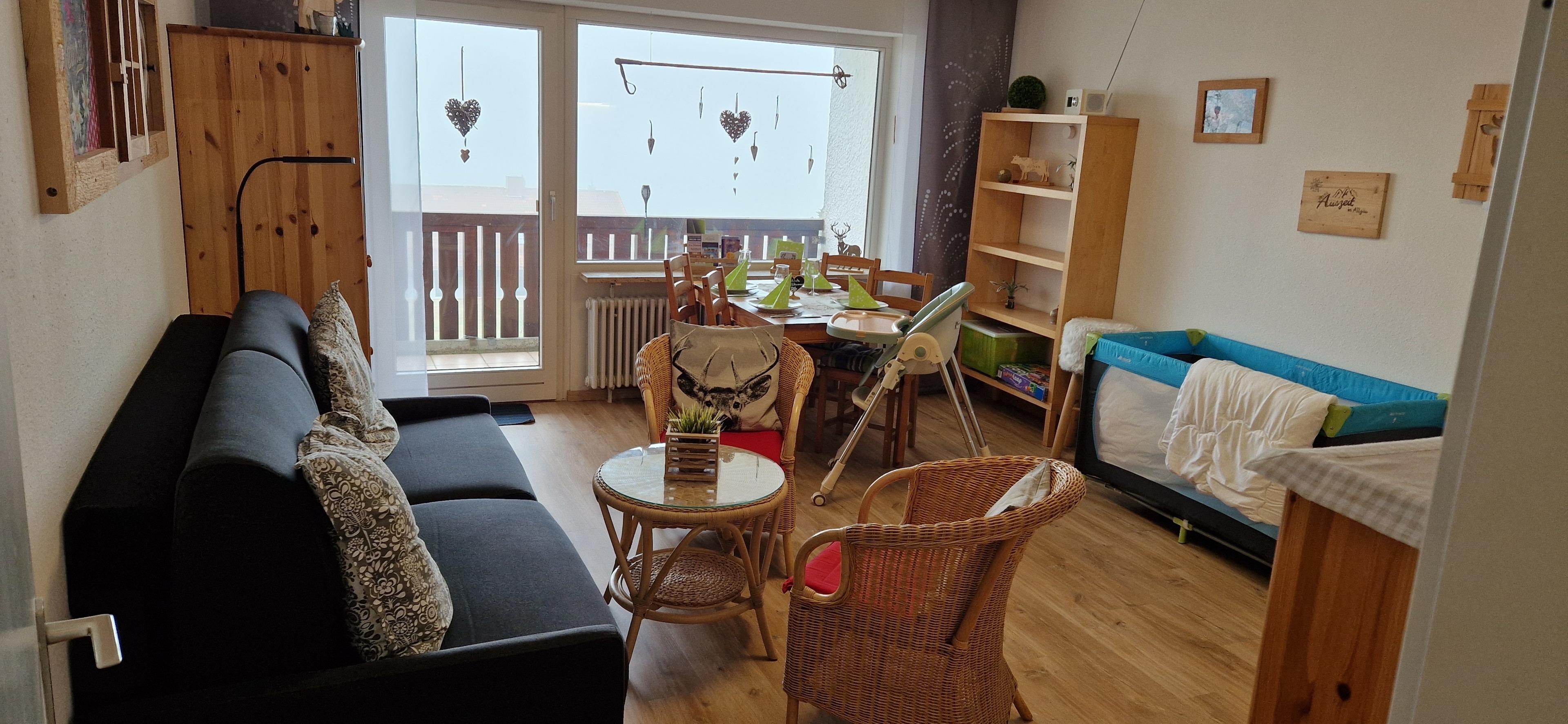 Schönes 2 Zimmer Appartement 45m² im Ferienpark Oberallgäu in Wilhams für 4 Personen im Erdgeschoss mit Balkon. Das Hallenschwimmbad (14x8 m) ist täglich von 09:00-22:00 Uhr geöffnet, die Sauna kann täglich von 16:00-22:00 Uhr (kostenpflichtig) genutzt werden. Spielplätze, Wanderwege, Badeseen in der Nähe. Schöner Ausblick zur Skipiste und Skiloipe.