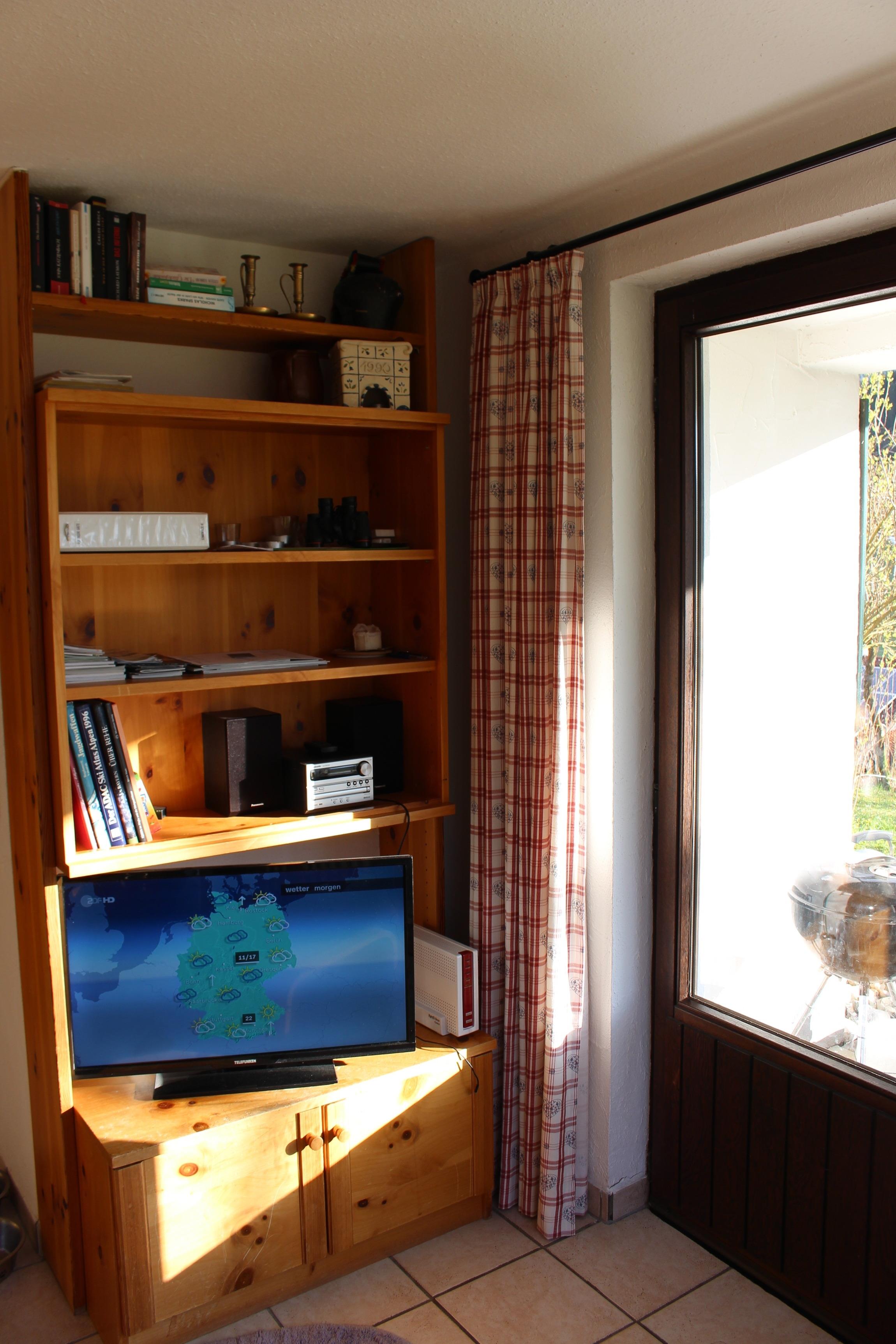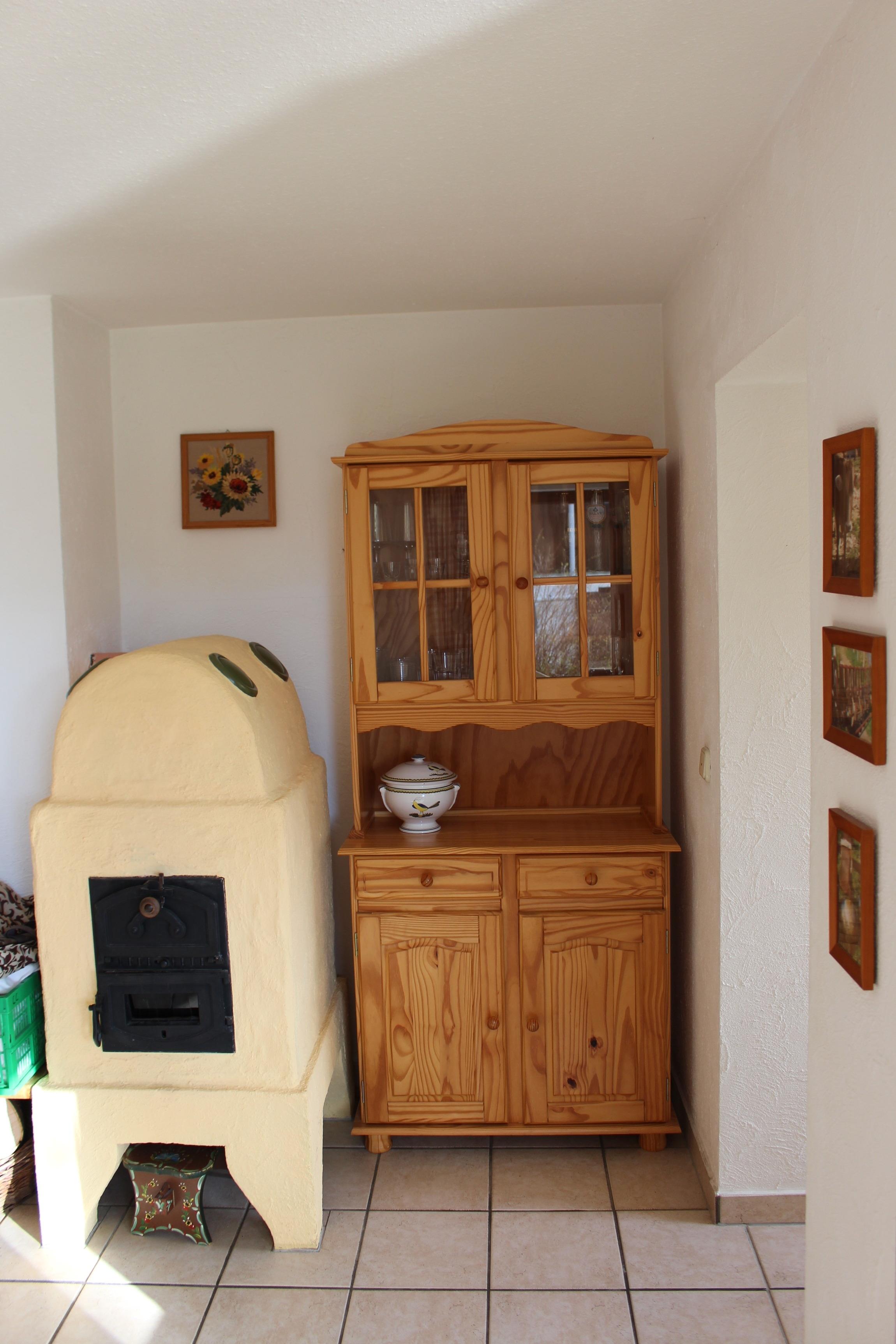Vom Flur gelangst du über eine Treppe ins Untergeschoß mit Ausgang auf die Terrasse und in den Garten. Im UG befindet sich eine zweckmäßige kleine Küche mit Cerankochfeld, Kühleschrank mit TK, Spüle, ausreichend mit Geschirr und Kochgeschirr ausgestattet. Toaster, Wasserkocher, Kaffemaschine sind natürlich auch vorhanden.
