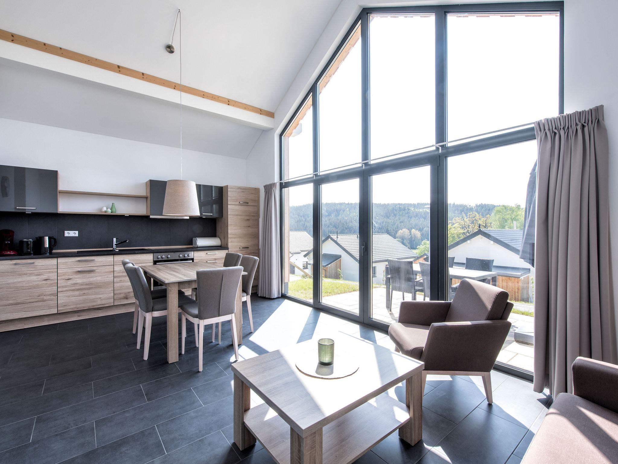 Alle Ferienhäuser des Feriendorfes an der Therme Obernsees sind mit einem hochwertigen möblierten Wohn- und Esszimmer, einer gemütlichen ausziehbaren Sitz- und Schlafcouch sowie einer top ausgestatteten Küche eingerichtet.