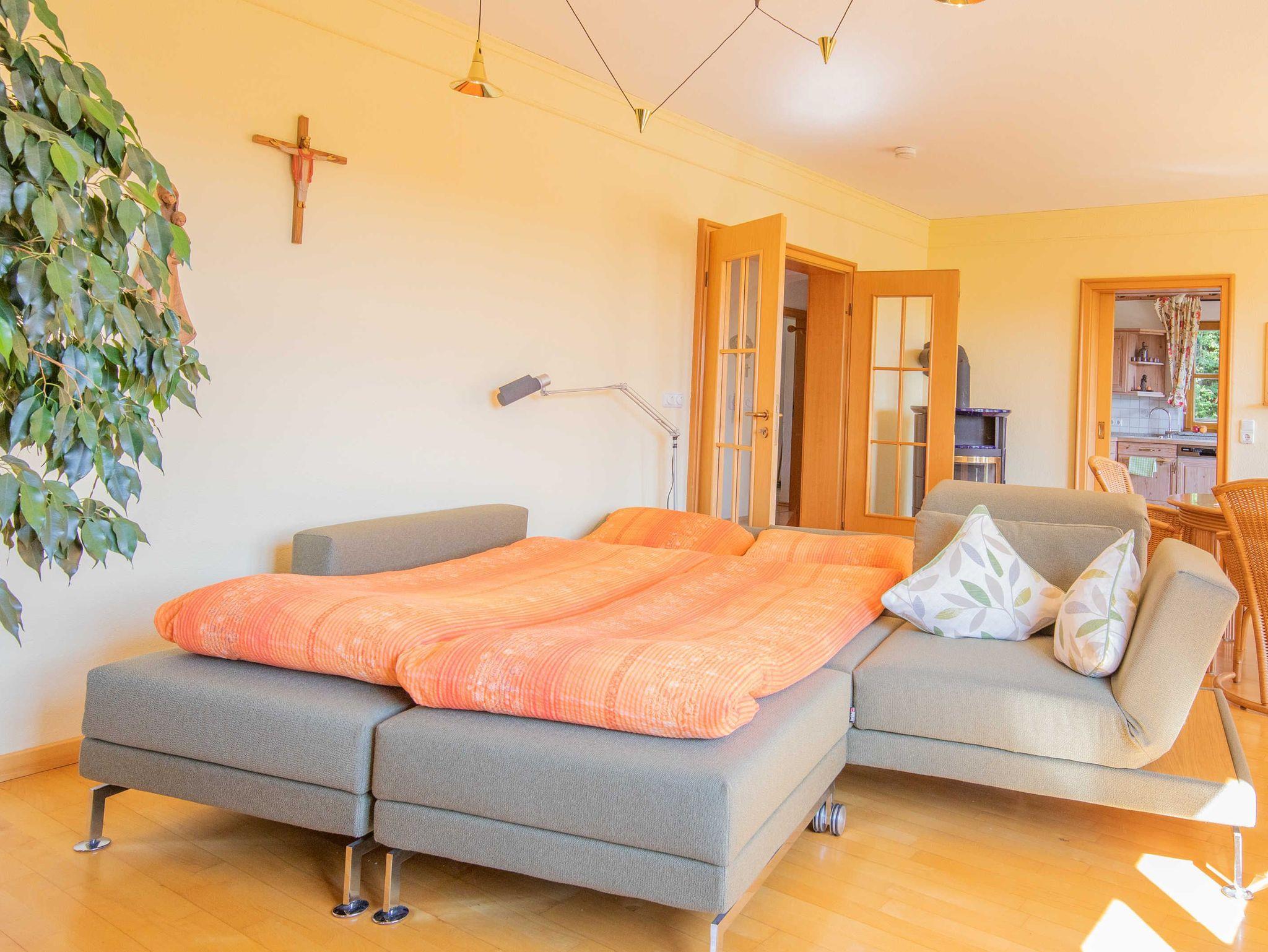 Großzügiges Wohnzimmer mit integriertem Essbereich für bis zu 6 Personen sowie Hochstuhl für das Kleinkind, Sat-TV, WLAN inklusive.