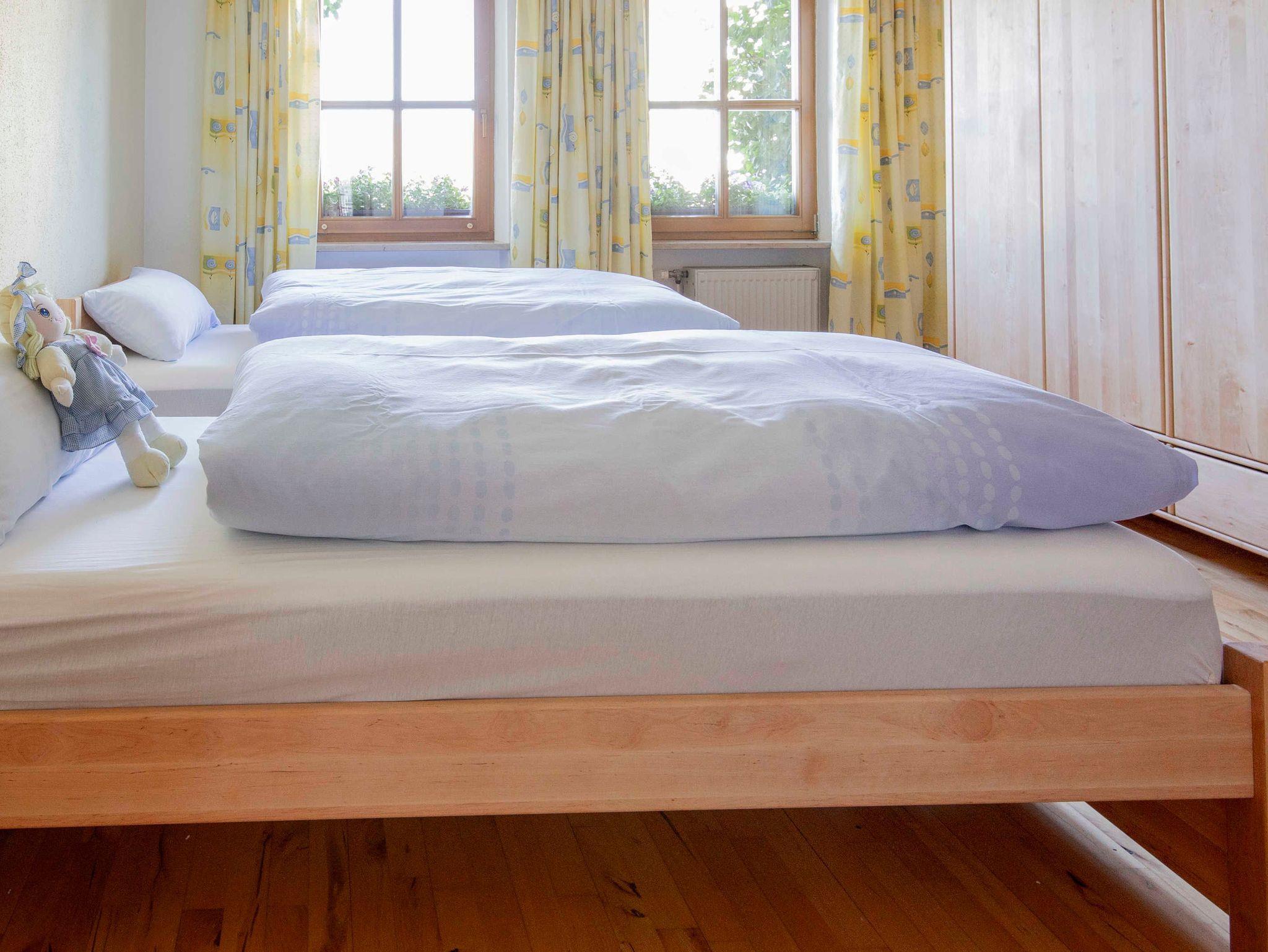 Schlafzimmer 1: Massivholz Doppel- und Einzelbett, hochwertige Bettdecken in Größe 155/220, Matratzen 100% Naturkautschuk, Schrank Massivholz, Balkon vorhanden.