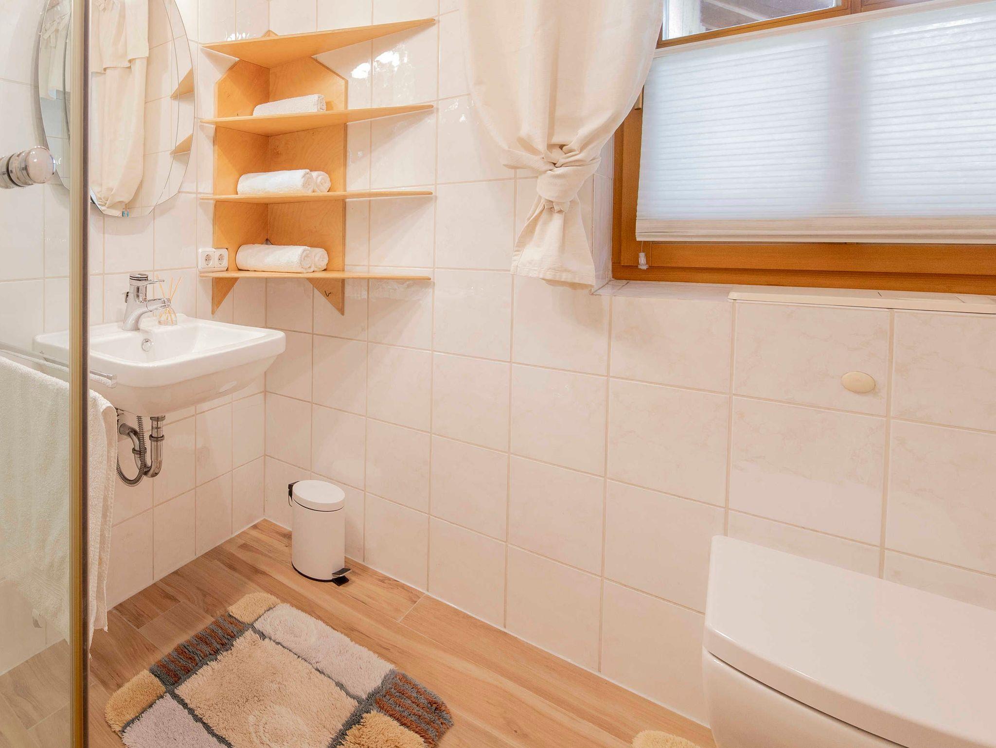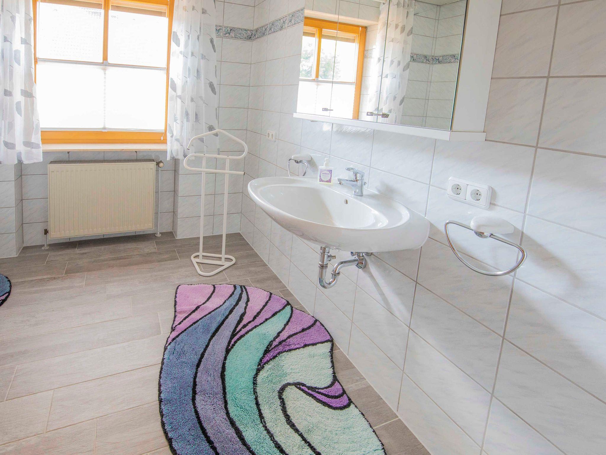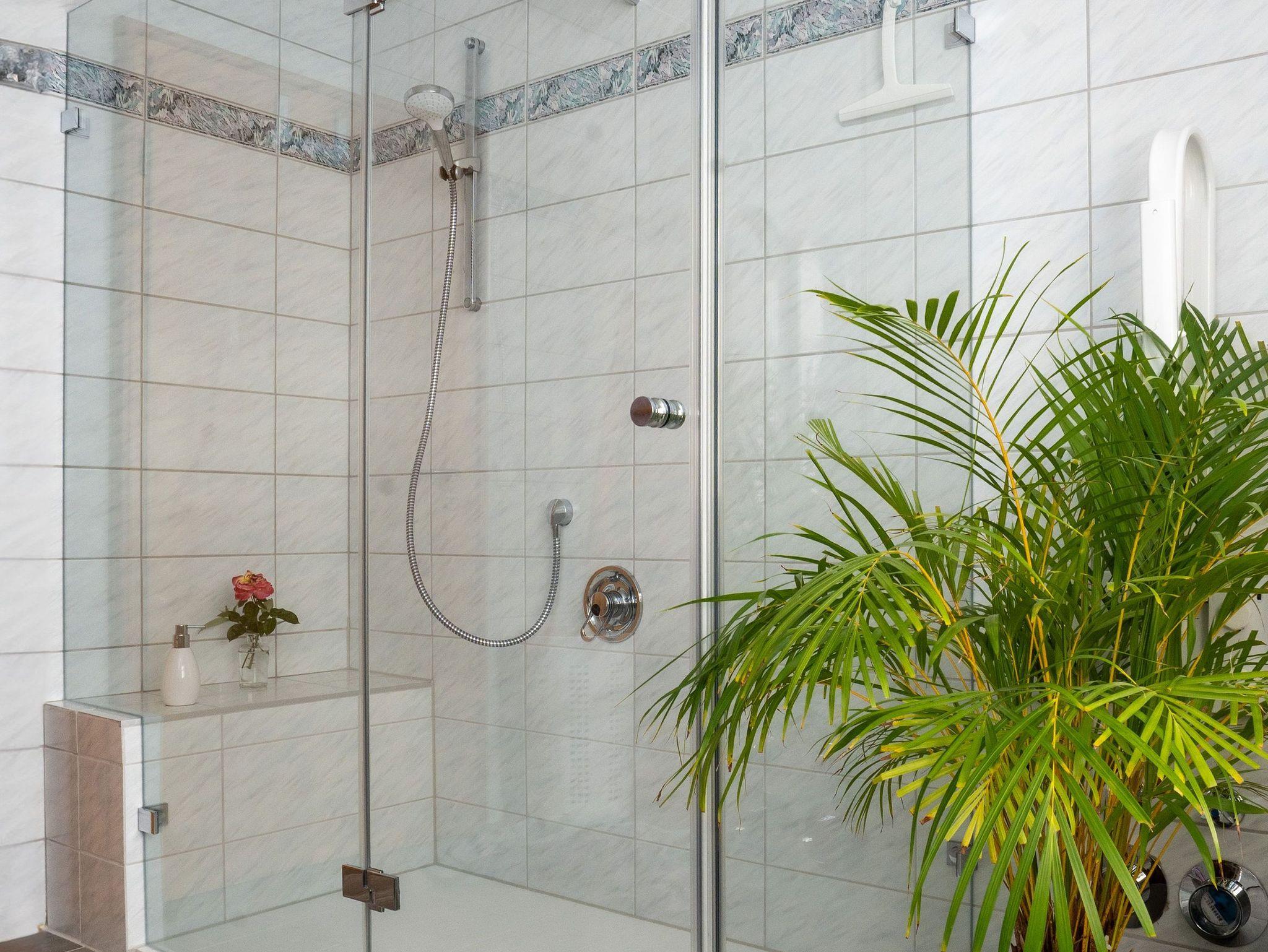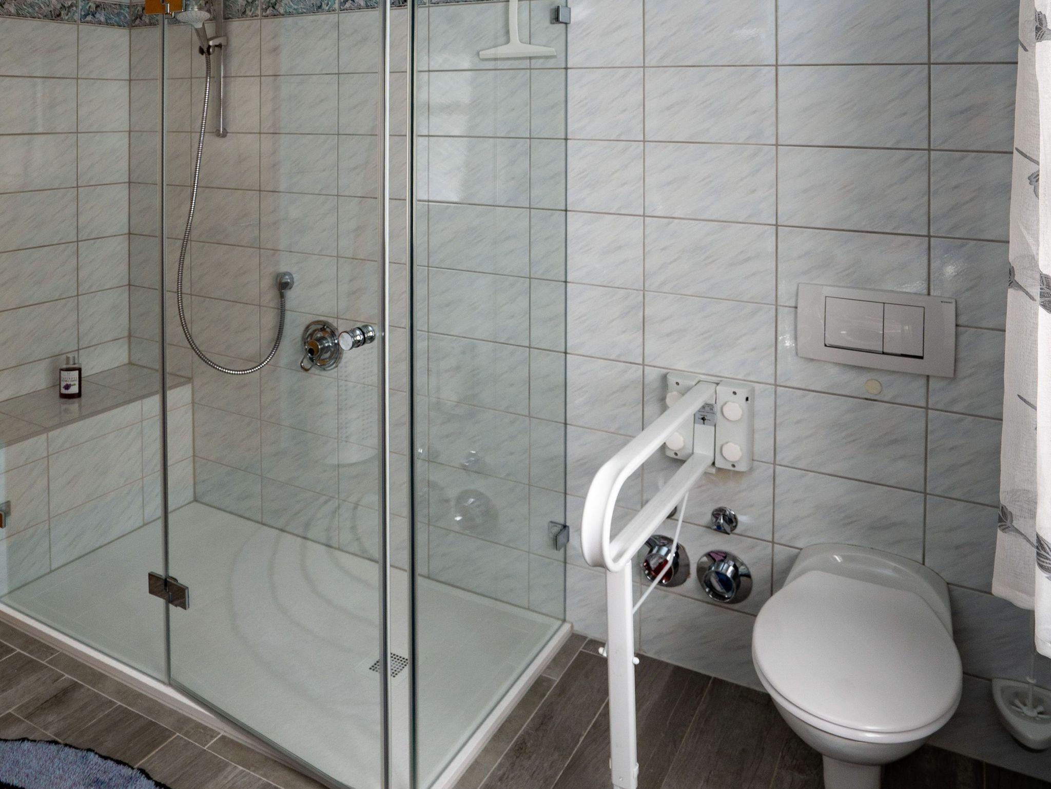 Badezimmer 1: mit großzügiger, begehbarer Dusche, WC, Stützklappgriff, Fön, Wickeltisch und Waschmaschine (gegen geringe Gebühr vor Ort).