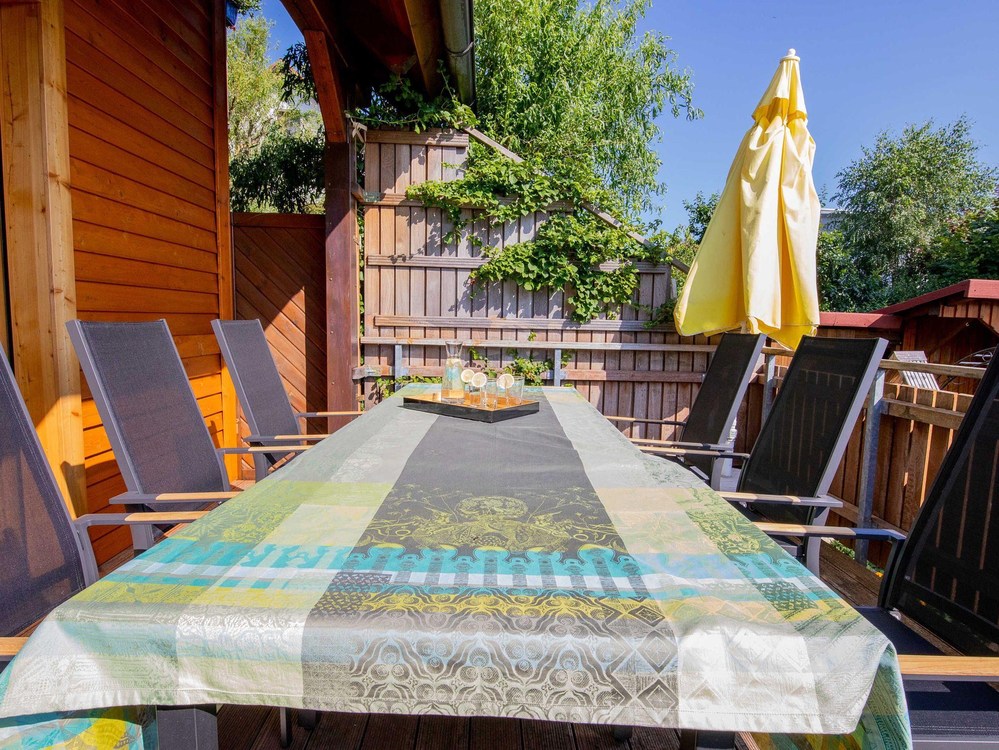 Schöne Sonnen-Terrasse mit hochwertiger Markise, Blick in den Garten und zum nahe gelegenen Ausflugsziel Neubürg. Sitzmöbel mit Auflagen und Liegestühle sind vorhanden!