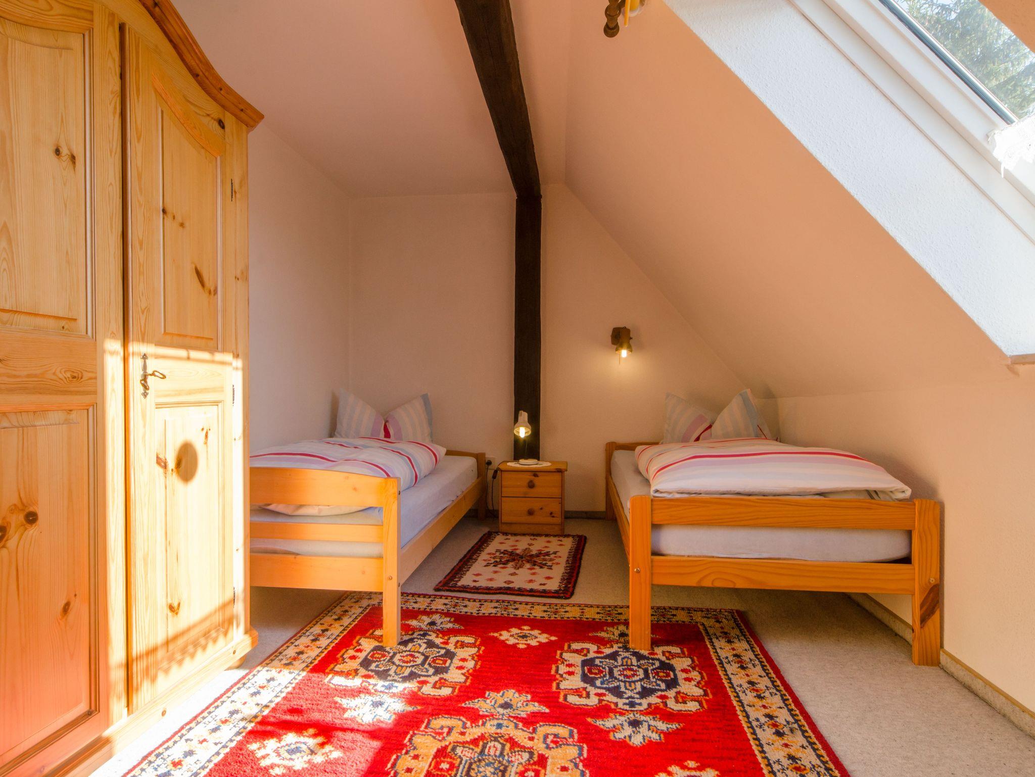 Die Ferienwohnung mit separatem Eingang ist komplett ausgestattet und verfügt über zwei Schlafzimmer, eins davon mit 1 x Doppelbett, das 2. Schlafzimmer mit 2 x Einzelbett. Ein Kinderbett steht auch zur Verfügung.