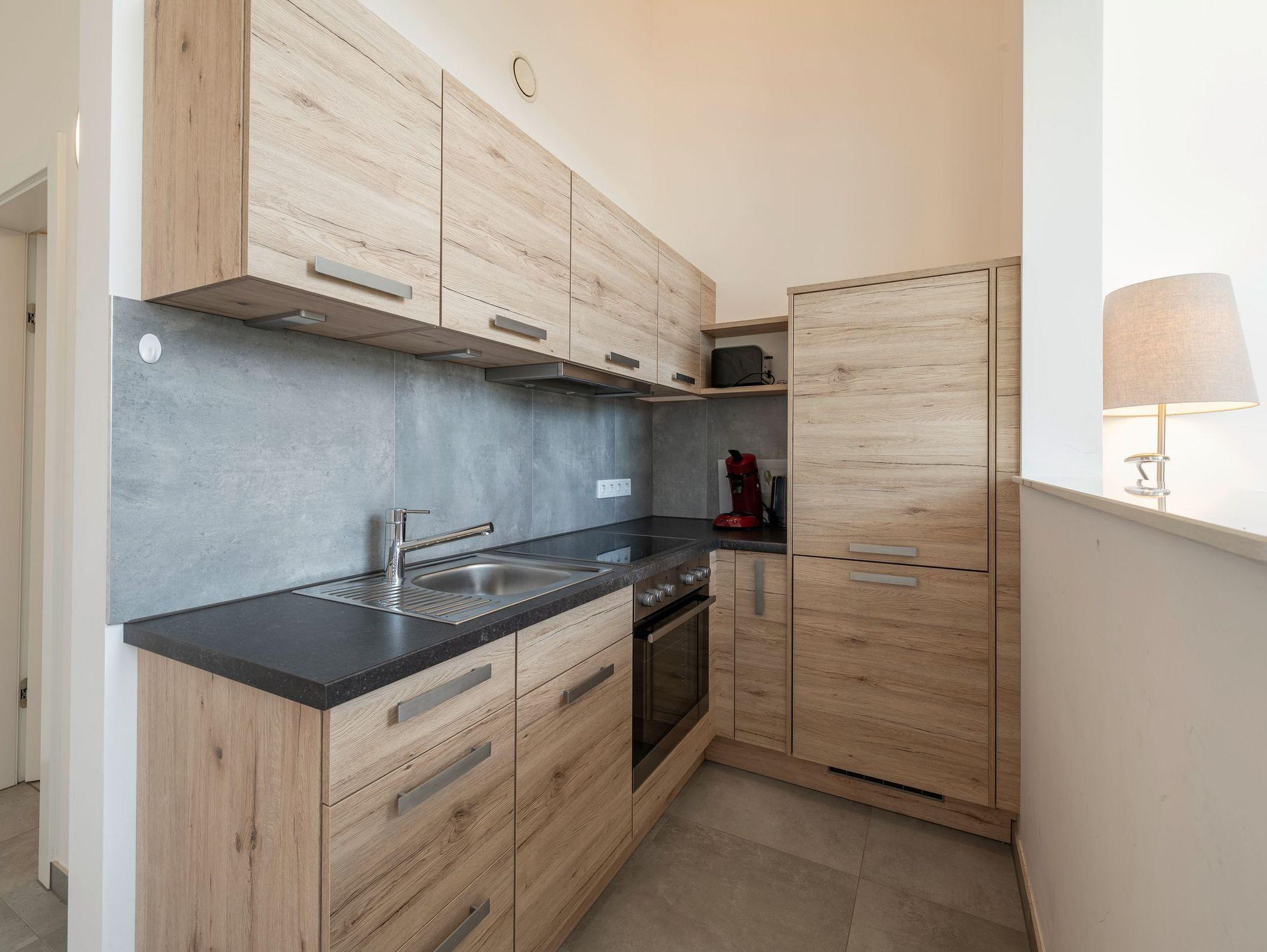 Das stimmungsvolle, multifunktionale Wohn- und Esszimmer, ist mit einem komfortablen Sitz-/ Schlafsofa, einem Flat-TV sowie einem Esstisch mit Bestuhlung und einer offenen Küche mit Herd/ Ceranfeld (mit Backfunktion), Kaffeemaschine, Wasserkocher, Toaster, Geschirrspülmaschine komplett ausgestattet.