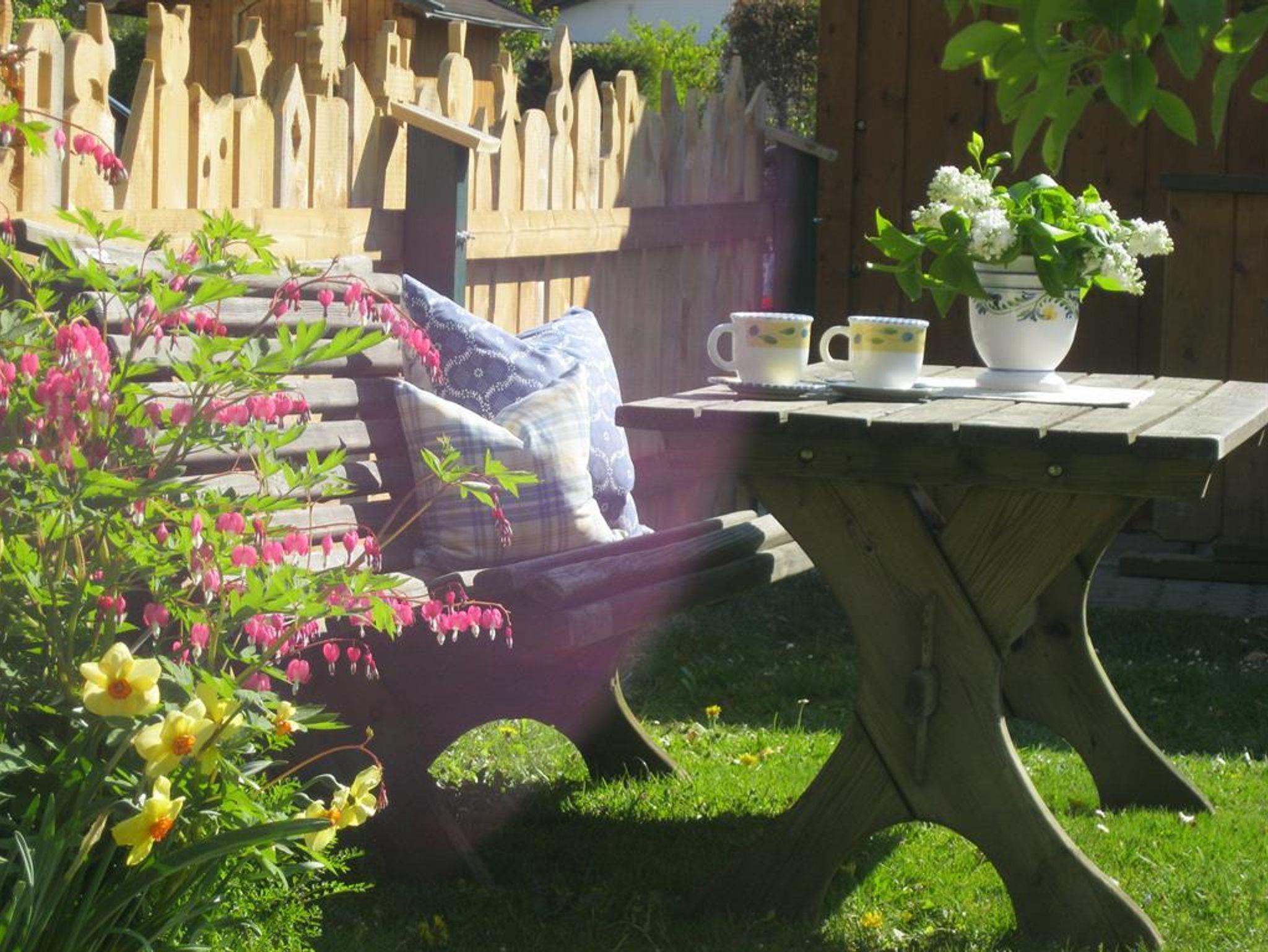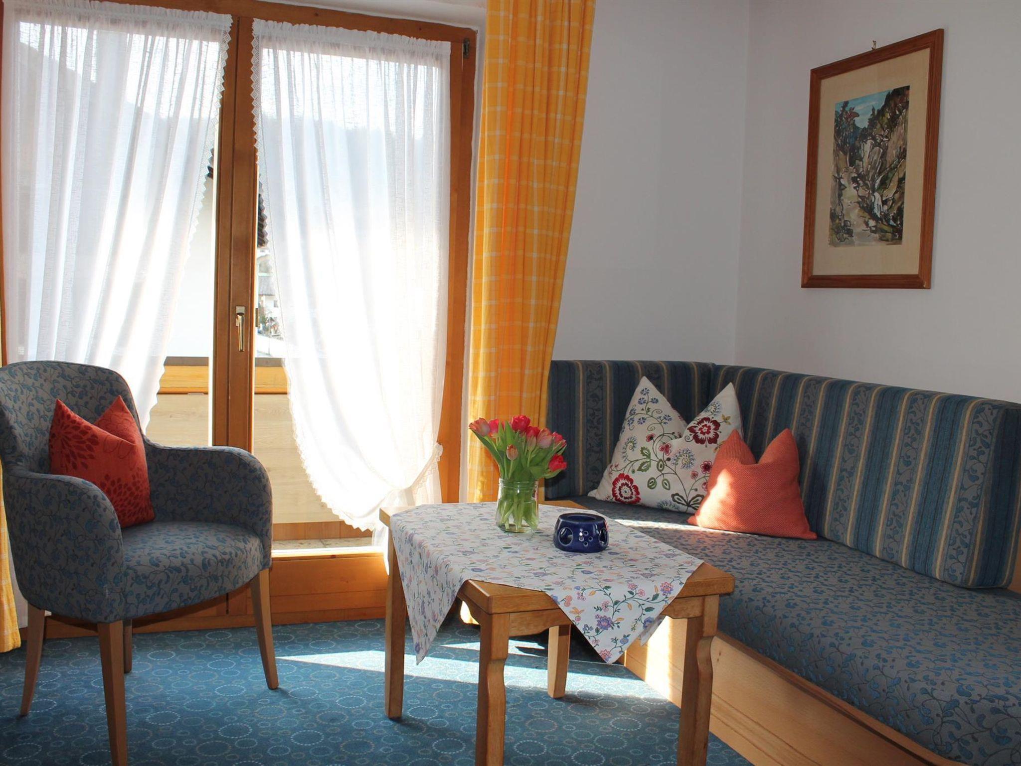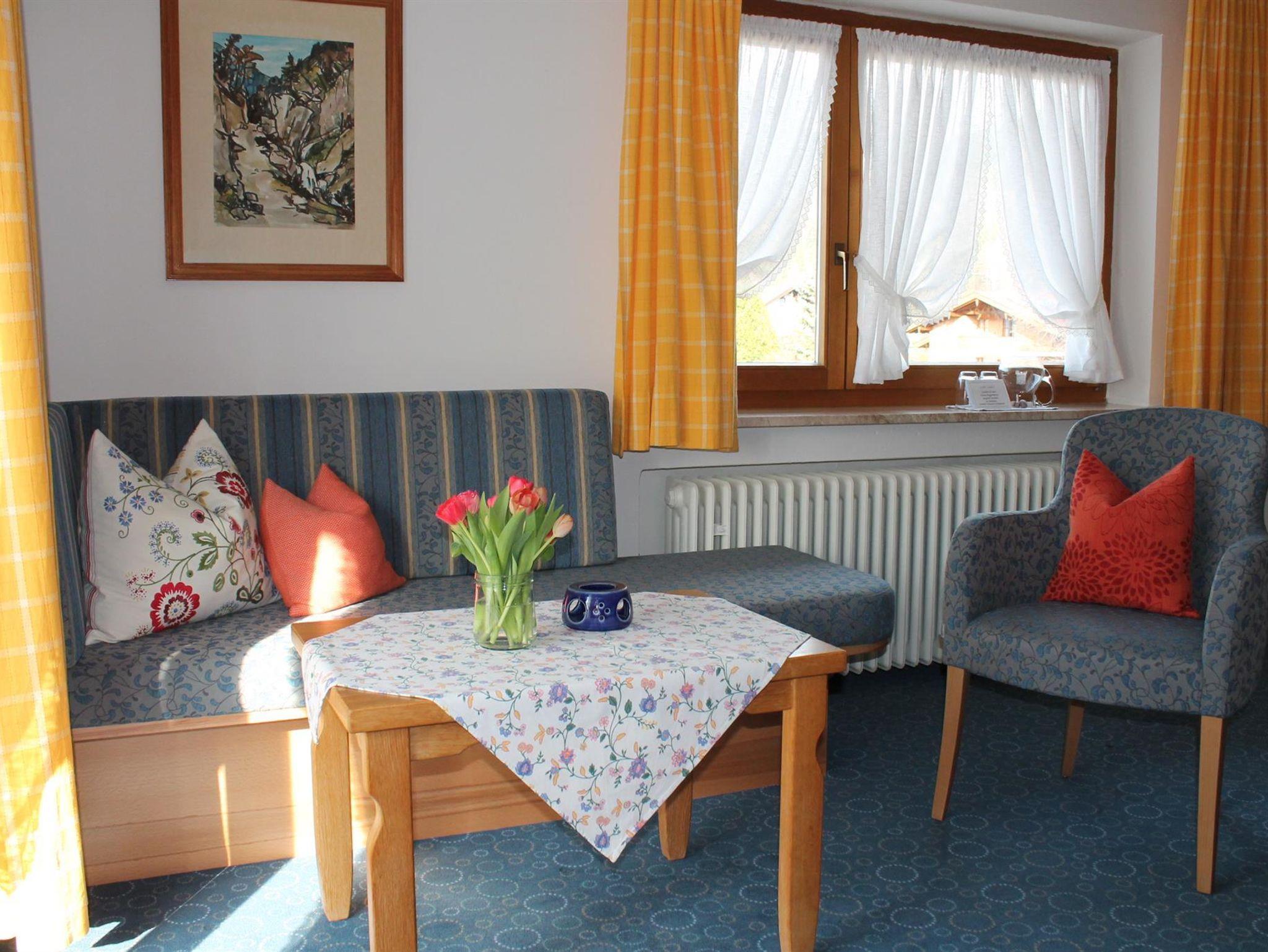 Genießen Sie den herrlichen Bergblick auf unser wunderschönes Wettersteingebirge und den Kranzberg vom West-Balkon Ihrer gemütlichen Ferienwohnung mit >40m². Wohn-Schlafzimmer mit Schrankbetten (normale Betten, tagsüber im Schrank, brauchen abends nur ausgeklappt werden), bequeme Sitzgruppe und Essecke, SAT-TV, Radio, Telefon; sep. Einzelschlafzimmer sep. Küche mit Kochplatten, Mikrowelle auf Wunsch, Kühlschrank mit Gefrierfach, Kaffeemaschine, Wasserkocher und kompl. Geschirr; Dusche/ WC, Fön; Balkon mit Sonnenschirm und Gartenmöbeln; Bettwäsche, Handtücher, Tischdecken und Geschirrtücher vorhanden