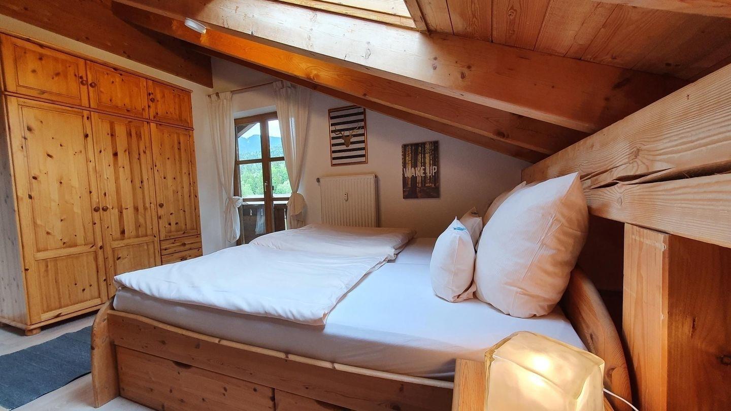 Im alpenländischen Stil gestaltete 2 Zimmer- Dachgeschosswohnung (62qm) mit sichtbarem Dachstuhl, belegbar mit max. 4 Personen, davon schlafen zwei in der Nische unter der Dachschräge.