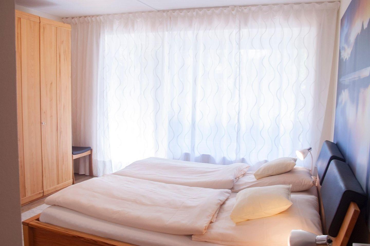 Das nach Osten gelegene freundliche Schlafzimmer verfügt über Doppelbetten und einen großen Kleiderschrank. Hier befindet sich auch der zweite Balkon.
