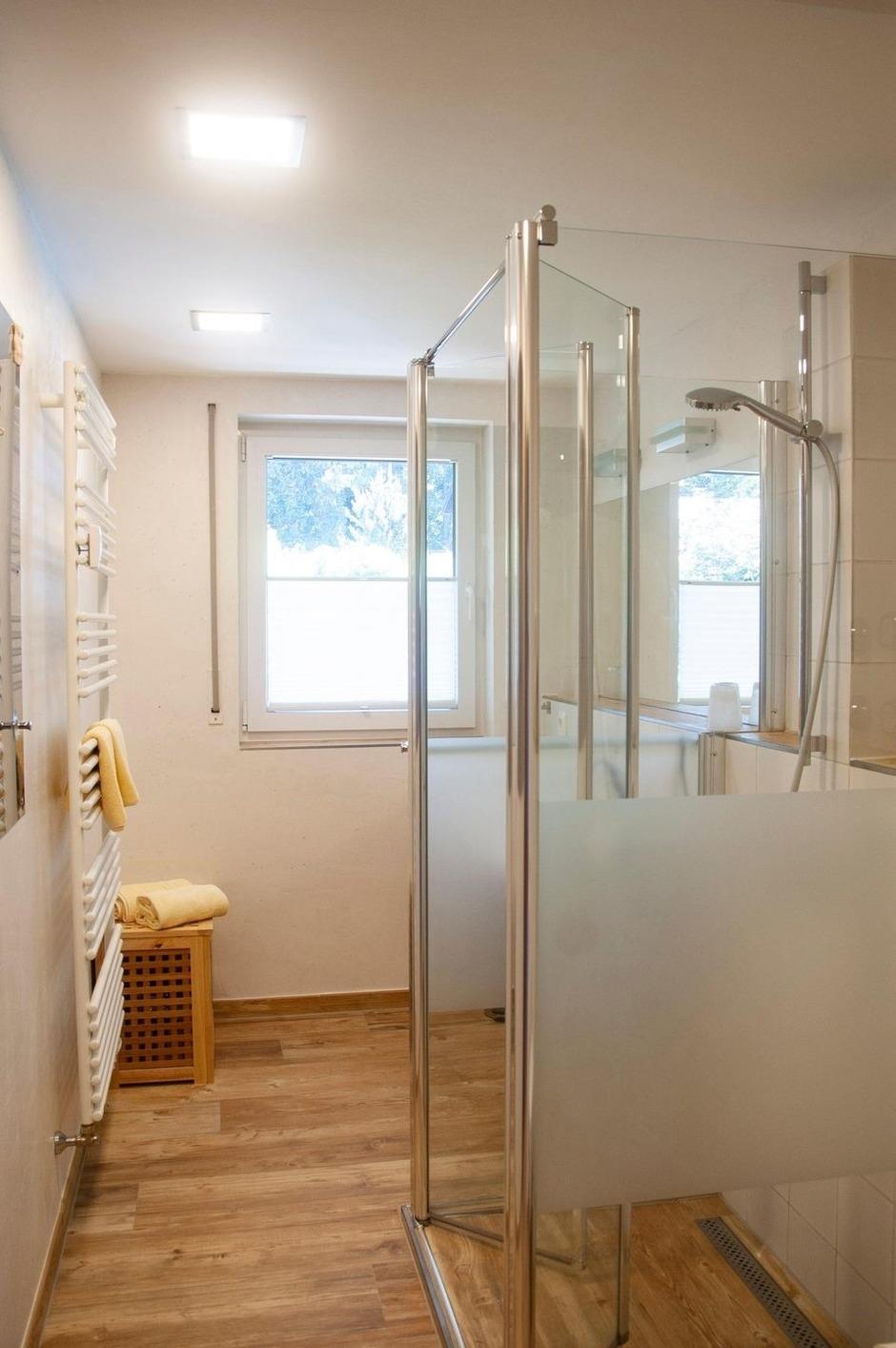 Das Bad mit Dusche, Doppelwaschbecken und Toilette ist geräumig geschnitten. Eine weitere separate Toilette mit kleinem Waschbecken ist ein weiterer Vorteil.