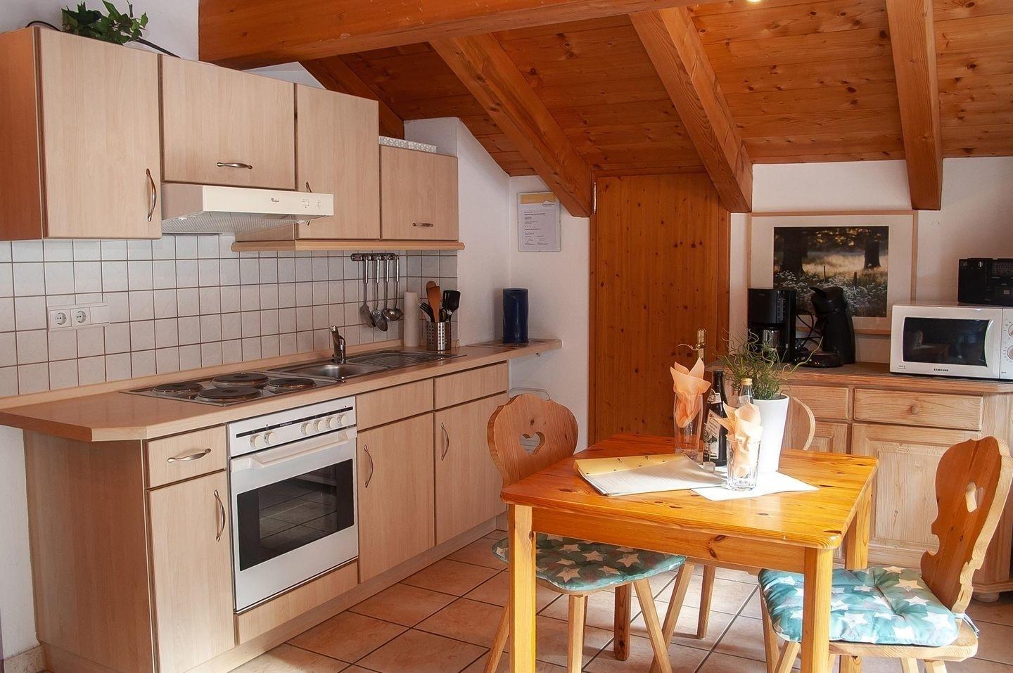 1-Zimmer-Appartement für 1 - 2 Personen, 42 qm mit freiem Holzgiebel im Dachgeschoss mit herrlichem Blick aufs Karwendel vom möbliertem Balkon.