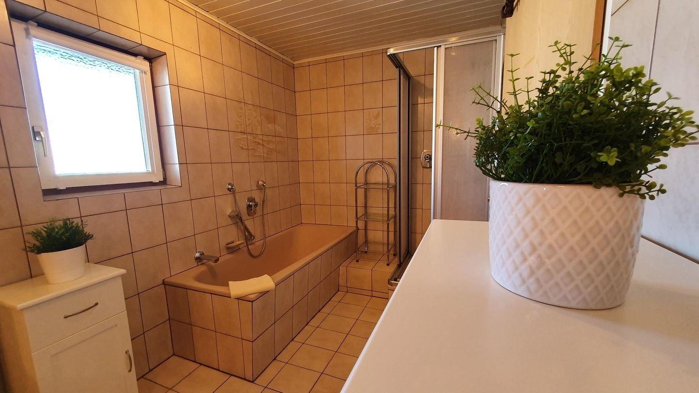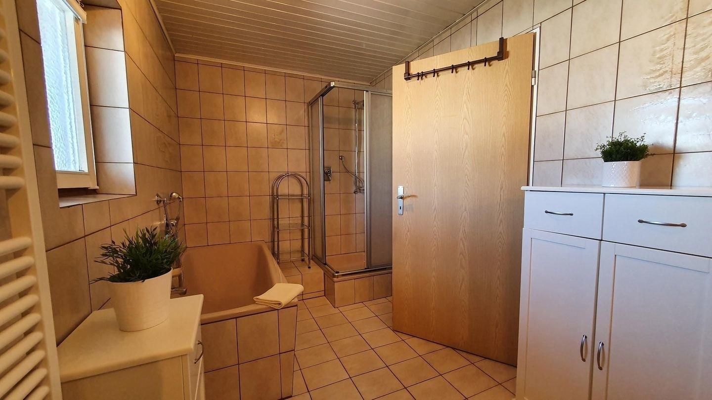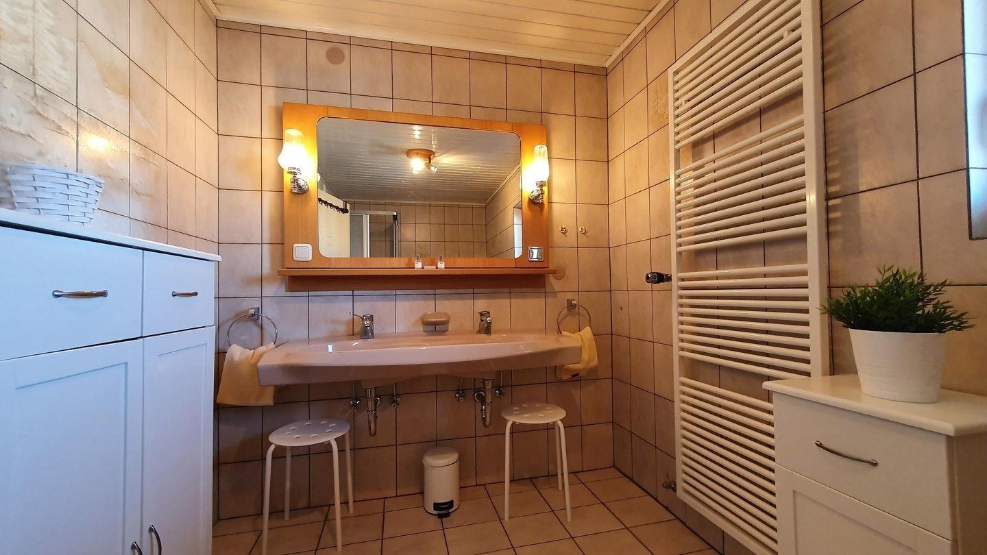Geräumiges Bad mit Fenster, Doppelwaschbecken, Badewanne und Dusche, freies WLAN, Autostellplatz