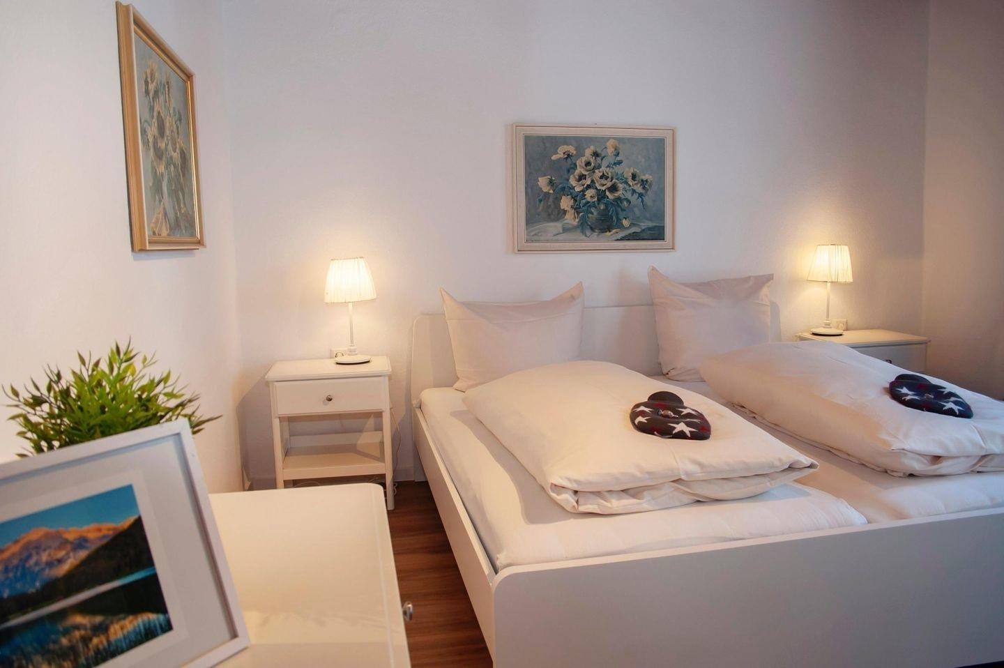 Romantisch weißes Schlafzimmer, separate Küche mit gemütlichem Essplatz, Mikrowelle, Herd, Kühlschrank, Küchenutensilien etc.