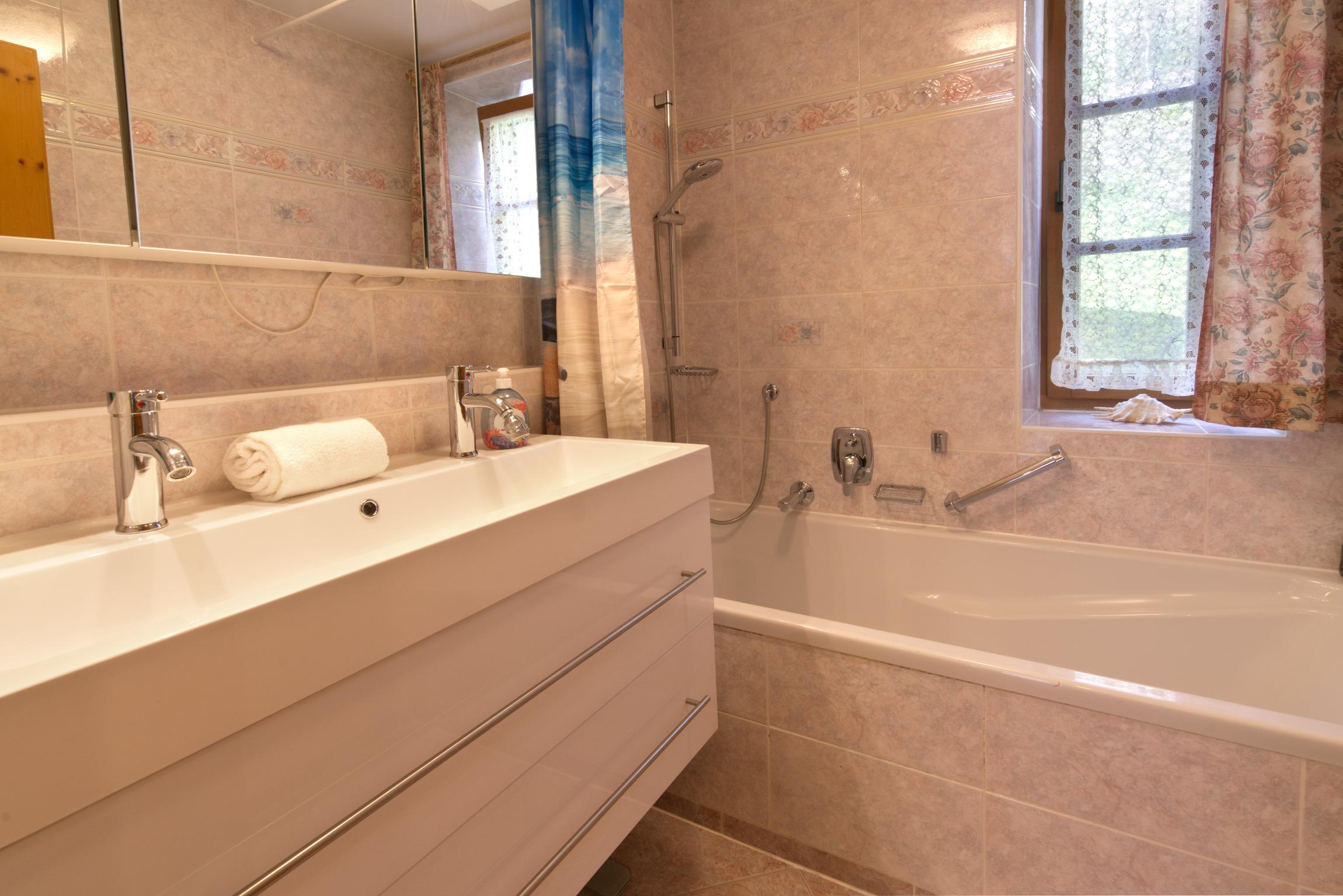 Bayerisch gemütliche 3 Zimmer-Wohnung (86 qm) im 1. Stock. Große Wohnküche mit Tisch und Stühlen, Kabel-TV, Radio, großer Küchenzeile mit Mikrowelle, Geschirrspüler und Kühl-Gefrierkombination. Wohnzimmer mit Couch und Sesseln. Zwei Schlafzimmer mit Doppelbetten und Kleiderschrank. Duschbad mit Badewanne. WC separat. Aussichtsbalkon (möbliert) mit Blick über die Dächer von Mittenwald und die umliegende Gebirgswelt.