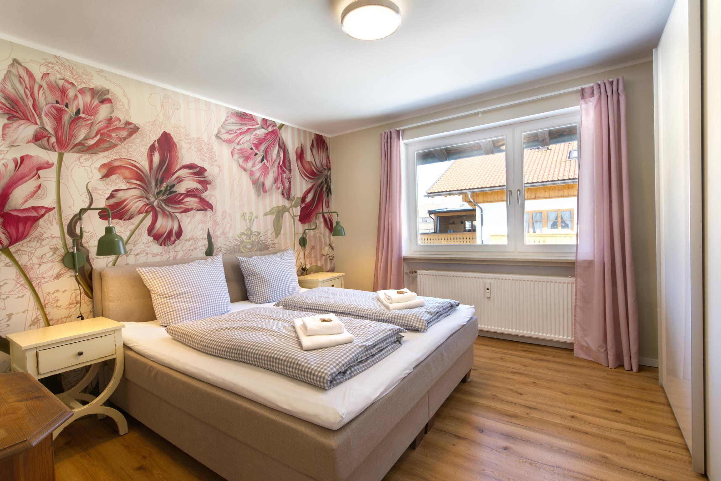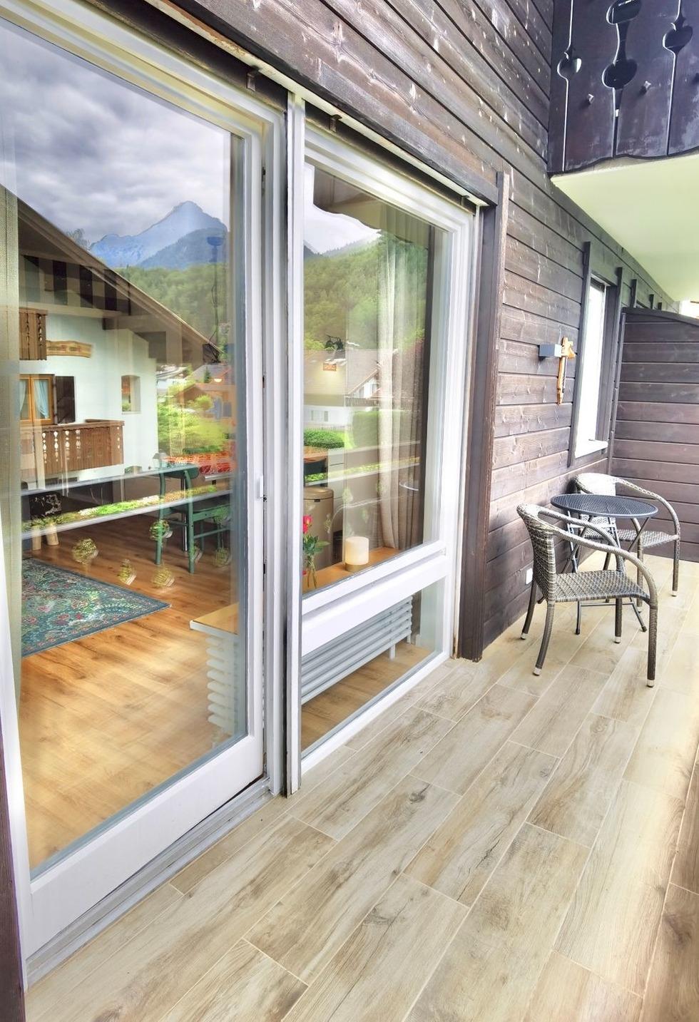 Das Haus liegt in einer ruhigen und gepflegten Wohngegend von Mittenwald. Die Ferienwohnung mit der besonderen farblichen Note hat einen möblierten Westbalkon mit Abendsonne und Blick zum Kranzberg und Wettersteingebirge.