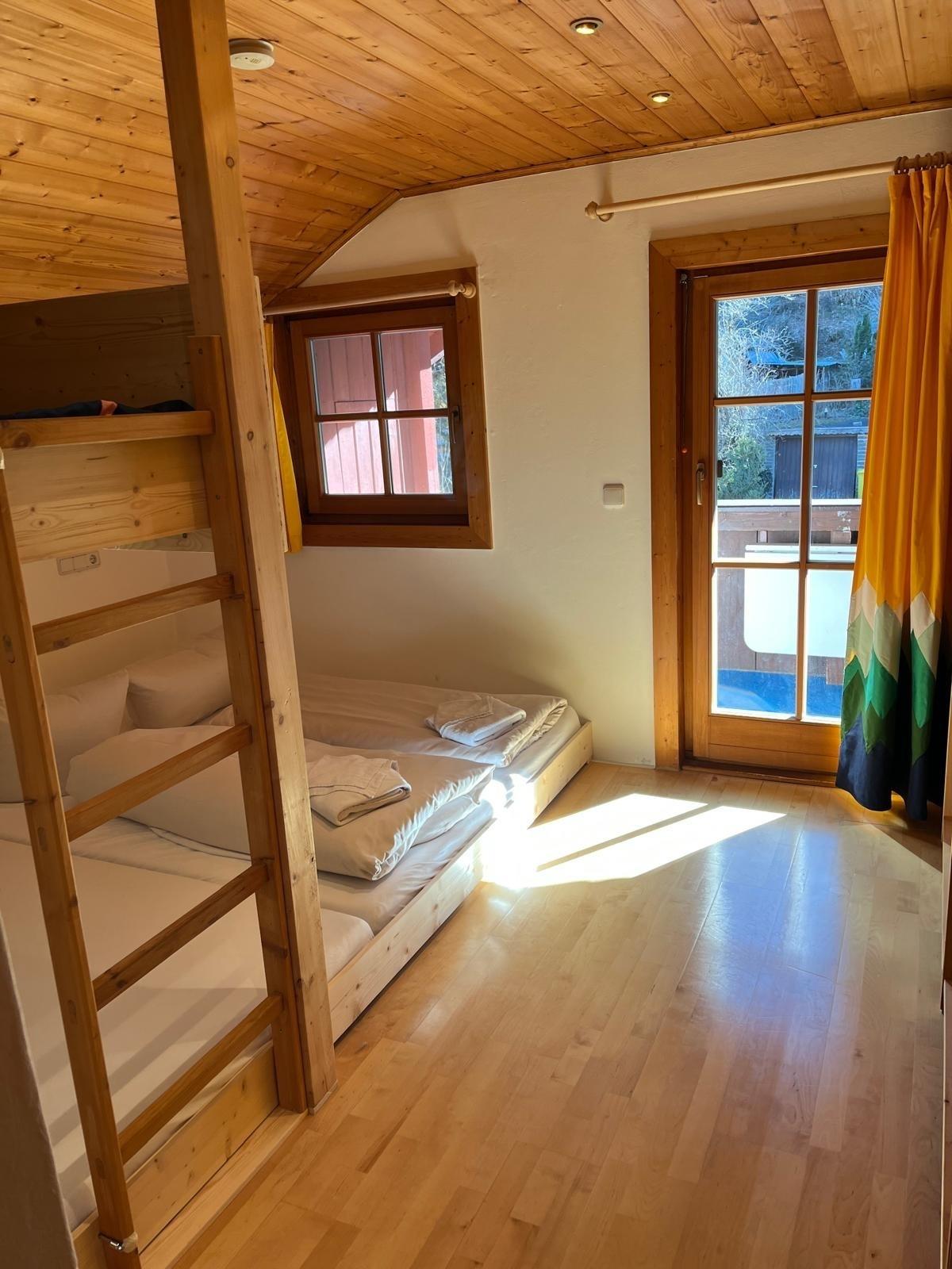 Schlafzimmer: Es gibt zwei Schlafzimmer. Schlafzimmer 1 (siehe Bild)wird Kinderherzen höher schlagen lassen. Ein Etagenbett direkt unter der Decke (Höhle)Breite 1,40m. Es sind auch 2 große hochwertige Matratzen (ohne Bettgestell) auf dem Boden. Hier können weitere Gäste schlafen, ob Kinder oder Erwachsene.