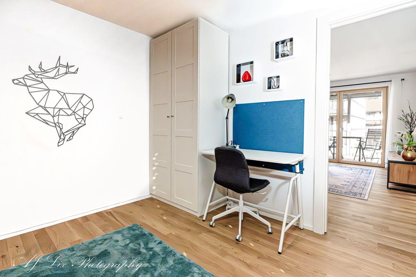 Ein Arbeitszimmer oder auch ruhiges Lesezimmer, das sich ebenfalls als Schlafzimmer nutzen lässt, verfügt über eine hochwertige Schlafcouch mit Lattenrost und Matratze (150x200cm). Hier befindet sich ein höhenverstellbarer Schreibtisch mit Schreibtischstuhl beispielsweise zur Nutzung als Home-Office im Urlaub.