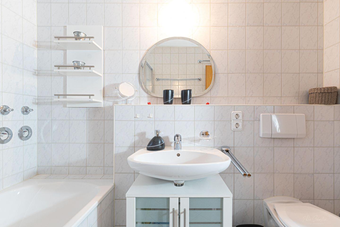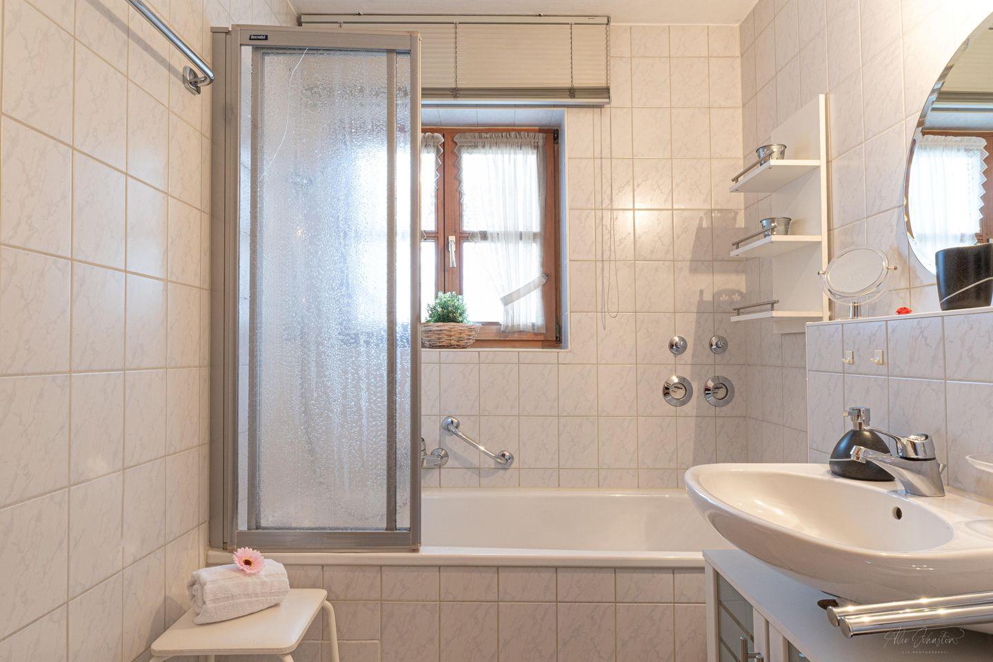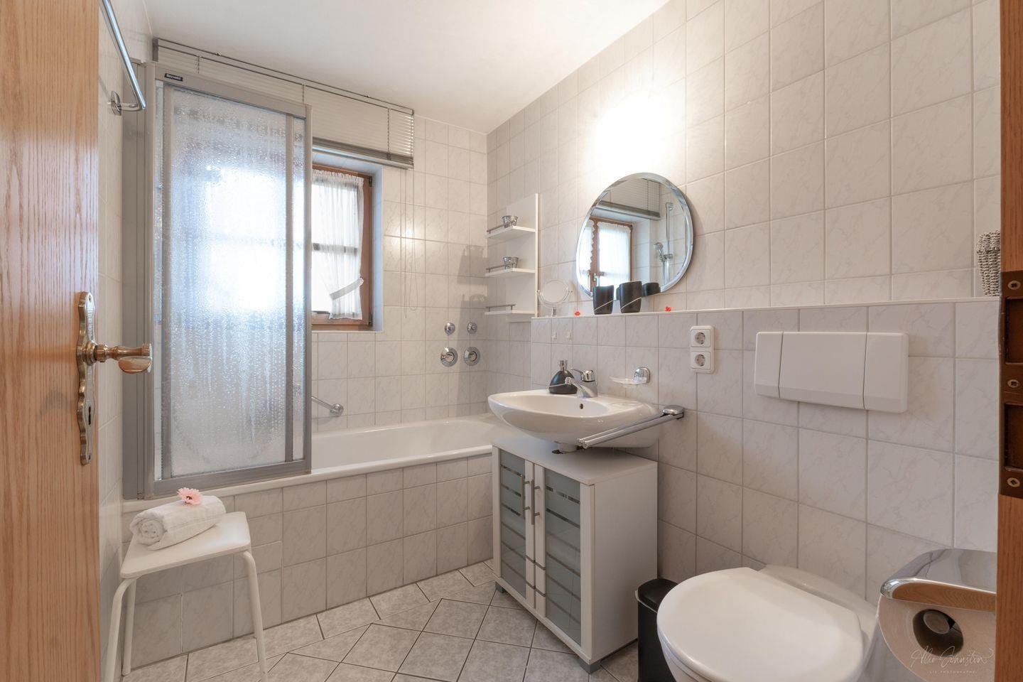 Das Badezimmer ist ansprechend gestaltet und verfügt über eine Badewanne, ein Waschbecken sowie einen Spiegel und Kosmetikspiegel, die Ihnen zusätzlichen Komfort bieten. Der gepflegte Raum ermöglicht es Ihnen, nach einem erlebnisreichen Tag in der Natur zu entspannen.