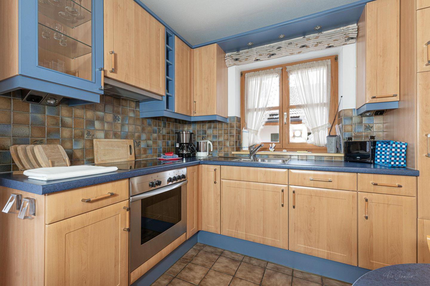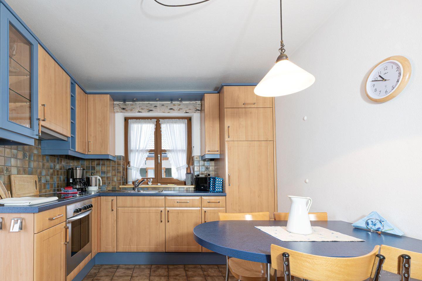 Die abgeschlossene Küche ist mit modernen Geräten bestens ausgestattet. Hier finden Sie einen Herd mit vier Platten, einen Elektro-Backofen sowie einen Kühlschrank mit Gefrierfach und natürlich eine Spülmaschine für Ihren komfortablen Aufenthalt. Geschirr und Besteck sind ebenfalls vorhanden, sodass Sie Ihre kulinarischen Fähigkeiten hervorragend unter Beweis stellen können. Die Erstausstattung bietet Ihnen zudem Handtücher und Bettwäsche, damit Sie gleich bei Ihrer Ankunft in die Ferientage starten können.