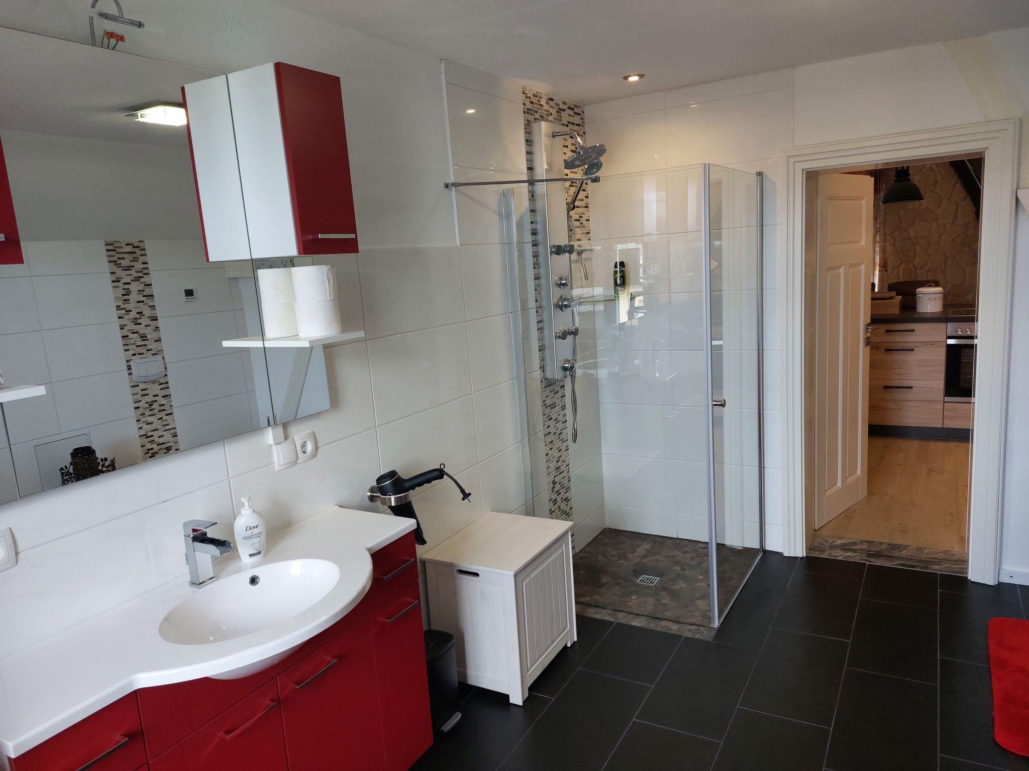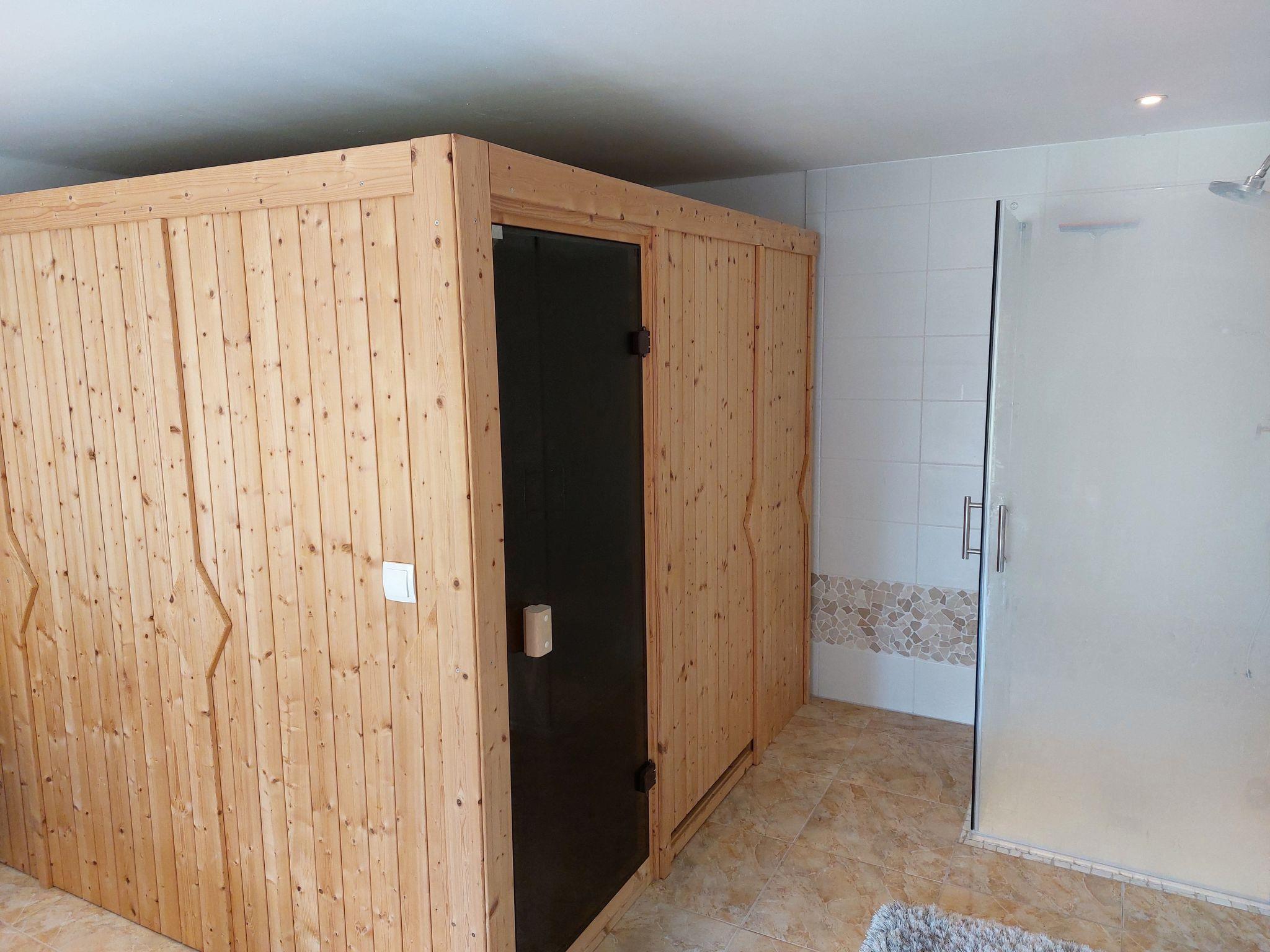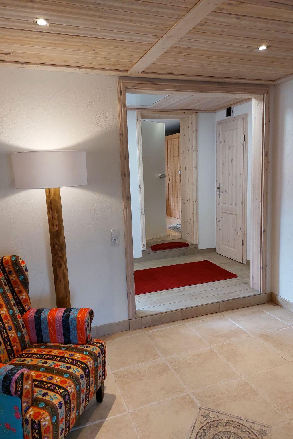 In addition to the entrance area with reading corner, the sauna area with shower and large indoor whirlpool is located on the ground floor. Next to it, in a large room with an automatic roller shutter, you will find the two e-bikes for your excursions in the beautiful surroundings.