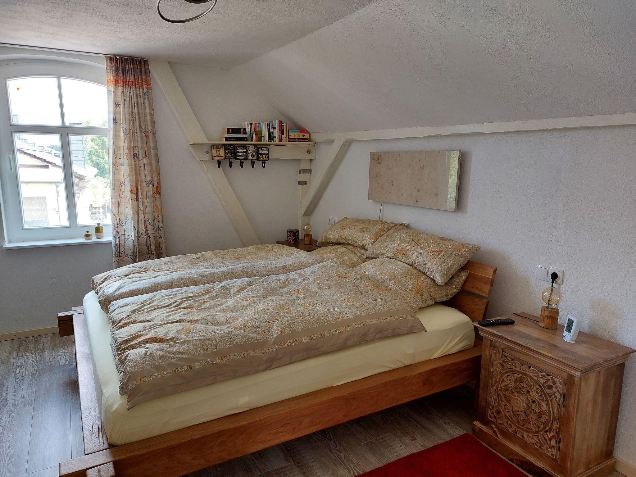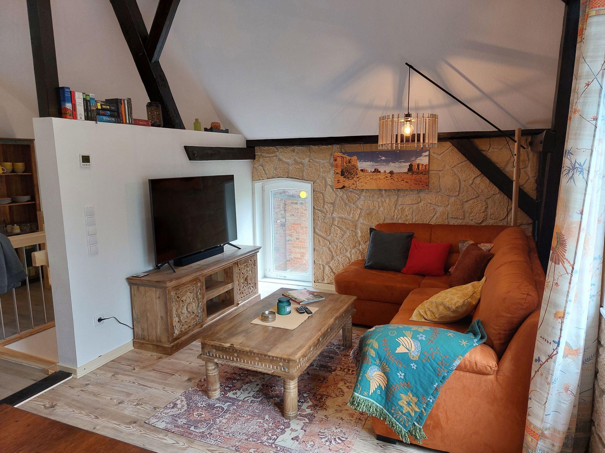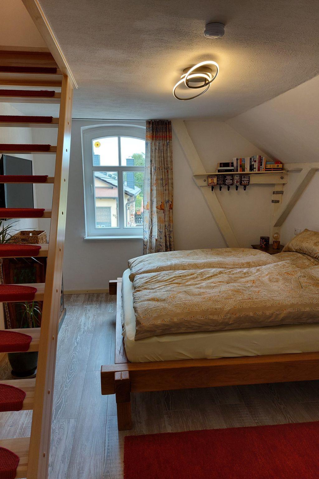 Directly next to the bathroom is the cosy bedroom, also equipped with a TV. A staircase leads from the bedroom to the converted loft. There is a further sleeping area in the loft.