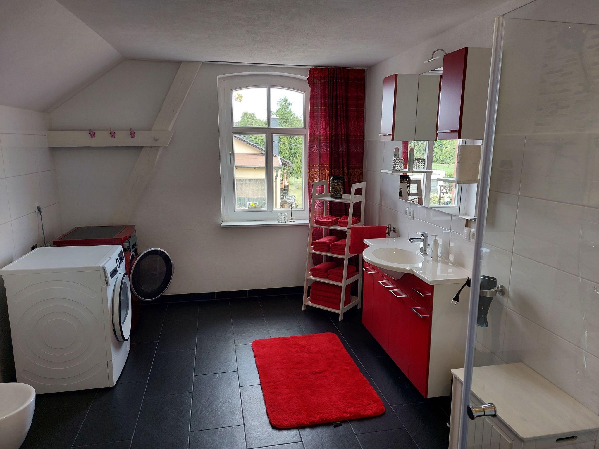 The bathroom with toilet, bidet, shower and washbasin is also located on the first floor. The washing machine and tumble dryer are also housed here.
