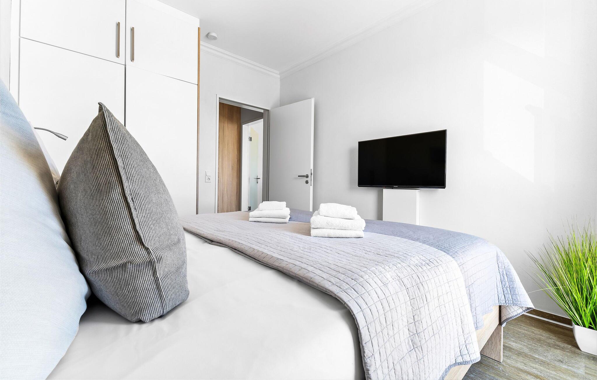 Soveværelset byder på en komfortabel dobbeltseng (180 cm x 200 cm) og et andet 40 tommer fjernsyn samt et pengeskab til personlige ejendele. Et ekstra værelse med en køjeseng (90 cm x 200 cm) giver plads til børn eller ekstra gæster.