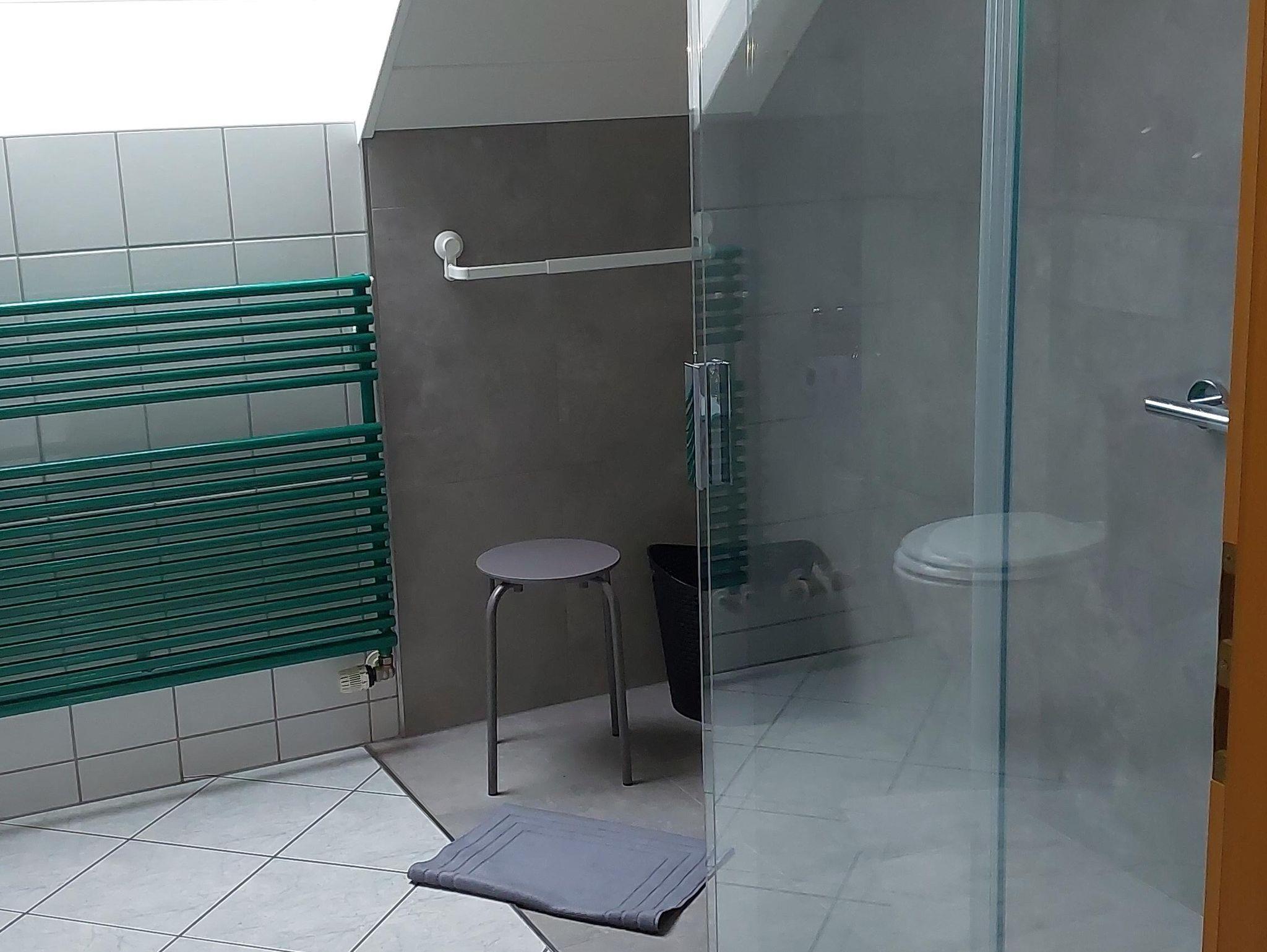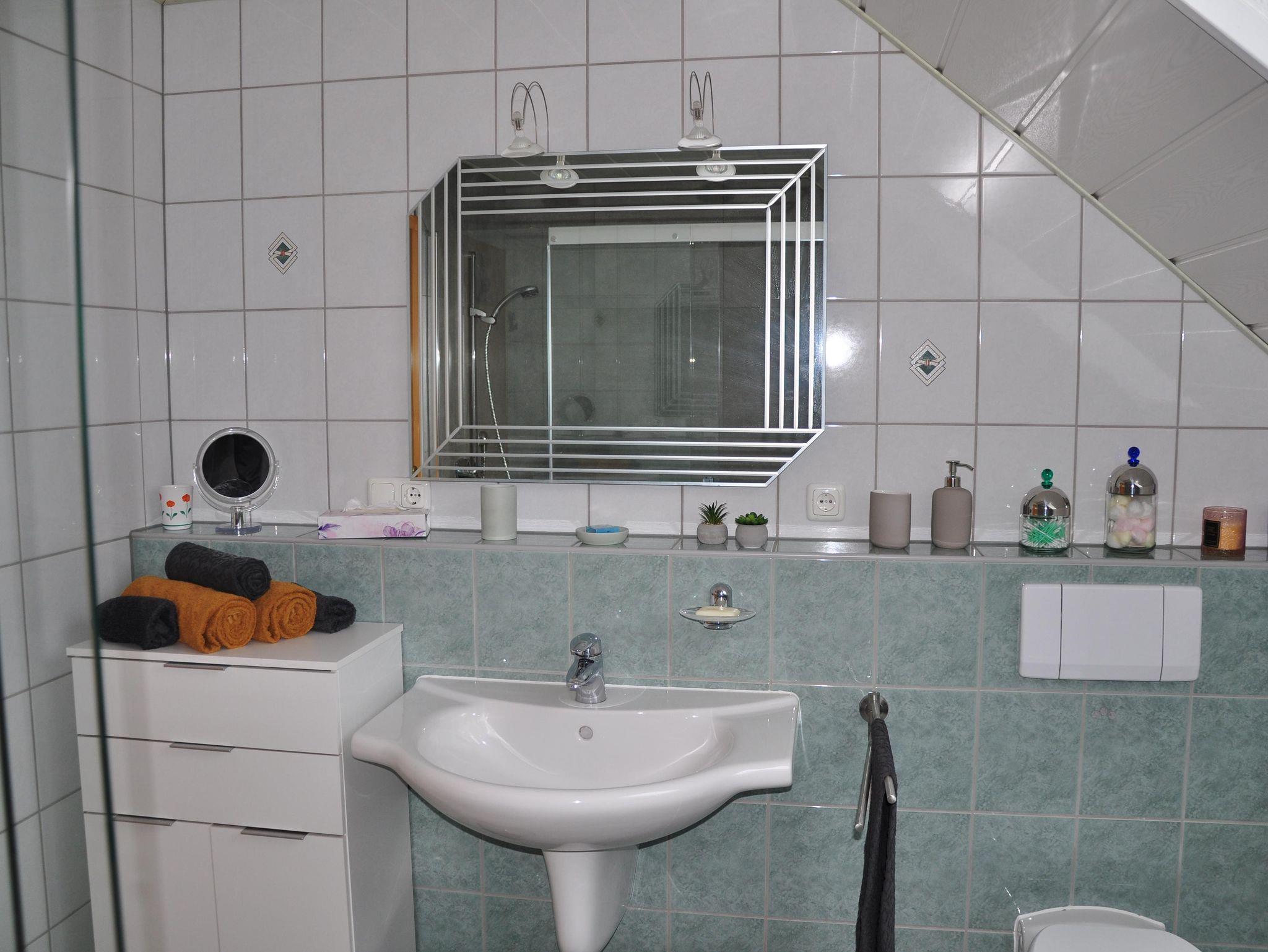 Das Tageslicht-Bad verfügt über eine ebenerdige Dusche, WC und Waschbecken. Weiterhin steht eine separates WC mit Waschbecken zur Verfügung.