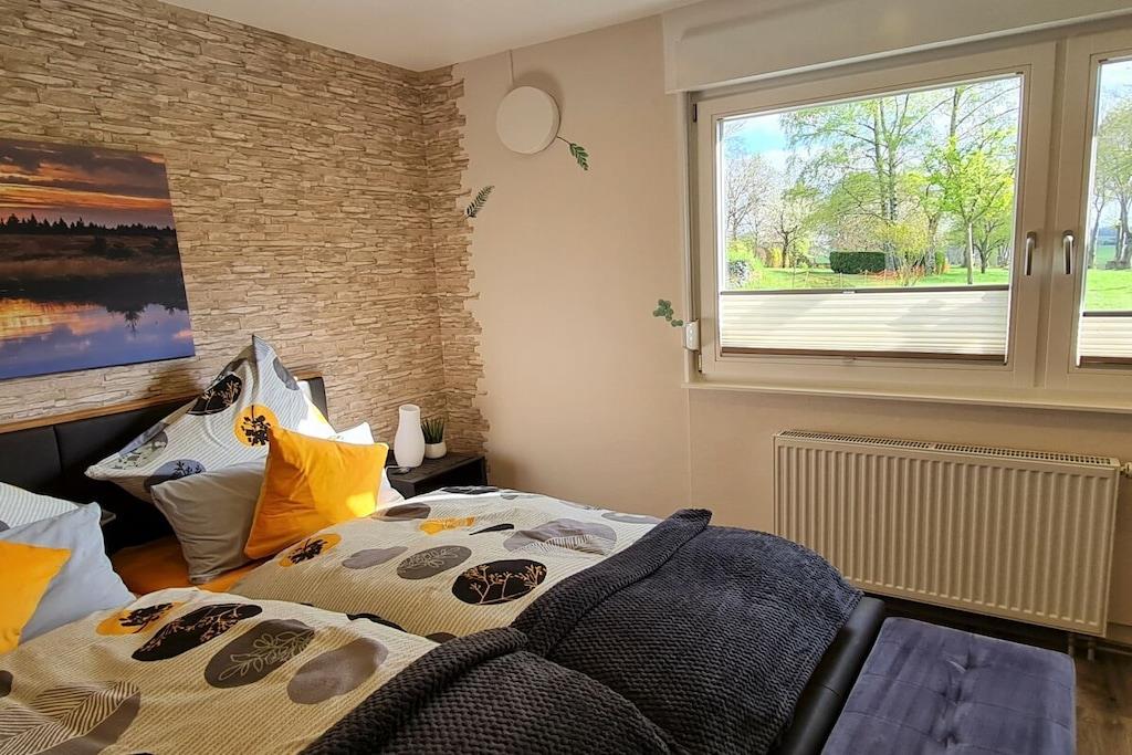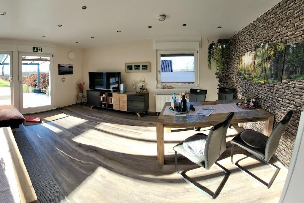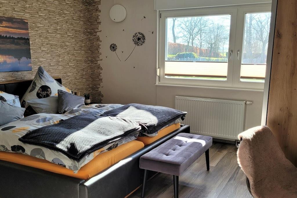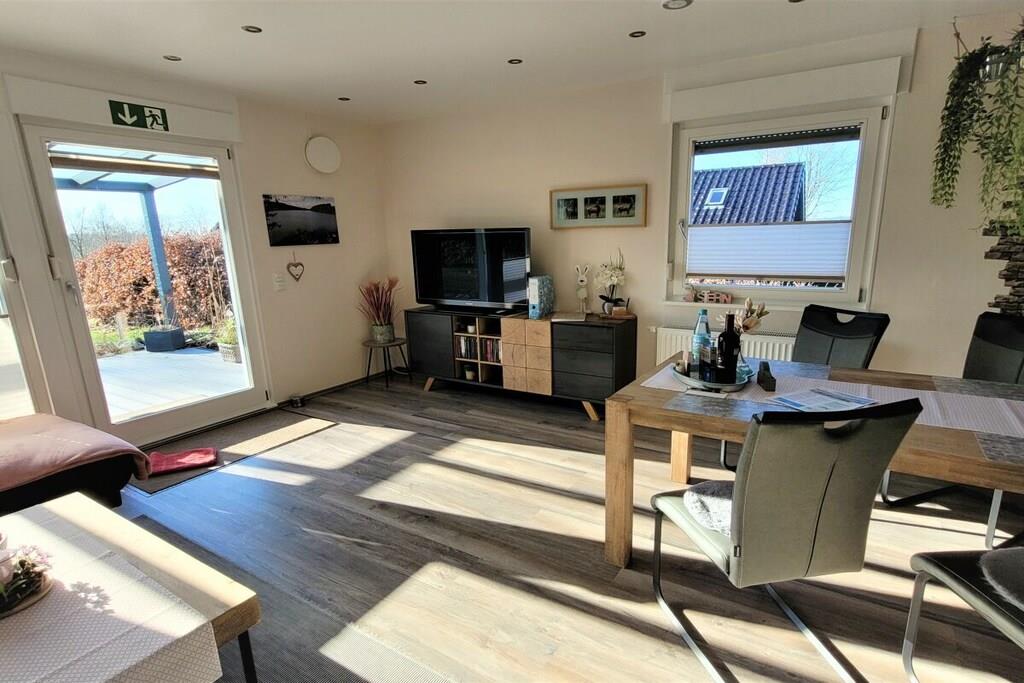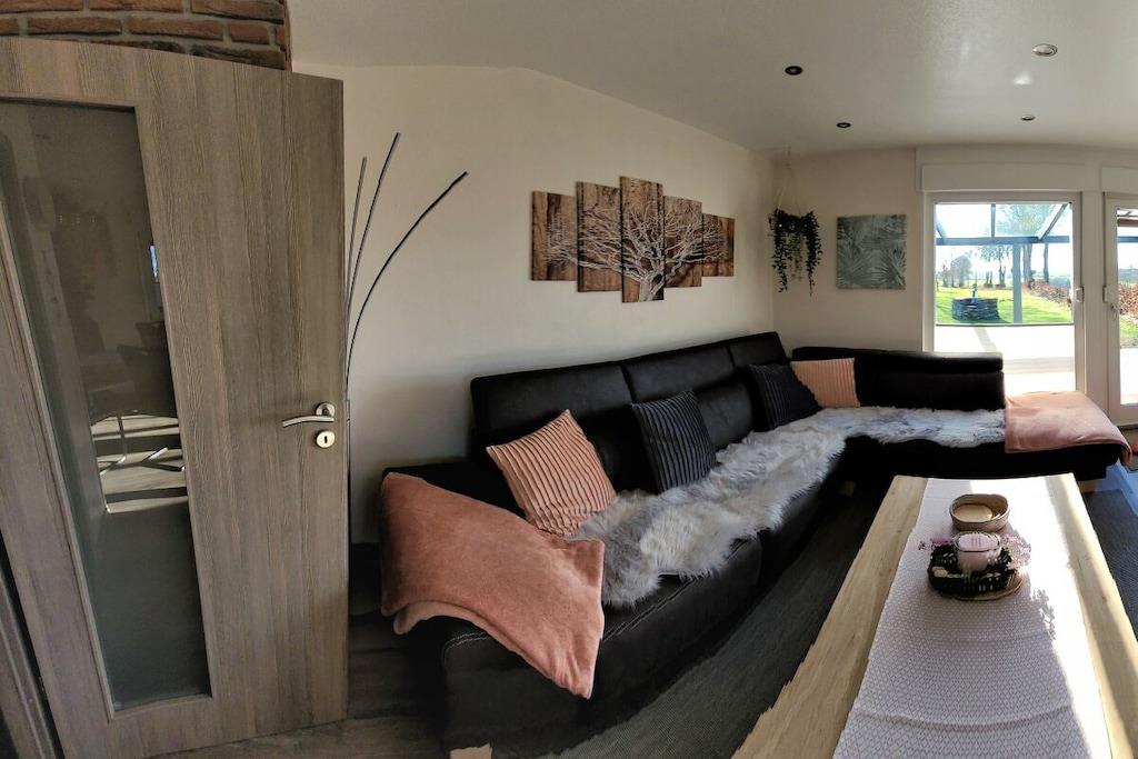 In unserem komplett modernisierten und liebevoll, sowie gemütlich eingerichteten Ferienhaus, werden Sie sich auf 70m² Wohnfläche mit bis zu 4 Personen sehr wohl fühlen. Das große Gartengrundstück (Wiesenfläche) von ca. 2000m² und die überdachte Terrasse 15m² mit einer traumhaften Aussicht ins Grüne, sind zu jeder Jahreszeit ein Ort zum Entspannen. Das Wohnzimmer mit direktem Zugang zur Terrasse, bietet neben einem Essbereich für 4 Personen, eine Ledercouchgarnitur und SAT-TV. In der Küche bleiben nahezu keine Wünsche offen. Um Ihren Aufenthalt so angenehm wie möglich zu gestalten , stehen eine Vielzahl von Küchengeräten und Einrichtungsgegenständen zur Verfügung. Neben den beiden liebevoll gestalteten und eingerichteten Schlafräumen mit einem komfortablen Doppelbett bzw. zwei gemütlichen Einzelbetten, rundet das modernisierte Badezimmer mit einer großen bodengleichen Dusche die Annehmlichkeiten Ihres Feriendomizils ab. Hunde erlaubt, max. 2 Hunde, müssen vorab gebucht und angemeldet werden. Übernachtungsgebühr pro Nacht und Hund: 10,-EURO