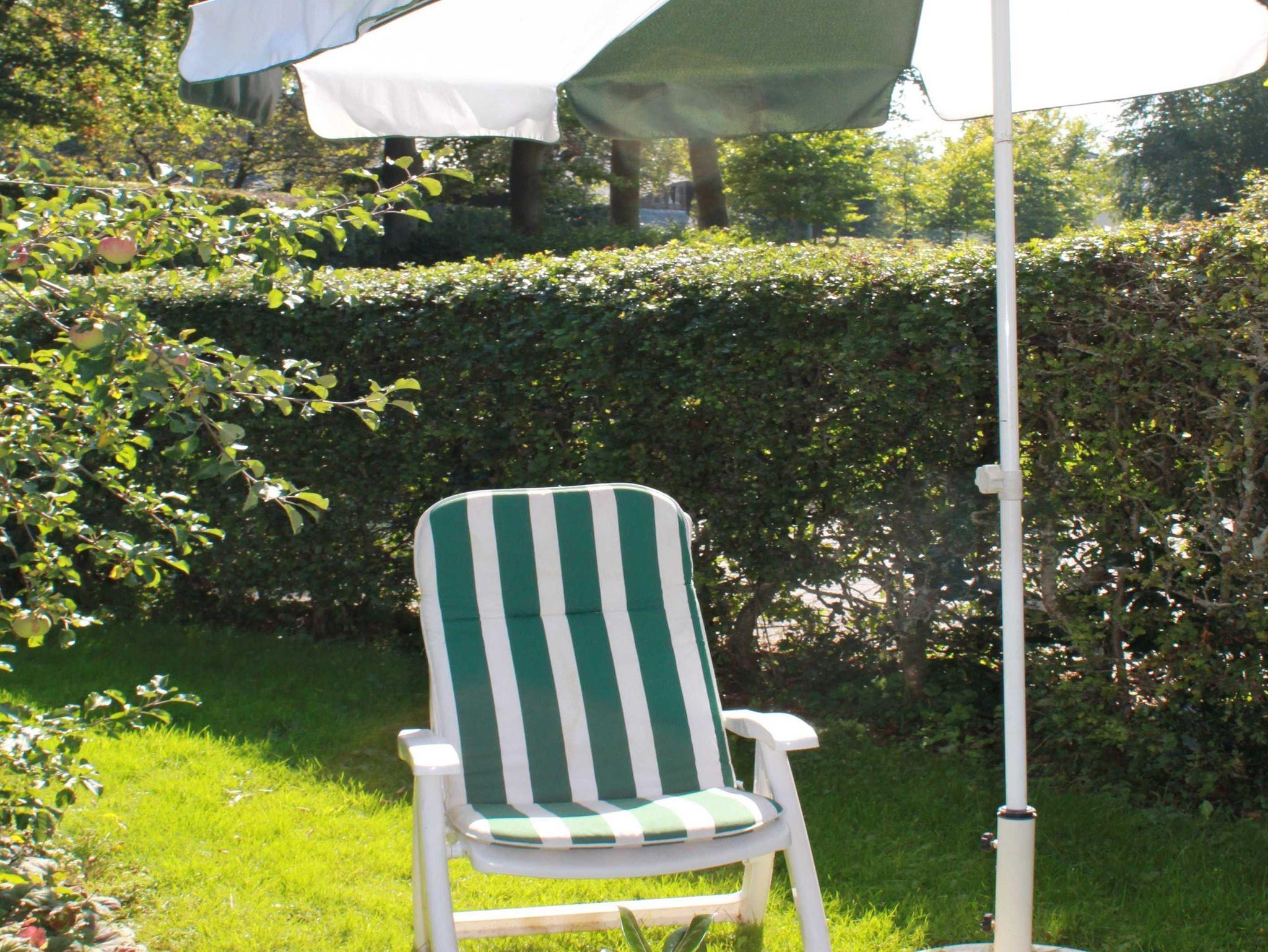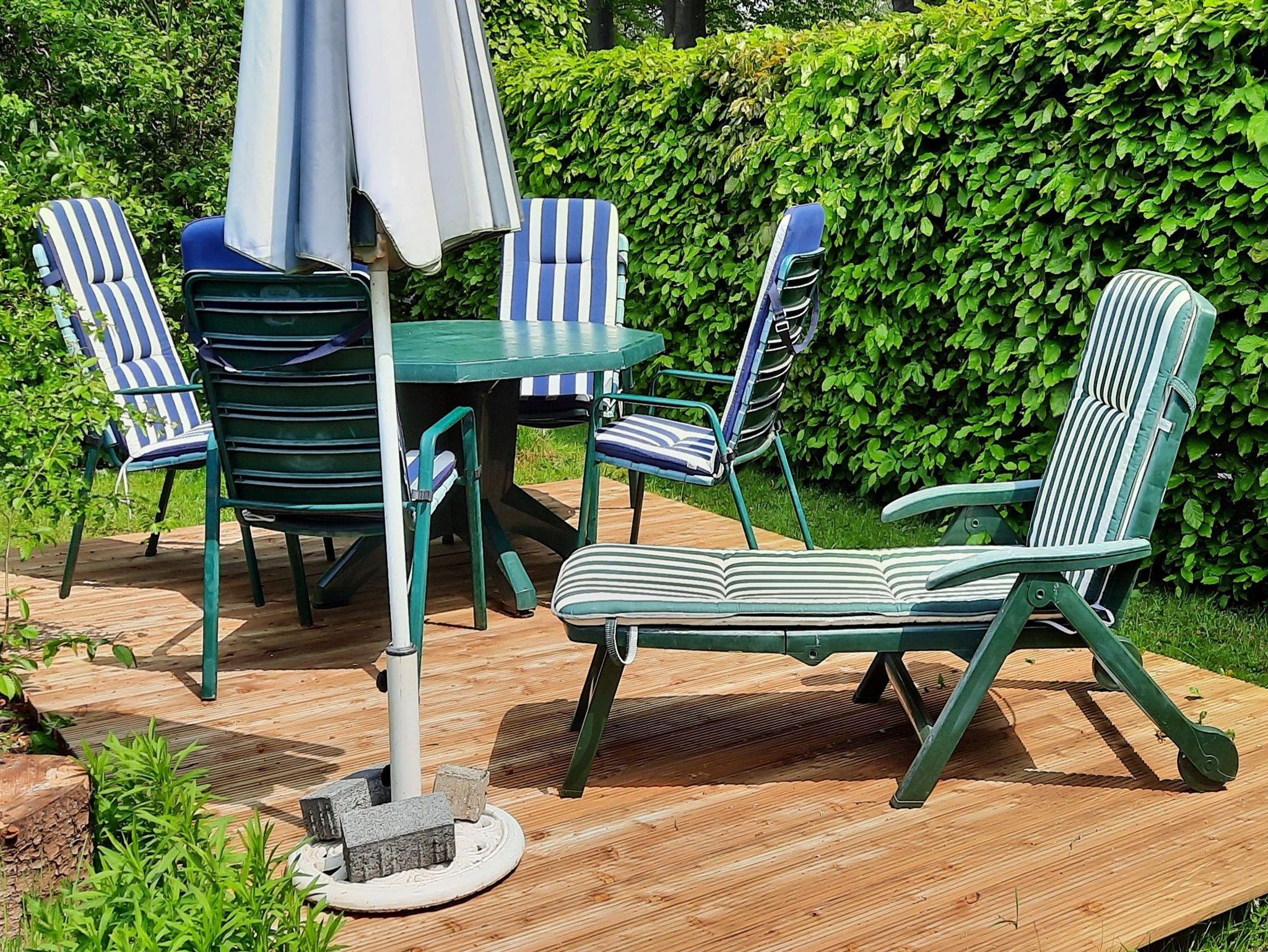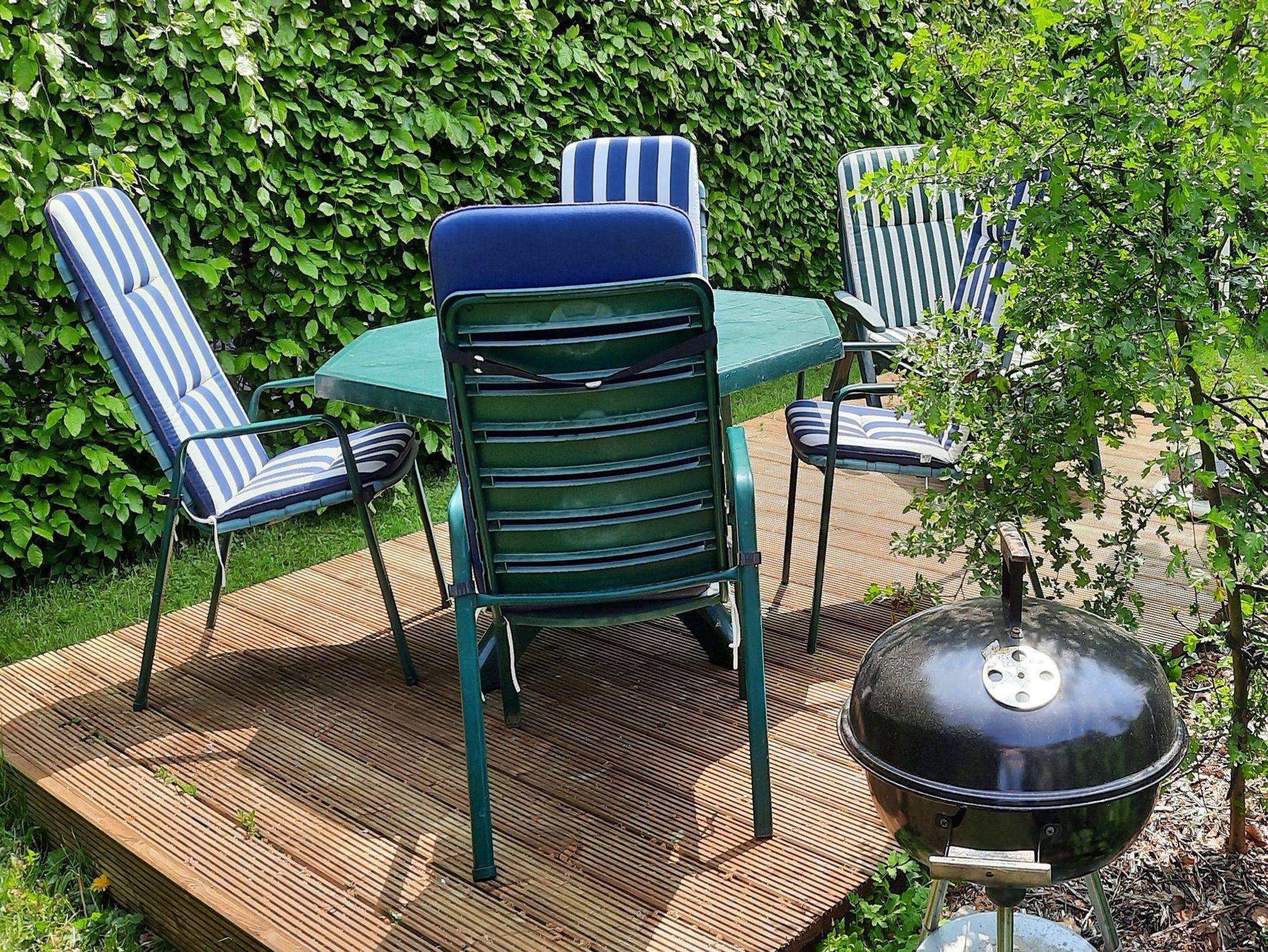 Kleiner Garten mit Gartenmöbeln und Sonnenschirm