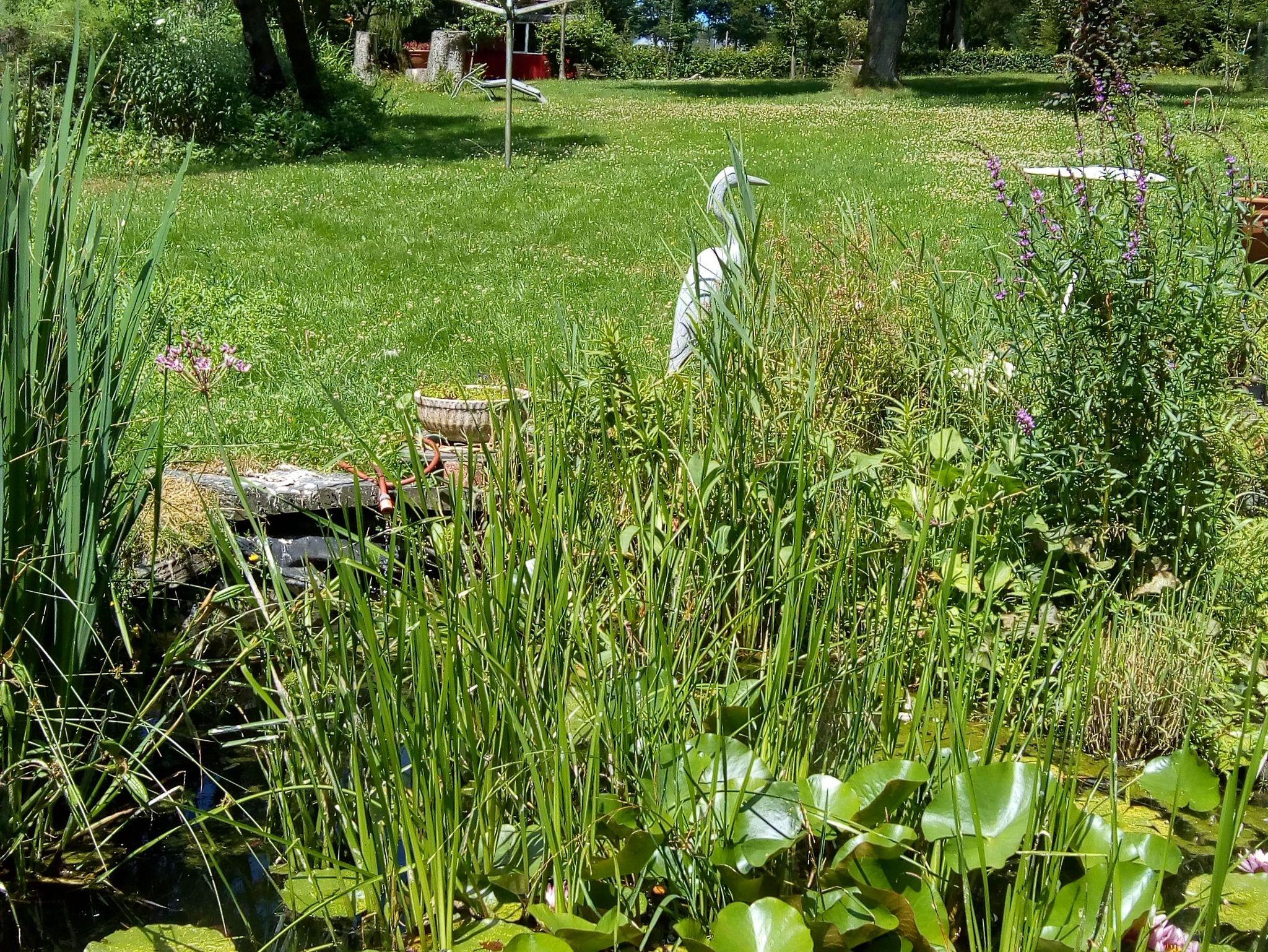 Der große Garten steht insgesamt zur Verfügung, er bietet Sitzflächen, Grillplatz, Gartenteich, Rasenflächen und Baumgruppen.
