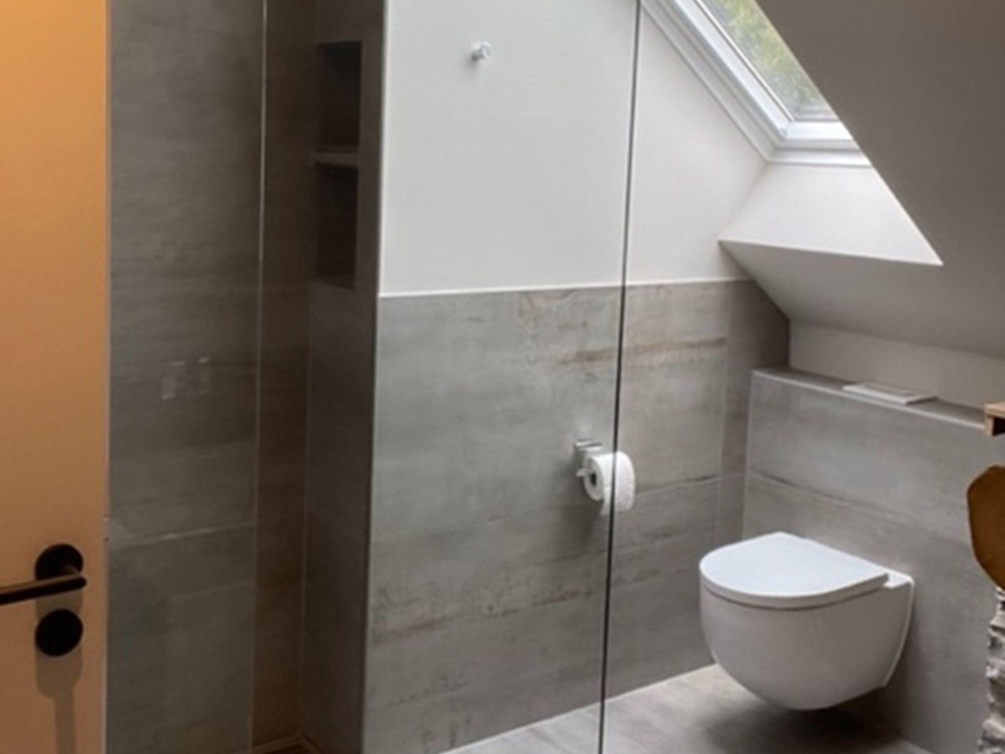 modernes Bad mit Dusche, Badewanne, WC und Waschbecken (OG)