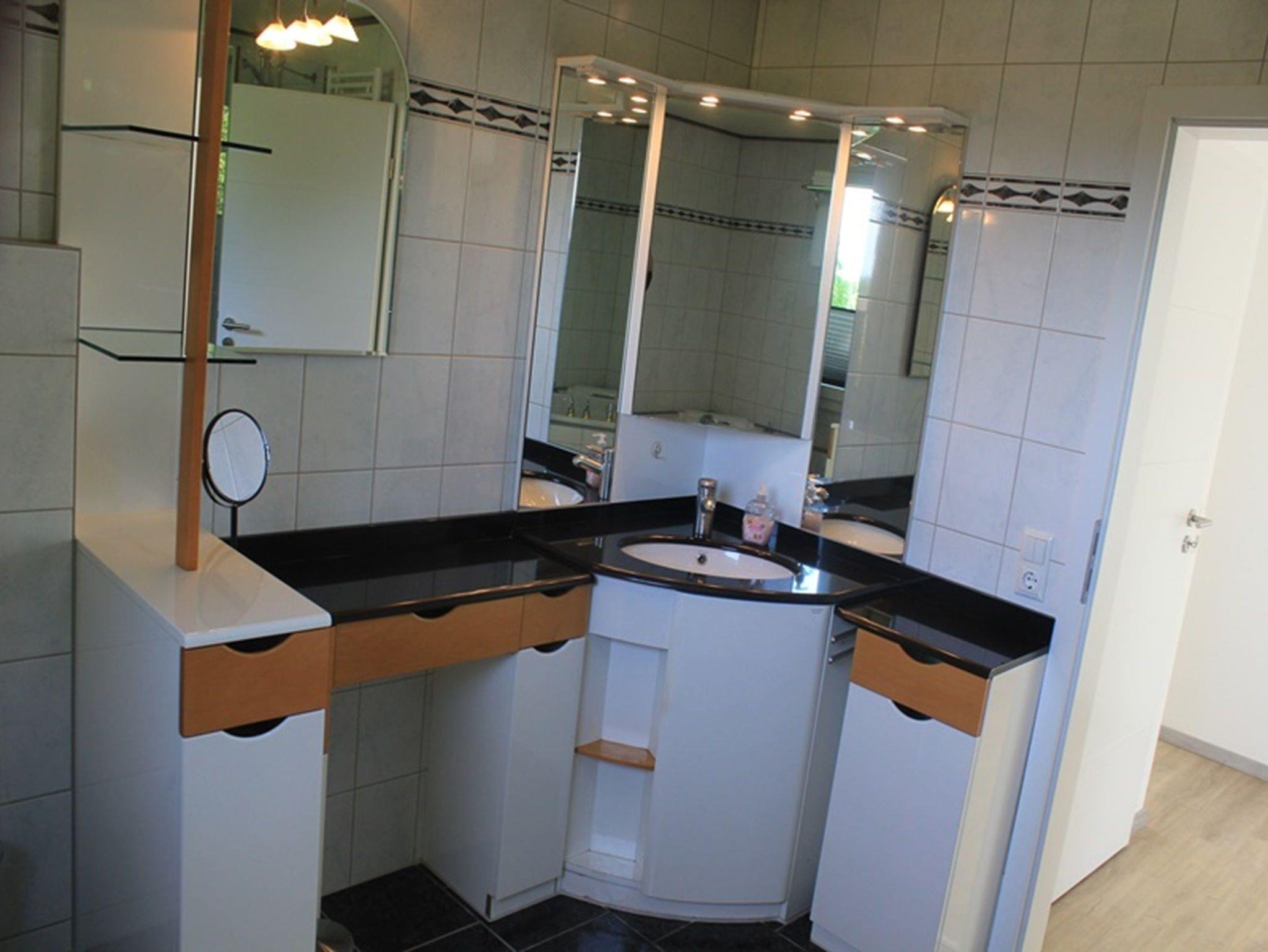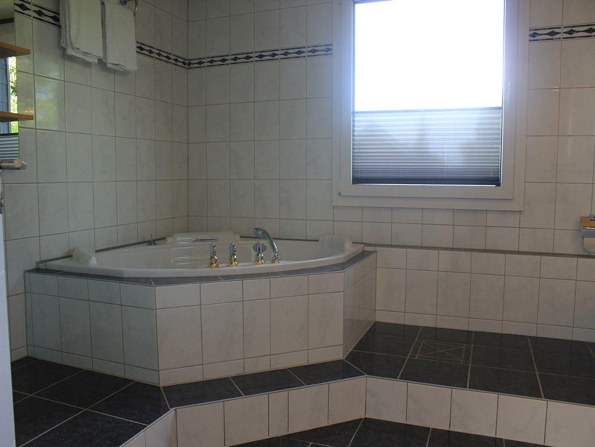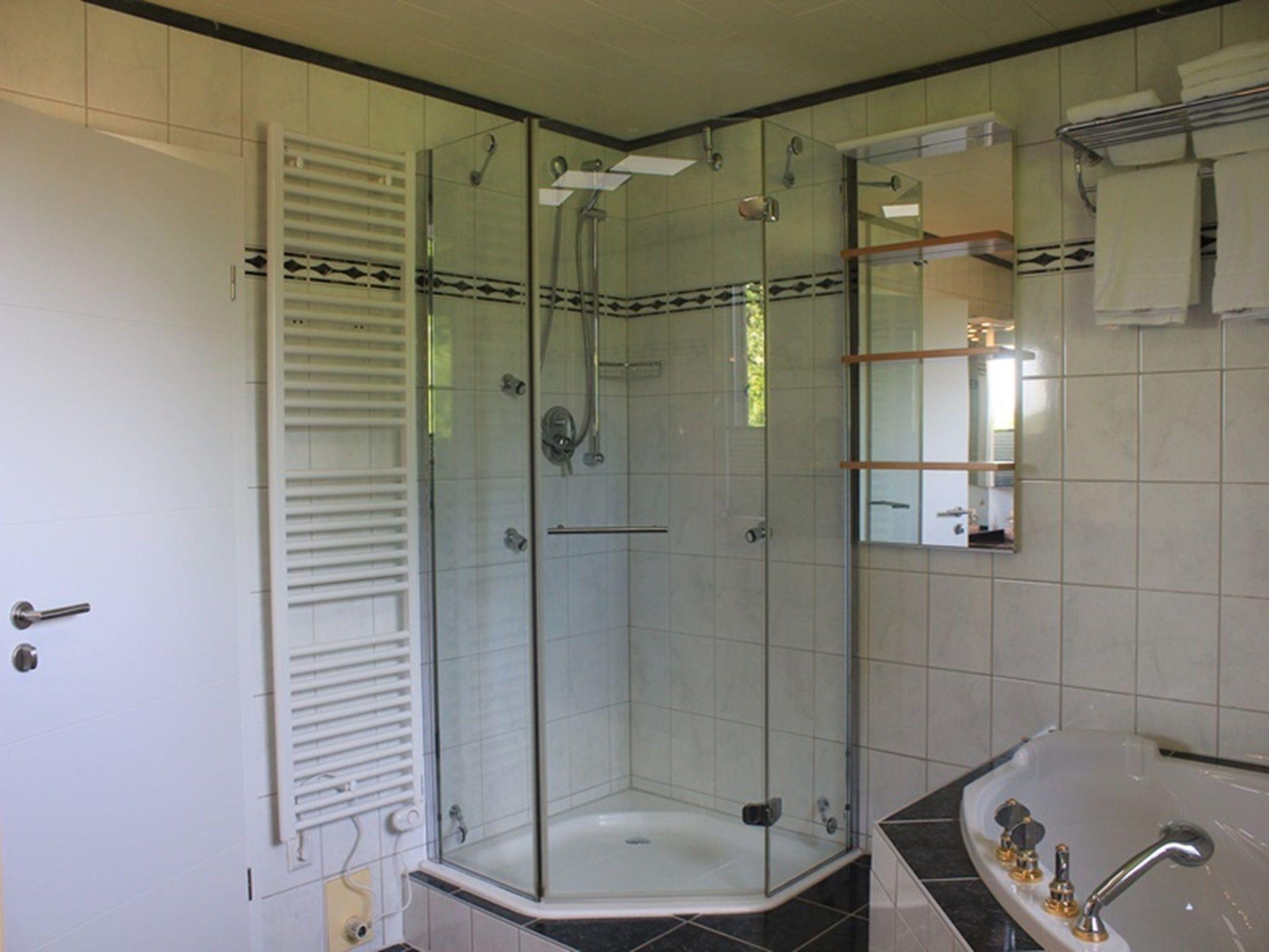 Das Bad im verfügt über ein WC, eine Dusche, eine Badewanne und über einen großen Waschtisch.