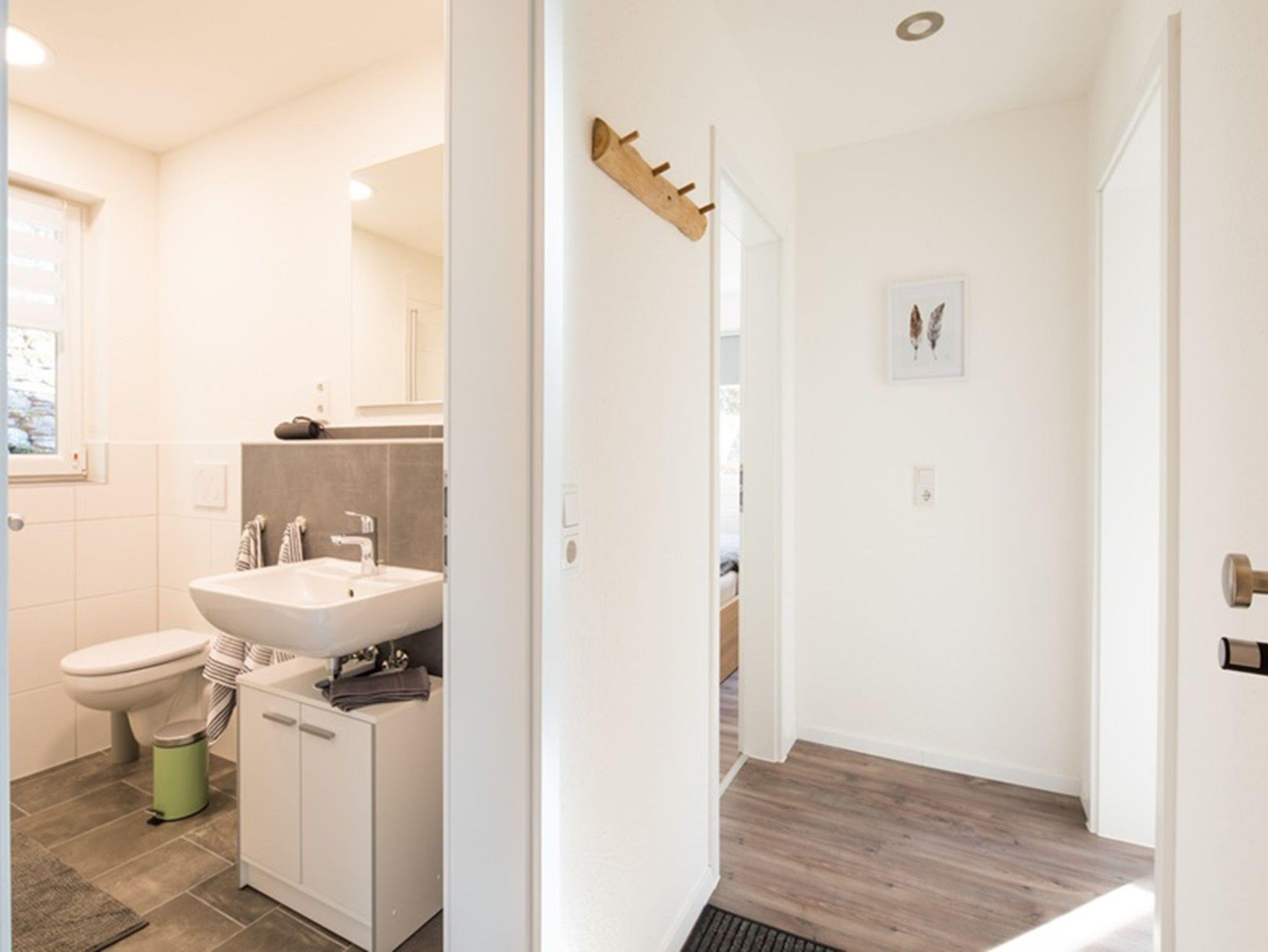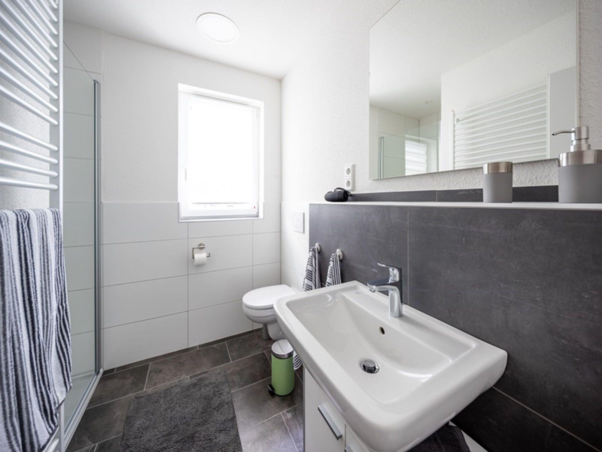 Das moderne Bad bietet ein WC, Waschbecken und Dusche.