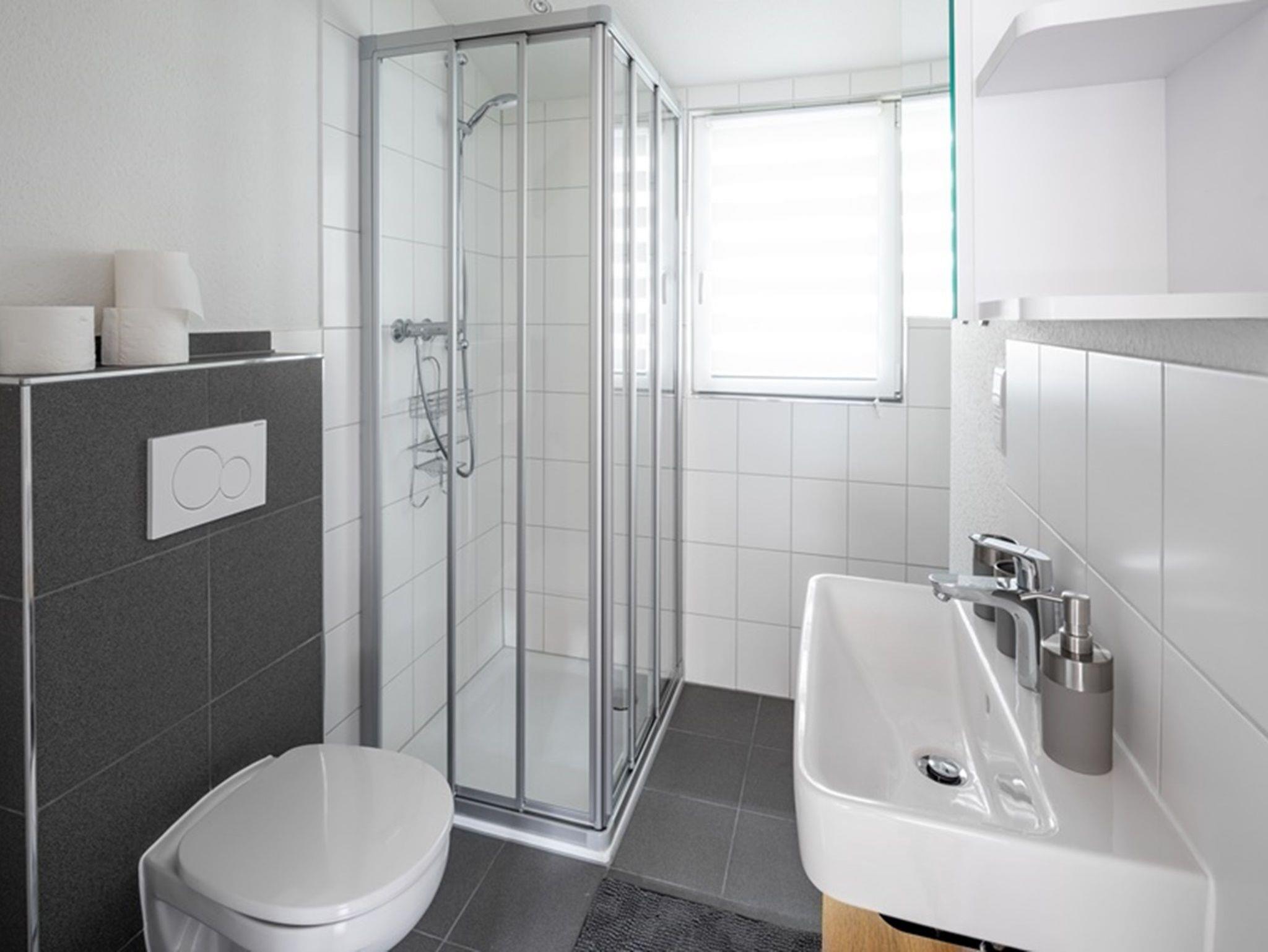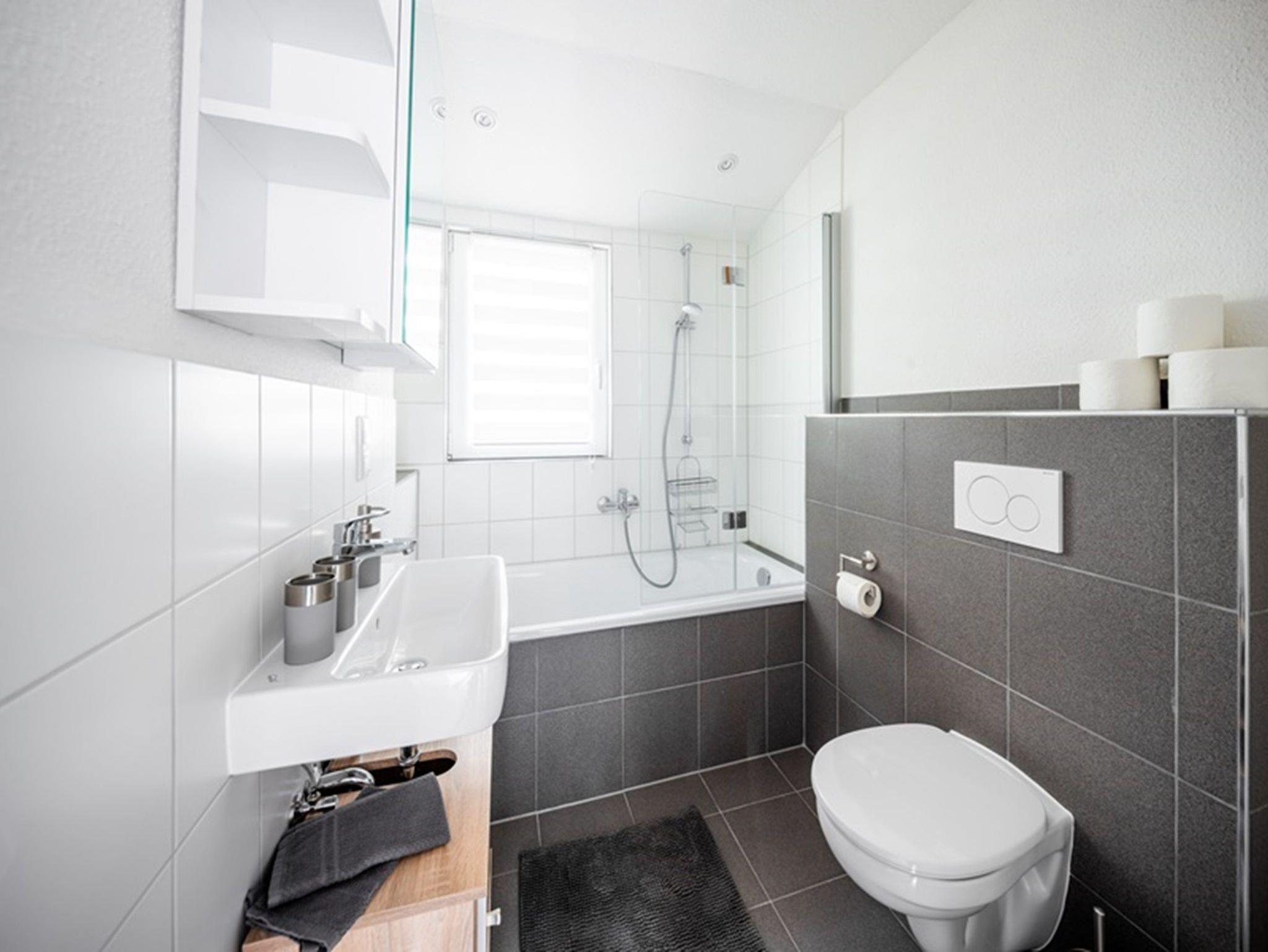 Beide modernen Bäder bieten jeweils 1 WC und Waschbecken. Ein Bad verfügt über eine Dusche und das zweite Bad über eine Badewanne.