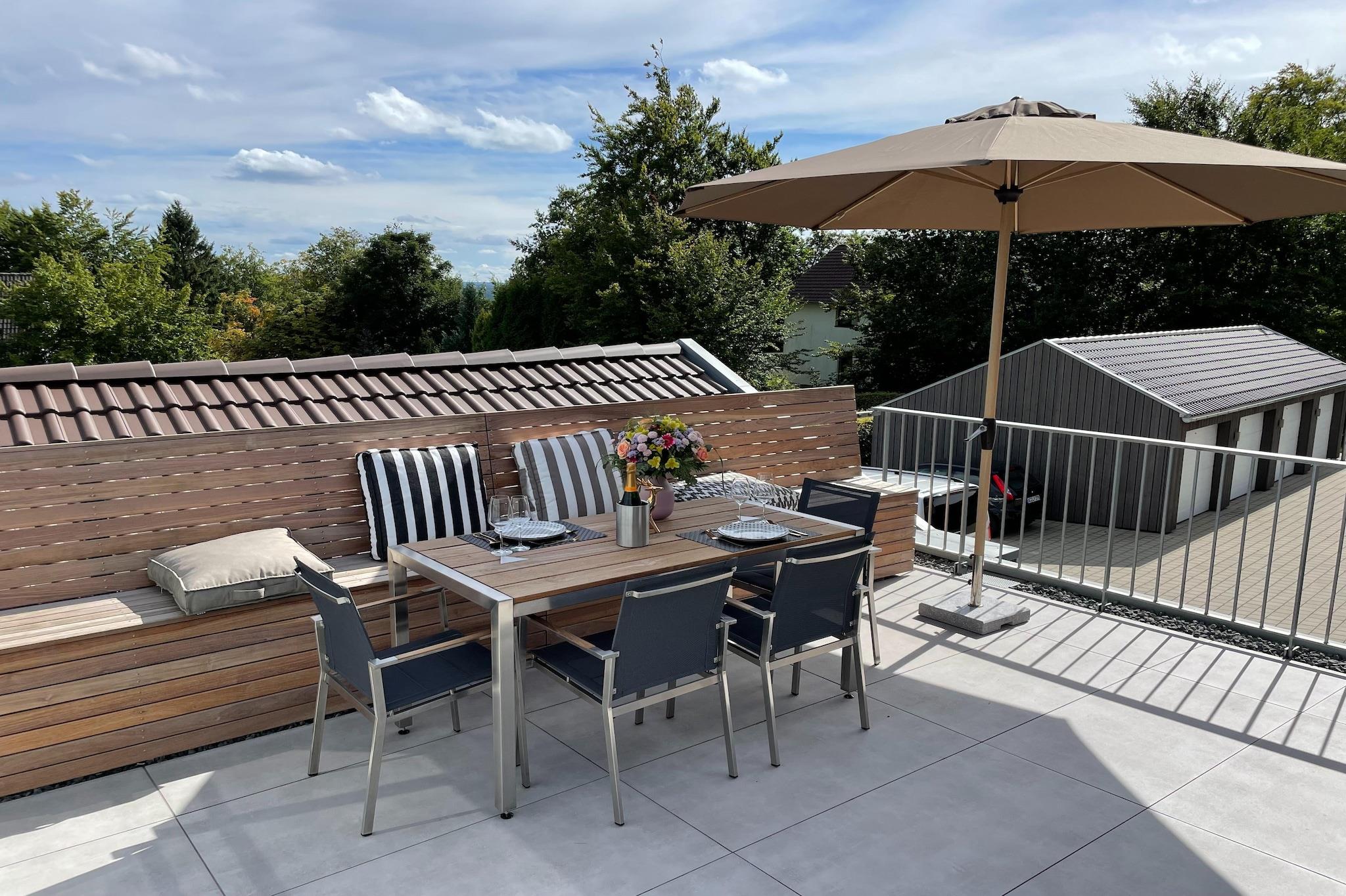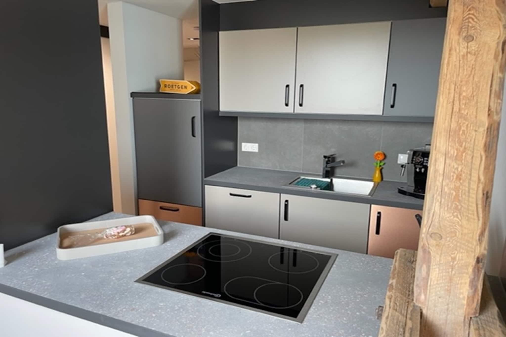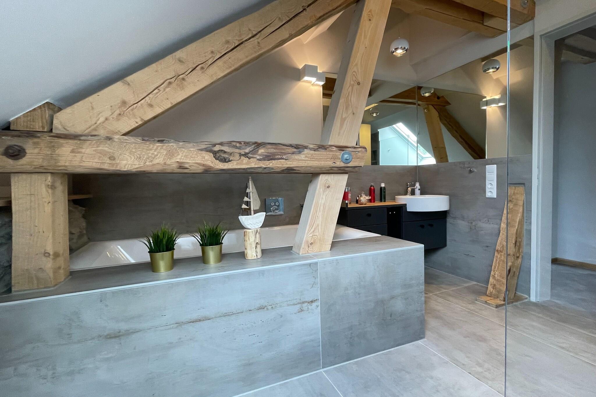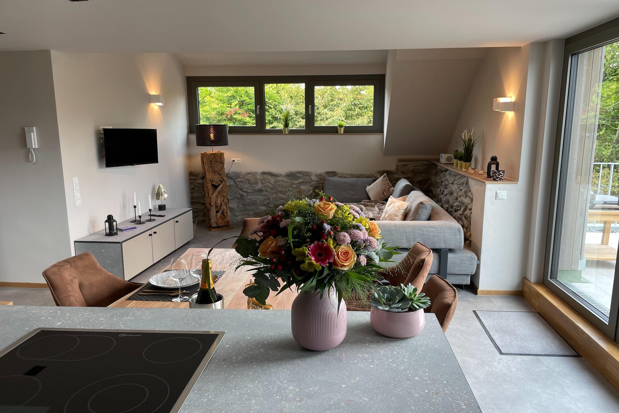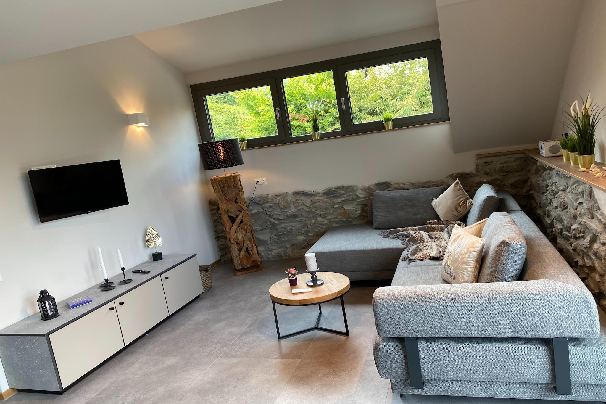 Monschau i Eifel og dette stilfulde og moderne feriehus inviterer dig til et behageligt og afslappende ophold. Par, venner og familier kan slappe af i den fælles sauna eller nyde den smukke udsigt over engene og byen fra den rummelige terrasse. Lejligheden ligger i bydelen Mützenich i Monschau, som er kendt for sit middelalderlige centrum med bindingsværkshuse, sine smalle brostensbelagte gader og slottet. Eifel Nationalpark med mange vandrestier ligger i nærheden af byen. Du kan også starte direkte fra huset til smukke vandreture og gåture. Lejligheden på over- og loftsetage har et stort køkken-, spise- og opholdsrum med det nyeste udstyr, TV og sovesofa, som støder op til den skønne terrasse udstyret med havemøbler. Cykler kan parkeres og elcykler oplades i den eksisterende carport.