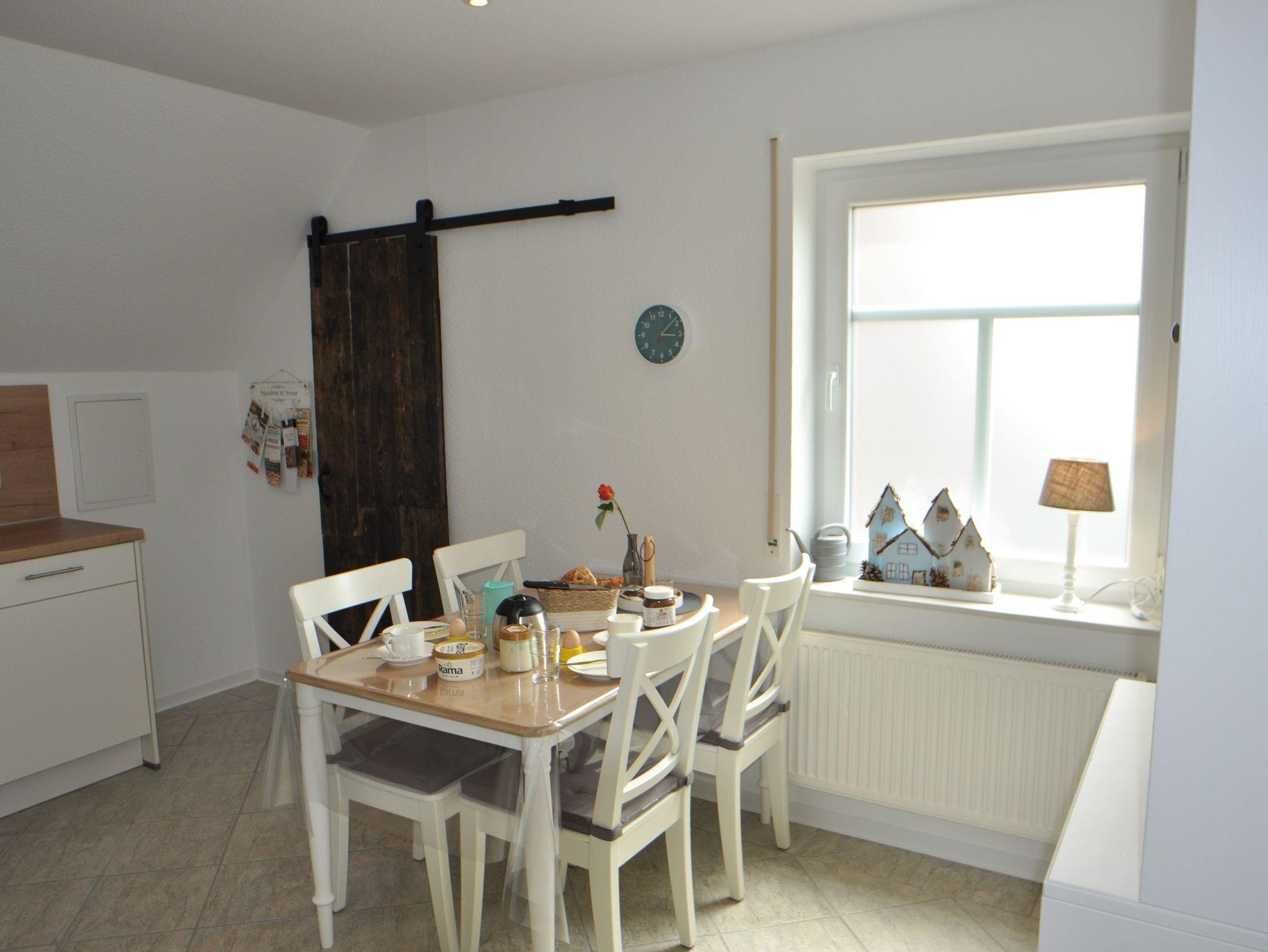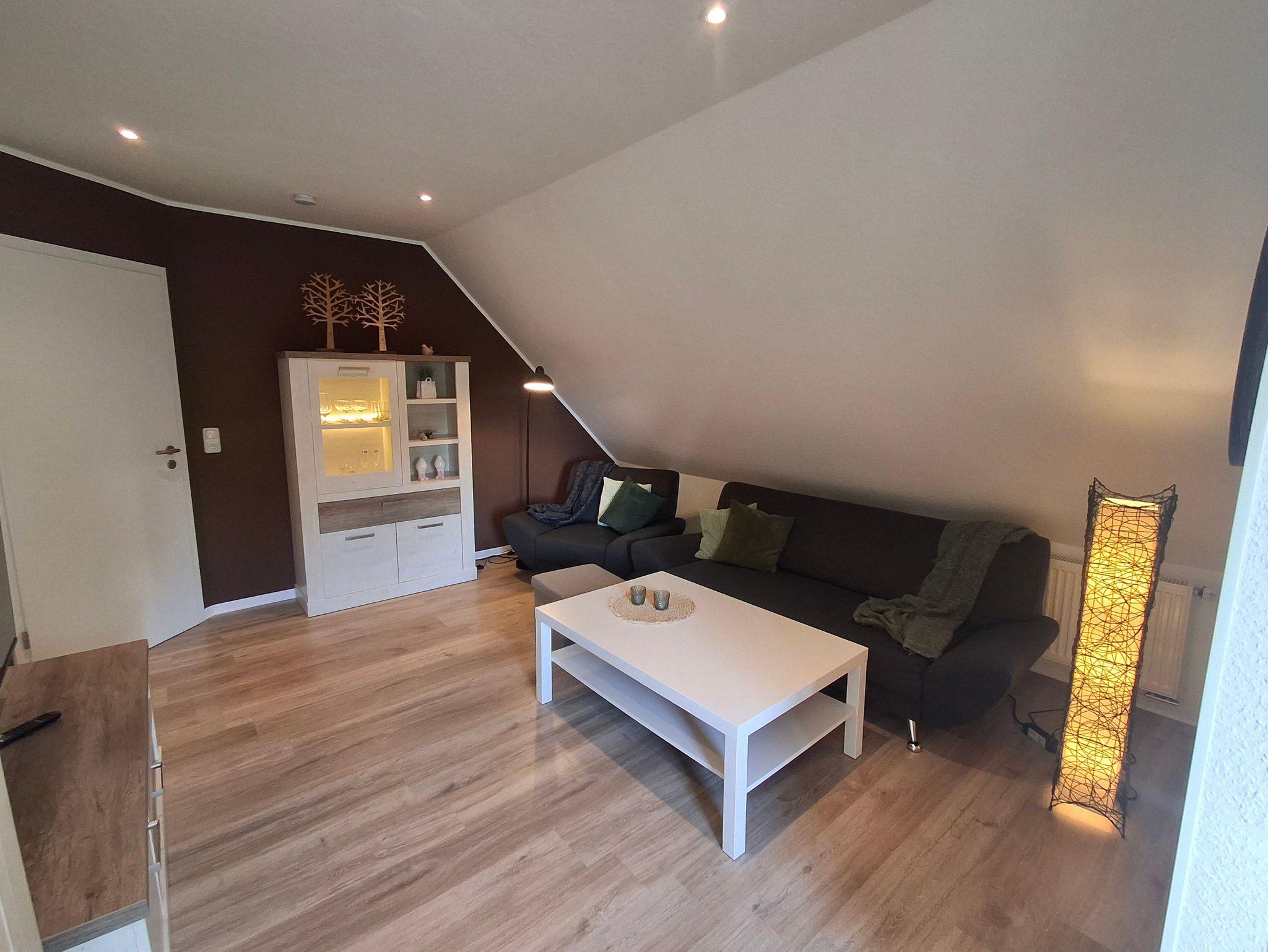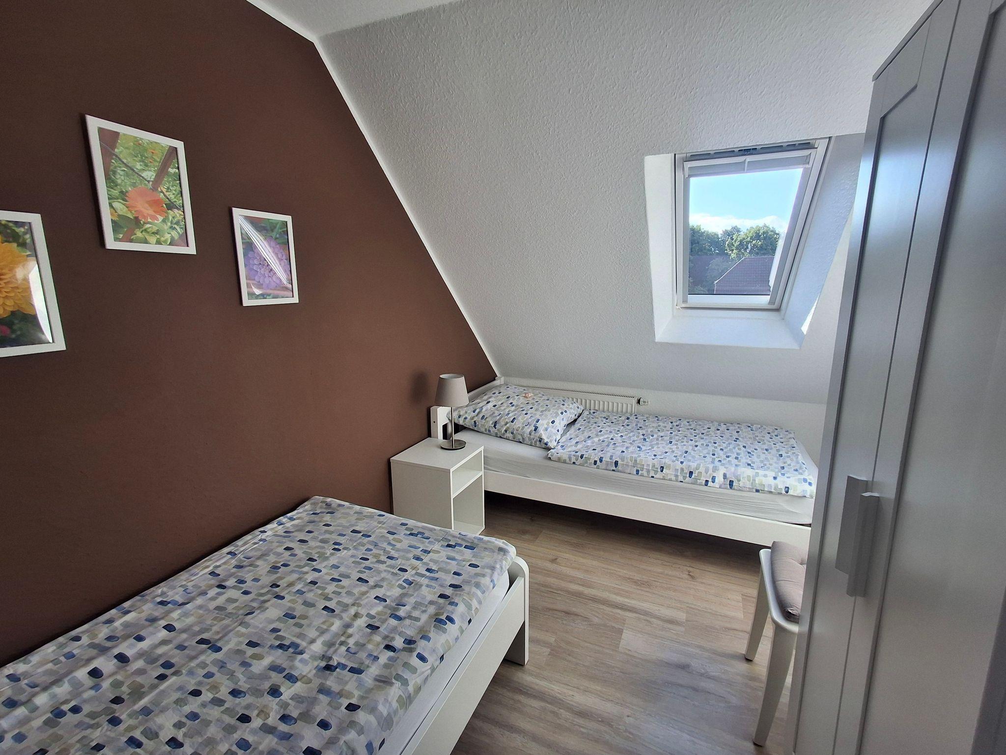 70 qm große Ferienwohnung im Obergeschoss für vier Personen. Anfang 2022 renovierte, modern und mit viel Liebe zum Detail eingerichtete helle Räume. Ihnen stehen ein Schlafzimmer mit französischem Bett (1,60 x 2 m) sowie ein Schlafzimmer mit zwei getrennt stehenden Betten (0,90 x 2 m) zur Verfügung. In der hellen Küche mit voll ausgestatteter Küchenzeile und Essbereich können Sie morgens ausgiebig frühstücken und ruhig und erholt in den Tag starten. Das Wohnzimmer bietet Ihnen eine gemütliche Sofa-Garnitur mit Flachbild-Fernseher. Das Badezimmer ist mit einer ebenerdigen Dusche und einem WC ausgestattet.