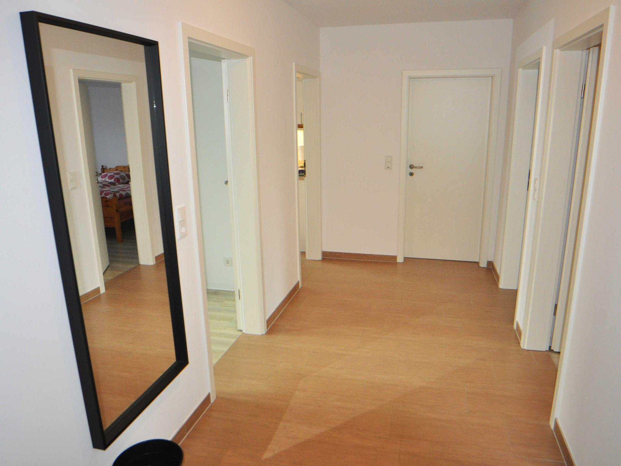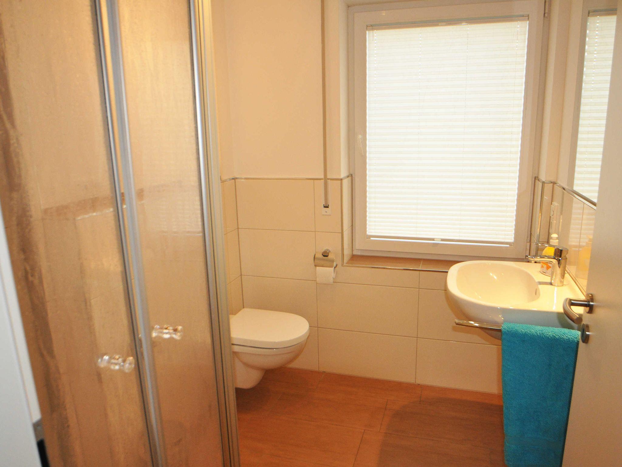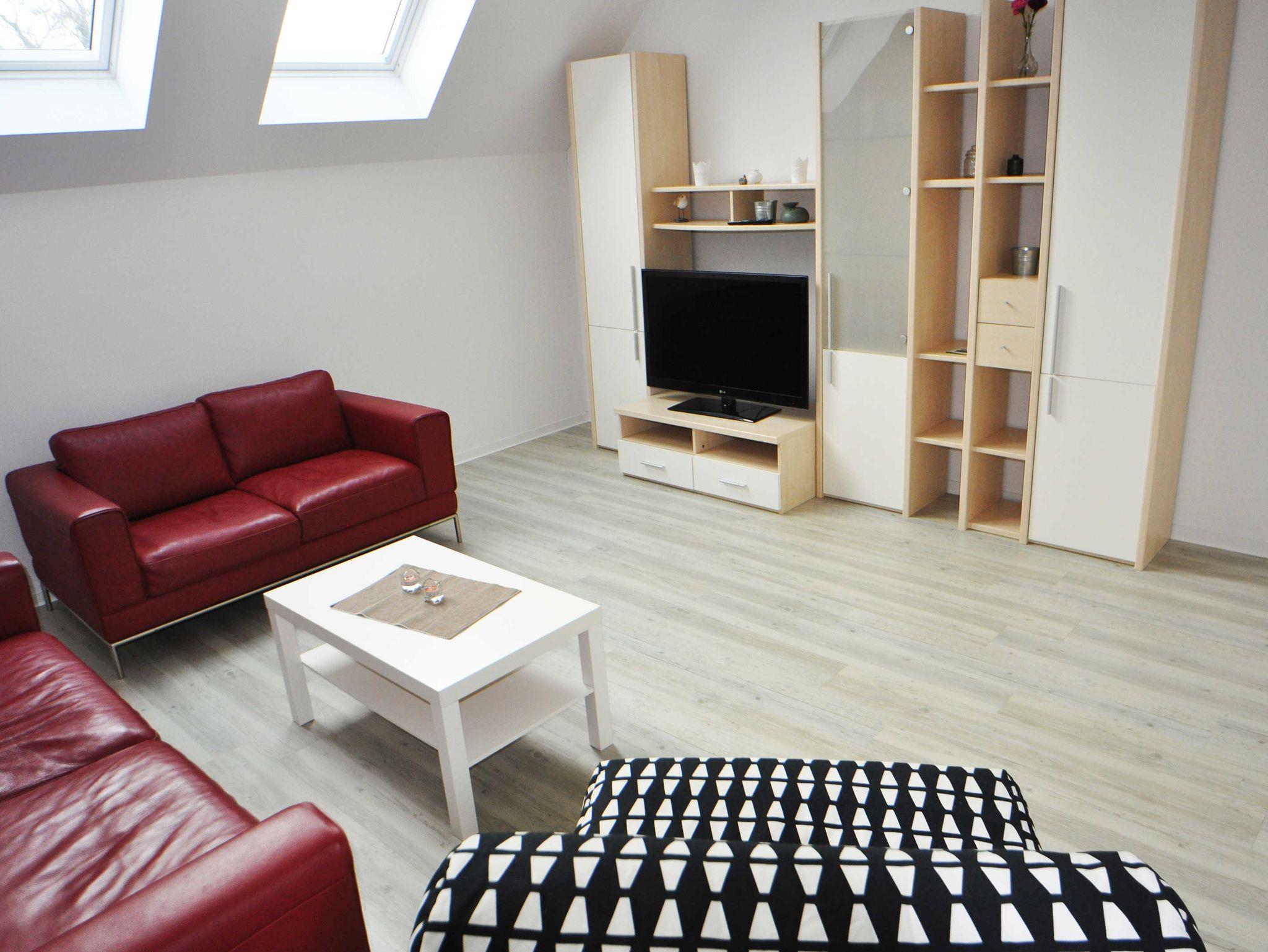 Die Wohnung im Obergeschoss verfügt über ein Schlafzimmer mit Doppelbett, ein Schlafzimmer mit Einzelbett, ein Badezimmer mit Dusche und WC, eine Küche (Küchenzeile mit E-Herd, Geschirrspülmaschine, Kühlschrank mit Gefrierfach, Wasserkocher und Kaffeemaschine) sowie ein Wohnzimmer mit moderner Ledergarnitur, Sessel mit Schlaffunktion und TV. Von der Küche aus ist der Balkon erreichbar. Balkonmöbel sind vorhanden.