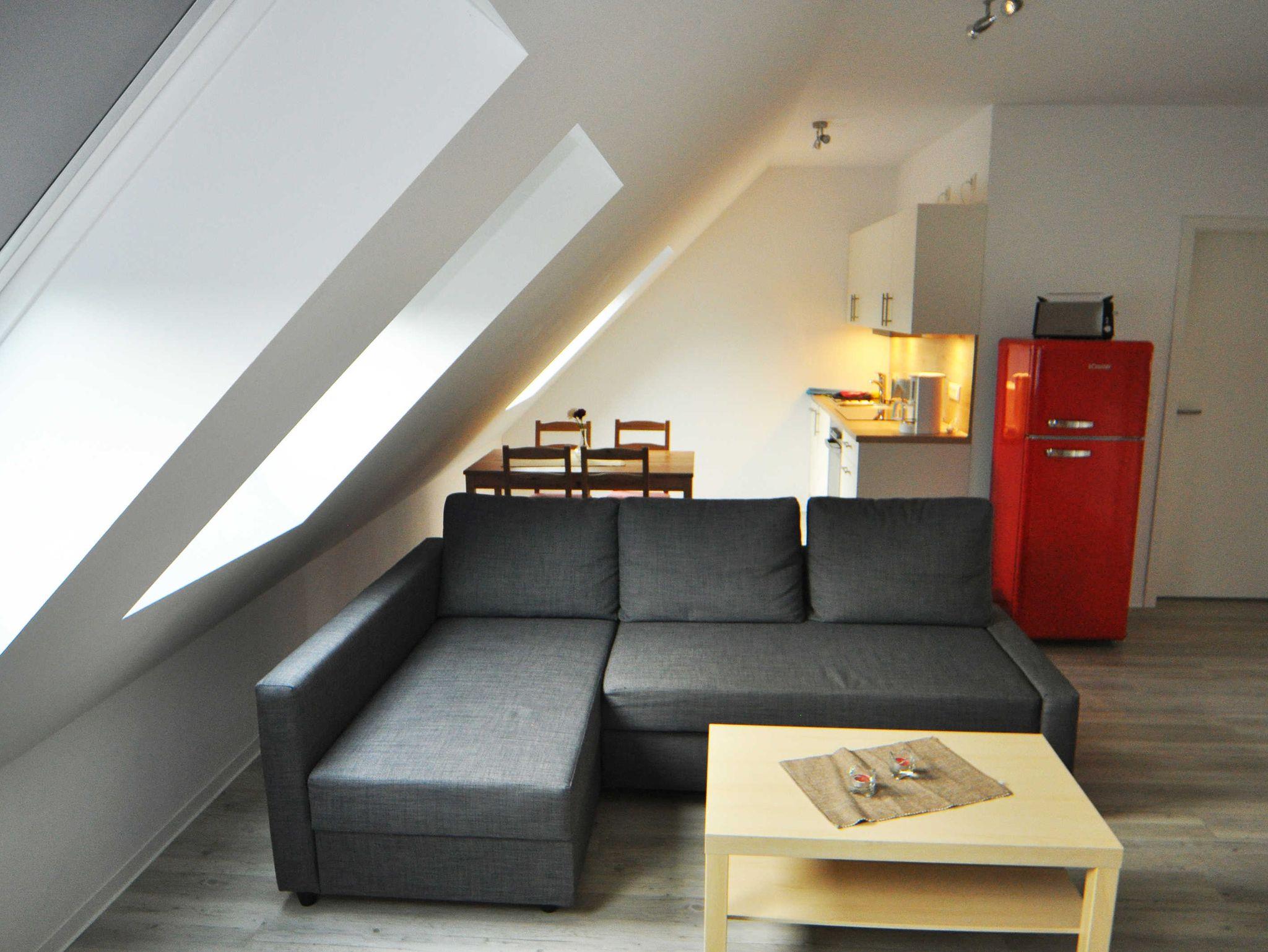 Die Wohnung im Dachgeschoss verfügt über ein Schlafzimmer mit Doppelbett, ein Schlafzimmer mit Einzelbett, ein Bad mit Dusche und WC sowie eine Wohnküche mit Küchenzeile (E-Herd, Geschirrspülmaschine, Kühlschrank mit Gefrierfach, Kaffeemaschine, Wasserkocher), gemütlichem Sofa mit Schlaffunktion und TV.