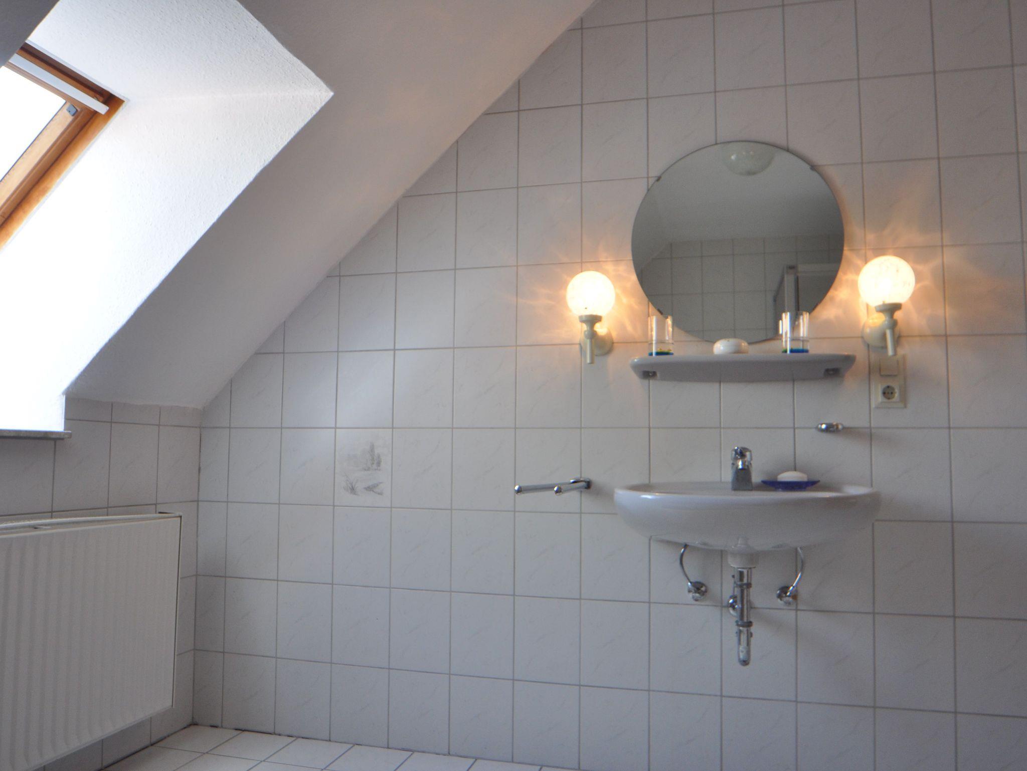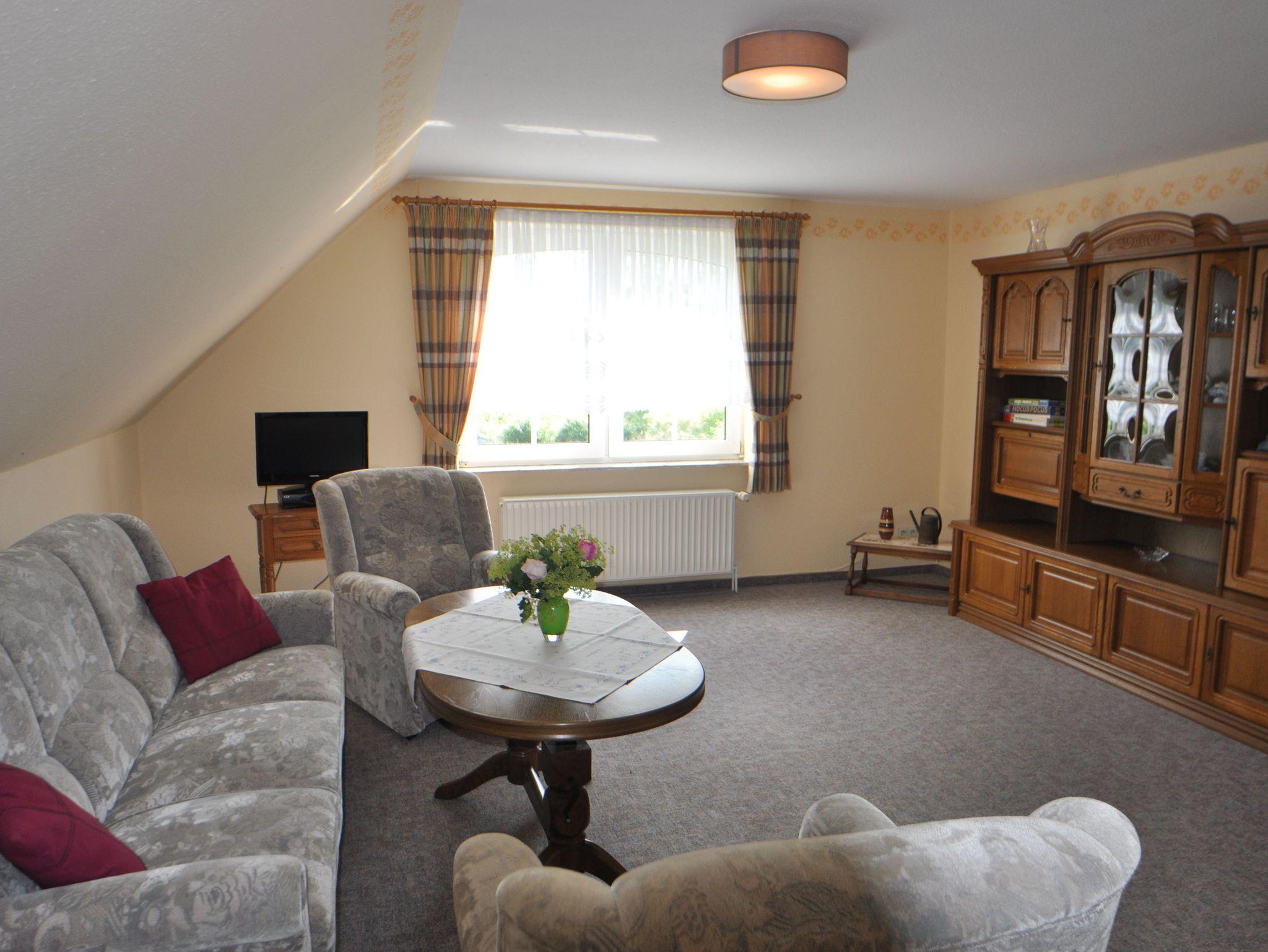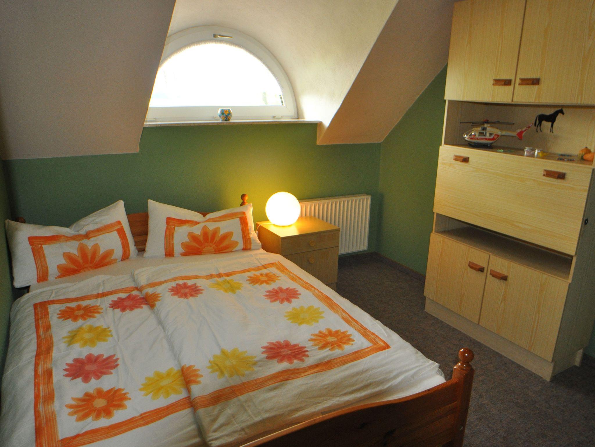 100 Quadratmeter große Oberwohnung mit großzügigen Räumen für 2-4 Personen. Separate voll ausgestattete Küche mit Essbereich, Badezimmer mit Dusche und WC, Wohnzimmer mit Couchgarnitur und TV sowie ein Doppelzimmer mit Doppelbett und ein Einzelbett mit französischem Bett (1,40 m x 2 m).