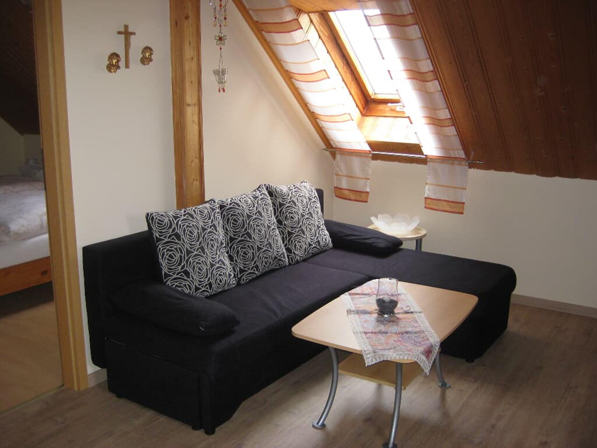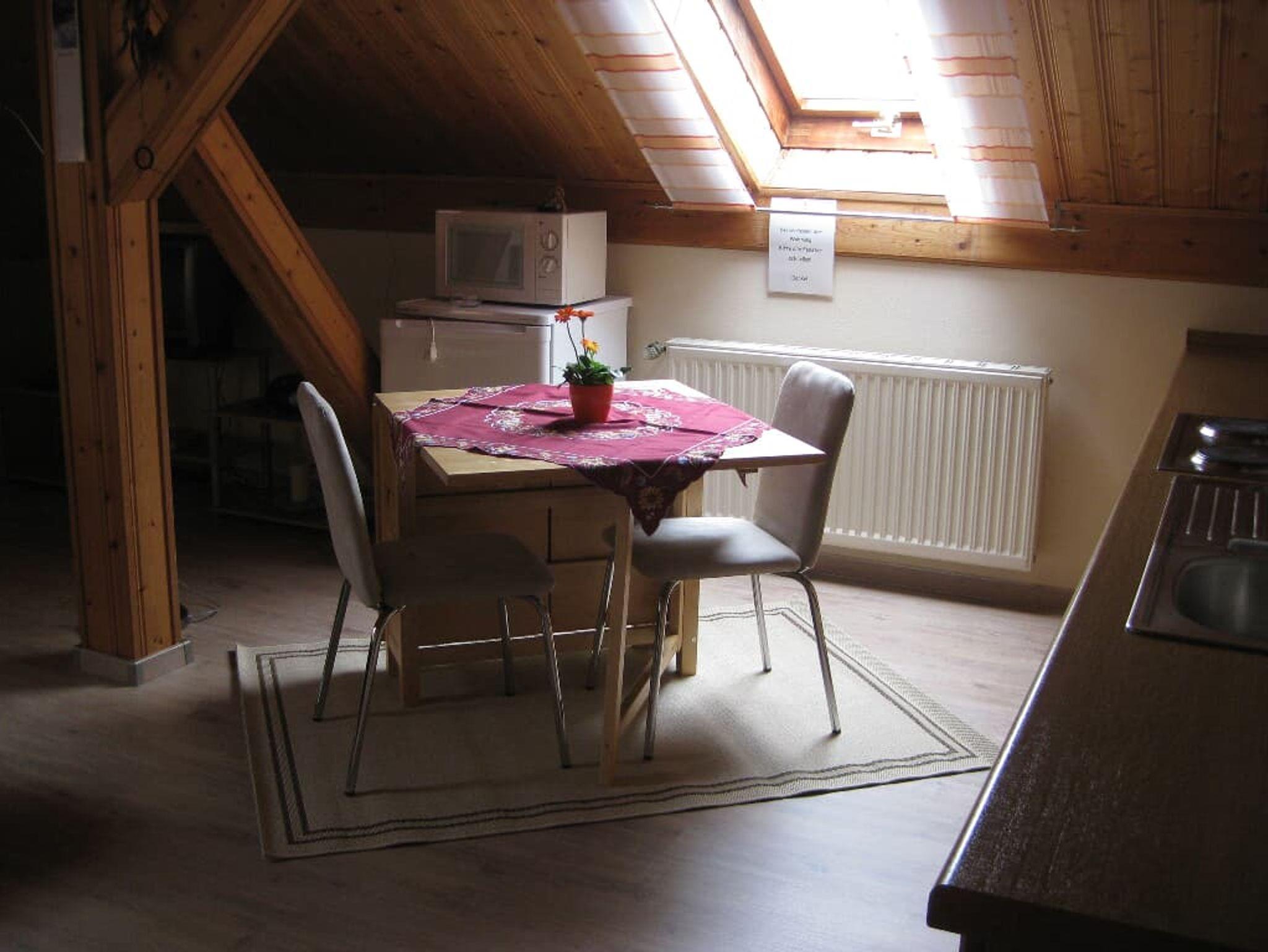 Unsere gemütliche Dachwohnung verfügt über ein Schlafzimmer, Bad mit Dusche/WC mit Hand- Badetücher Wechsel 1x wöchentlich, Wohnküche mit ausziehbarer Couch. Die Küche ist ausgestattet mit: Elektroherd,Backofen,Mikrowelle, Kaffeemaschine,Wasserkocher,Eierkocher, Toaster, Brotmaschine, Kühlschrank, Töpfe, Pfannen, Schüssel, Besteck, Geschirrtücher, Geschirr. Haustiere auf Anfrage. WLAN