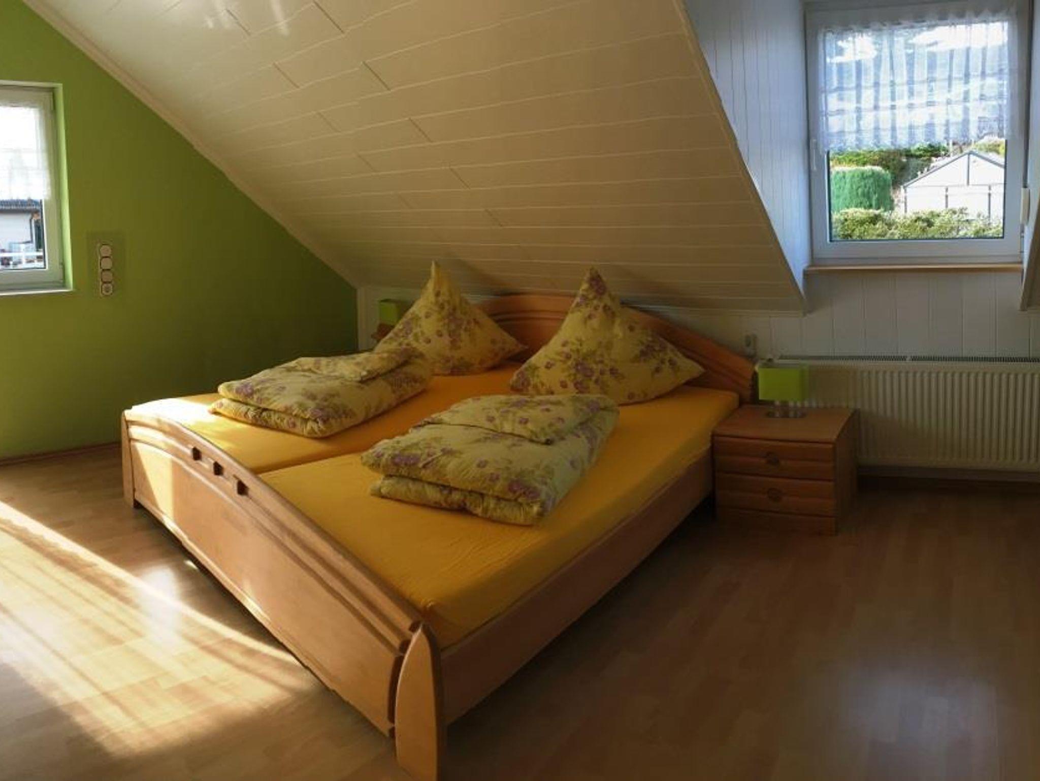 Ferienwohnung im schönen Hunsrück, sonnige Südhanglage mit sehr schöner Aussicht über den Hochwald. Modern und komplett eingerichtet bis zu 6 Personen. Die Ferienwohnung im Dachgeschoss von dem Einfamilienhaus ist modern und freundlich eingerichtet, und mit ihren 85 m² bietet sie viel Platz für einen angenehmen Aufenthalt. Im Wohnbereich gibt es eine große Couch und einen großen Tisch mit 6 bequemen Stühlen. Zur Ausstattung gehört Sat TV, eine STereo-Anlage mit CD und Internet über W-LAN. Die Küche ist komplett eingerichtet, sie verfügt über ein 4 Platten Cerankochfeld, einen Backofen, eine Spülmaschine und einen großen Kühlschrank. Die beiden Schlafzimmer sind hell, die Einrichtung ist wie die Matratzen, Bettdecken und Kissen neuwertig. Das große Bad verfügt über eine Dusche, einen Waschplatz und ein WC. Im Bad gibt es eine Fußbodenheizung, Hand- und Badetücher sind auch vorhanden.