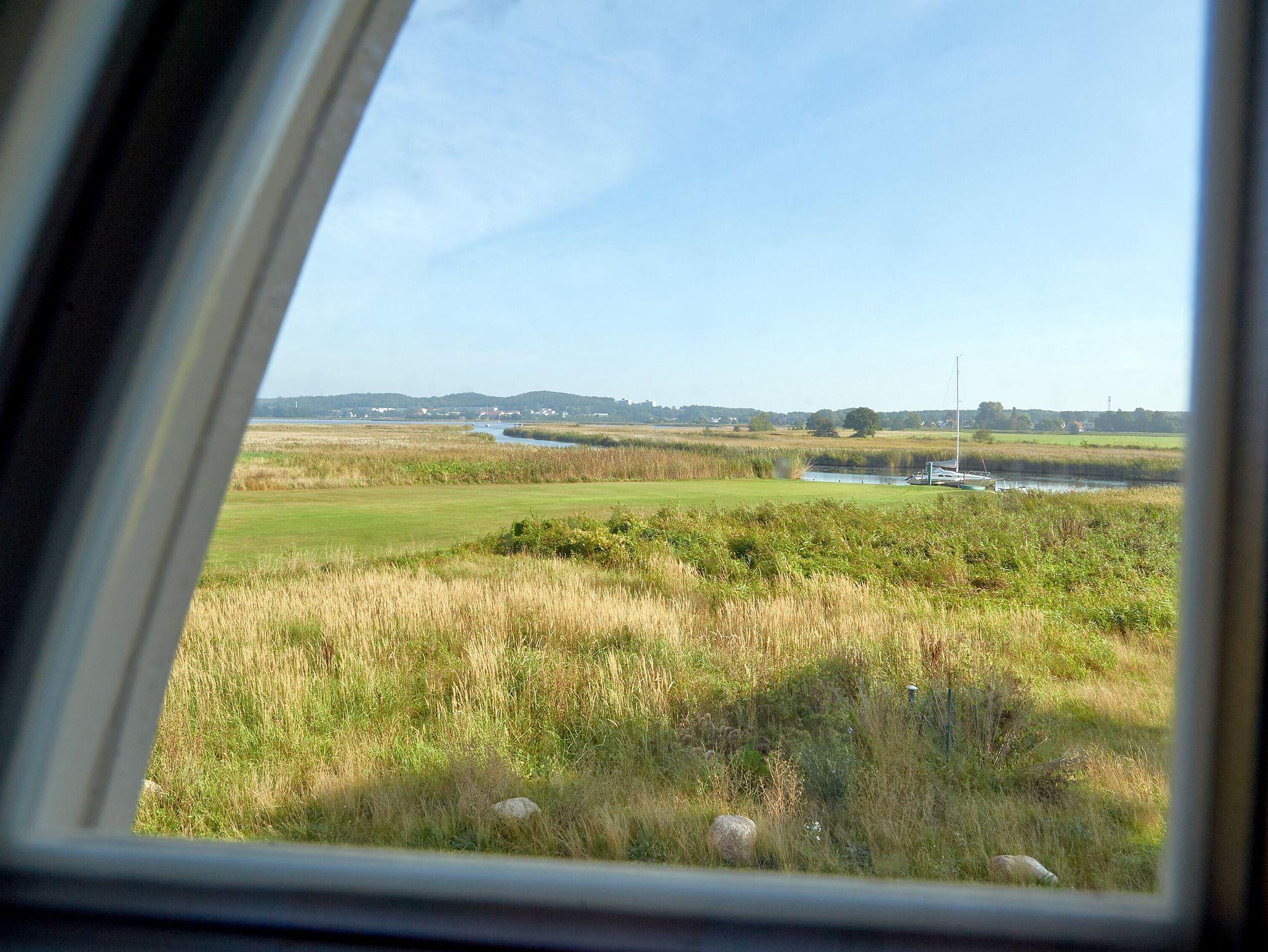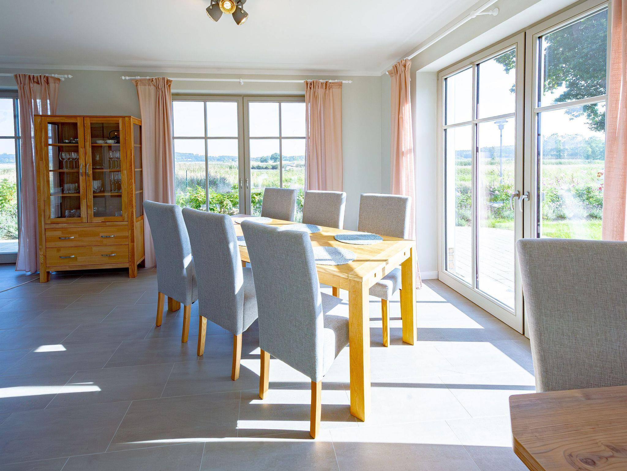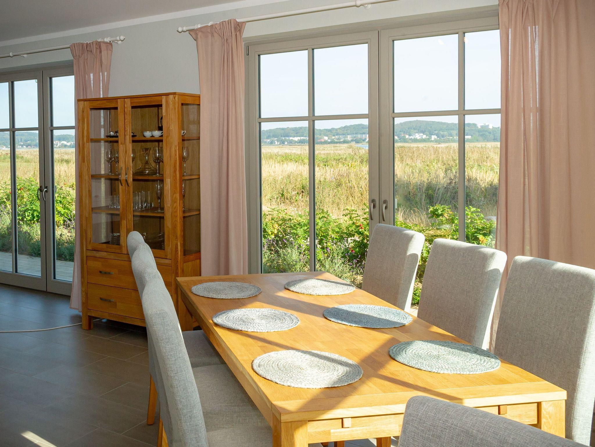 Die bodentiefen Fenster eröffnen einen schönen Blick auf die Wiesen- und Schilflandschaft an der Baaber Bek, die den Selliner See mit der südrügenschen Boddenlandschaft verbindet. Nur einen Katzensprung vom Haus entfernt befindet sich denn auch Rügens wohl kürzeste Fährverbindung, mit der Personen und Fahrräder bequem aufs andere Ufer nach Baabe und weiter in Richtung Mönchgut gelangen können.