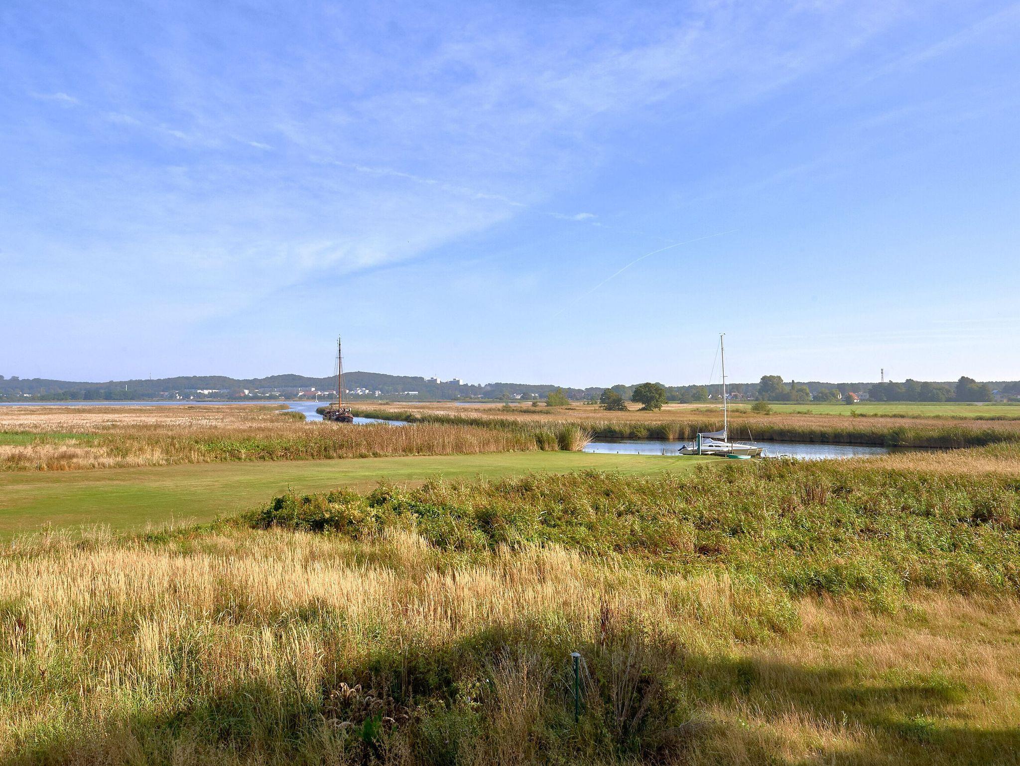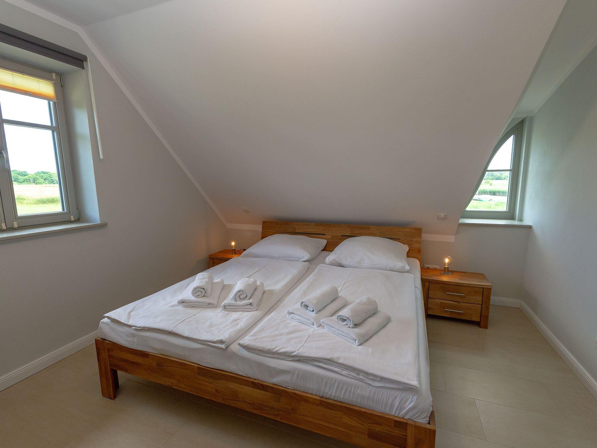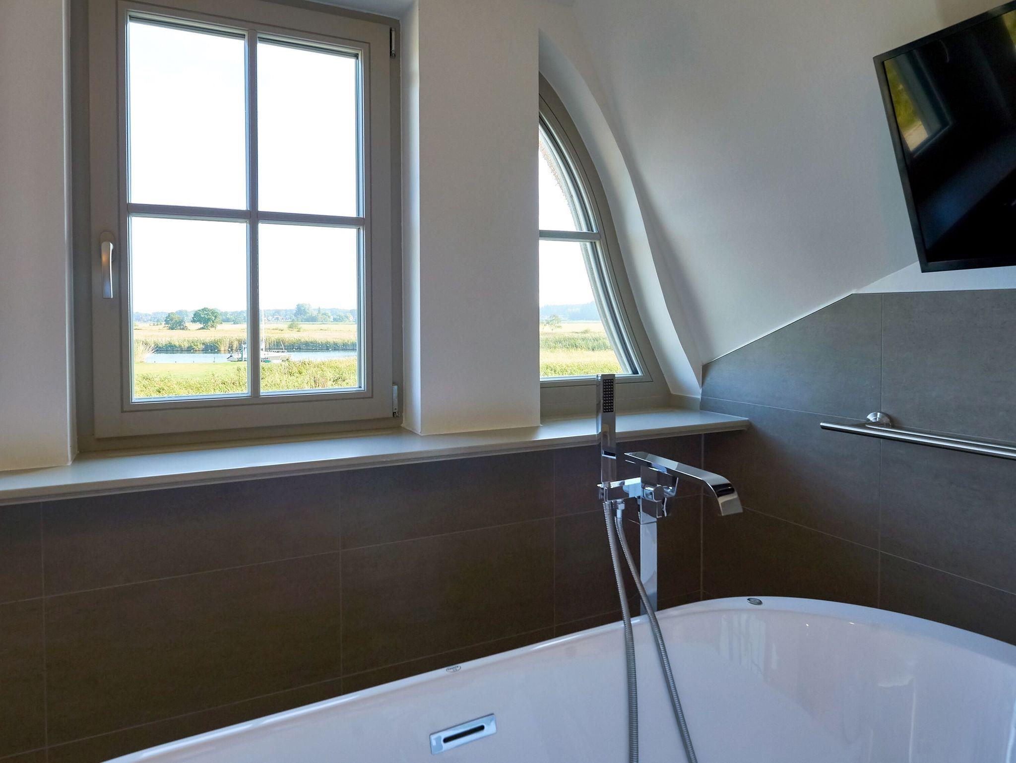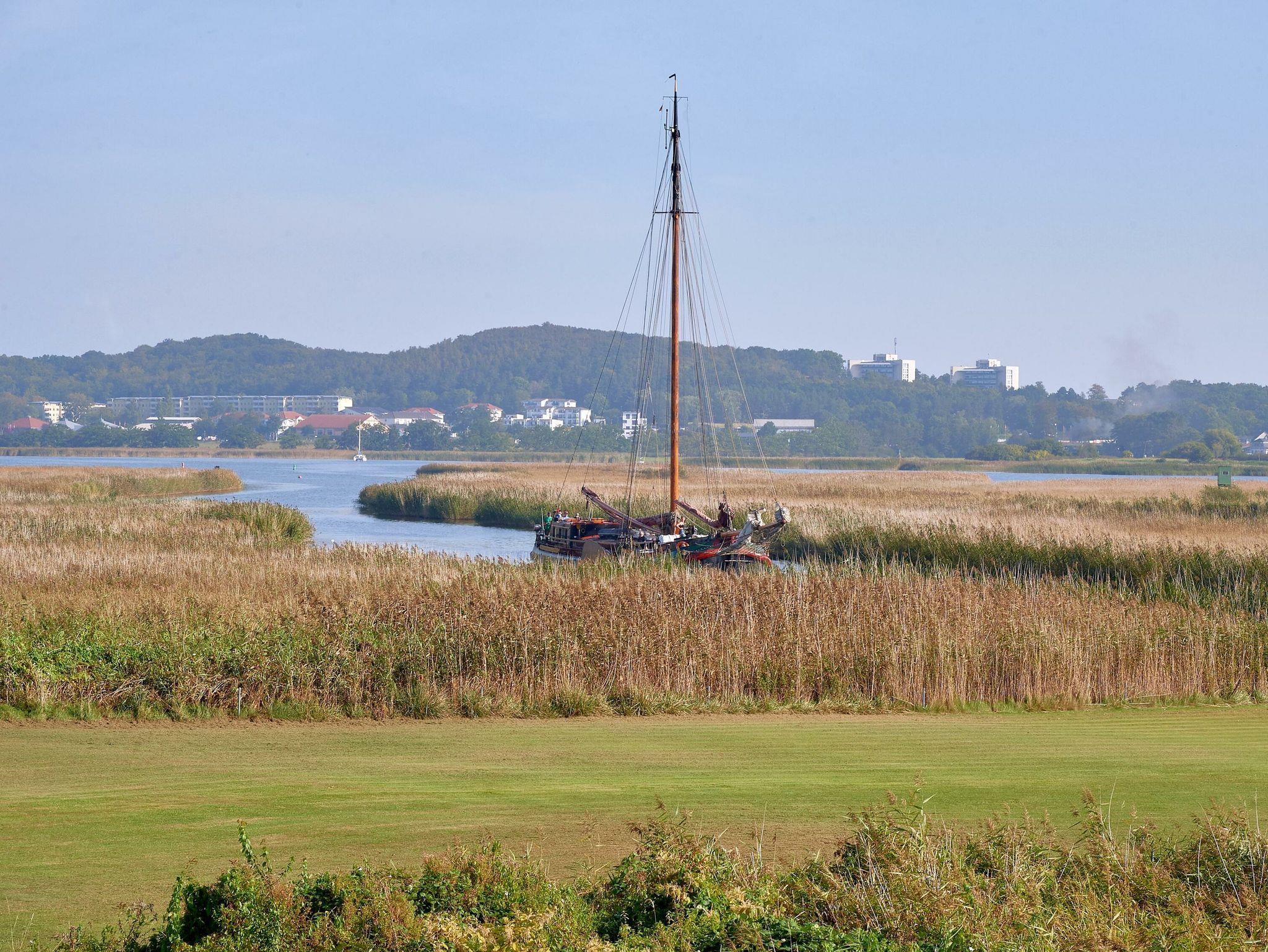 Die bodentiefen Fenster eröffnen einen schönen Blick auf die Wiesen- und Schilflandschaft an der Baaber Bek, die den Selliner See mit der südrügenschen Boddenlandschaft verbindet. Nur einen Katzensprung vom Haus entfernt befindet sich denn auch Rügens wohl kürzeste Fährverbindung, mit der Personen und Fahrräder bequem aufs andere Ufer nach Baabe und weiter in Richtung Mönchgut gelangen können.