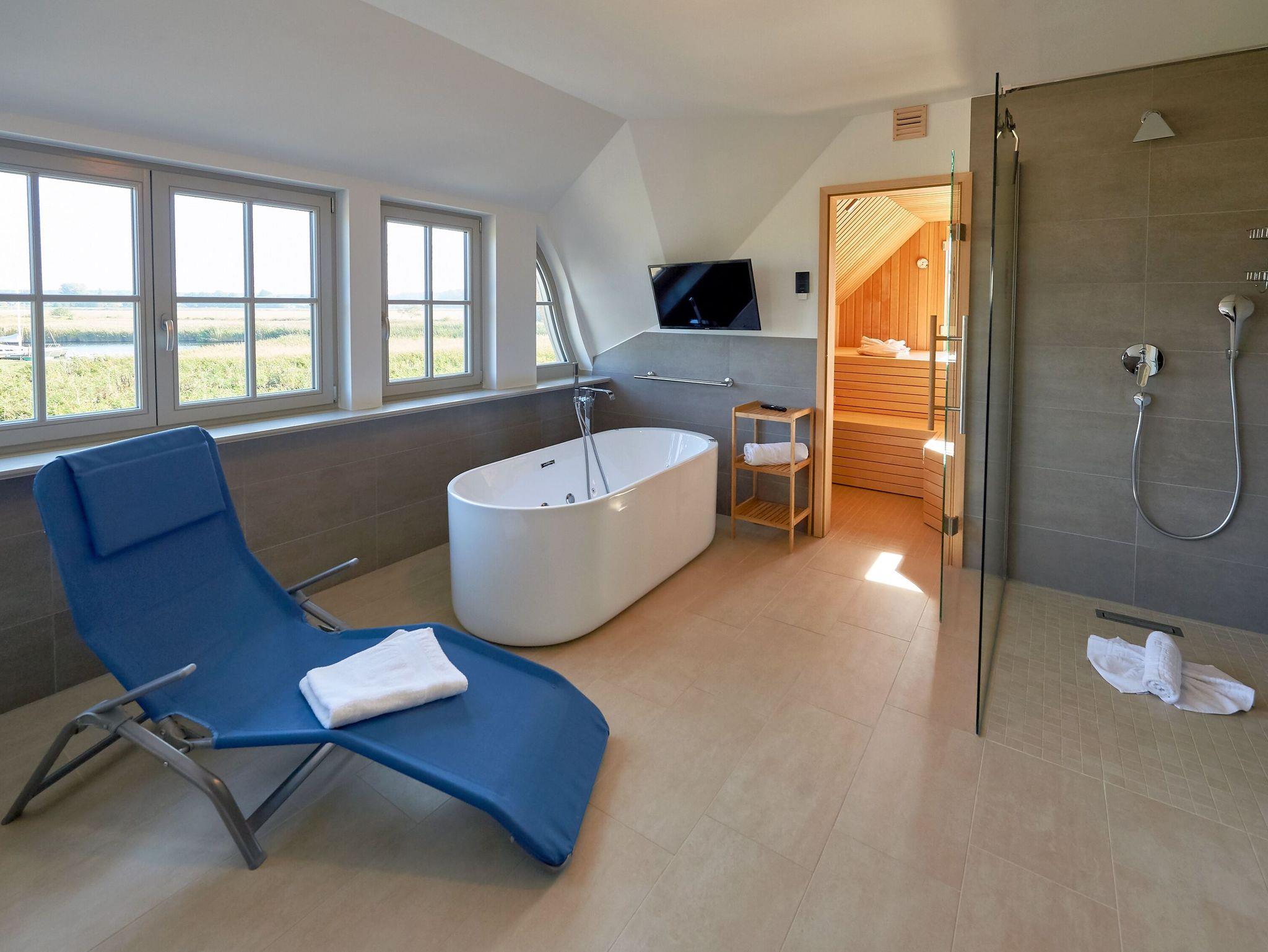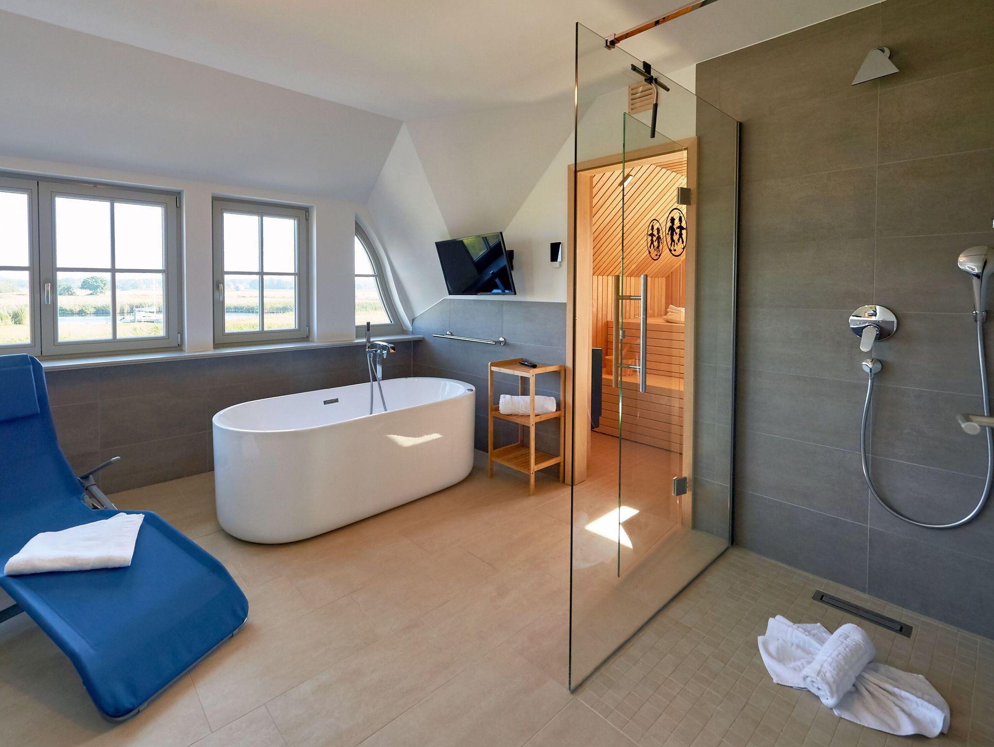 Ein paar Treppenstufen höher warten unter romantischen Dachschrägen Ihre beiden Schlafzimmer mit kuscheligen Doppelbetten (1,80 x 2,00m), eigenem Fernseher und geräumigen Kleiderschränken auf Sie. Im größeren der beiden Schlafzimmer befinden sich außerdem ein Einzelbett (90 x 2,00 m) sowie eine zusätzliche Couch. Für Begeisterung sorgt ganz sicher das Masterbad mit freistehender Whirlwanne plus Fernseher, einer ebenerdigen Dusche, einer Relaxliege und Ihrer ganz privaten Sauna. Hier lässt es sich wunderbar entspannen und genießen. Den Blick auf die traumhafte Landschaft vor dem Haus gibt´s gratis dazu.